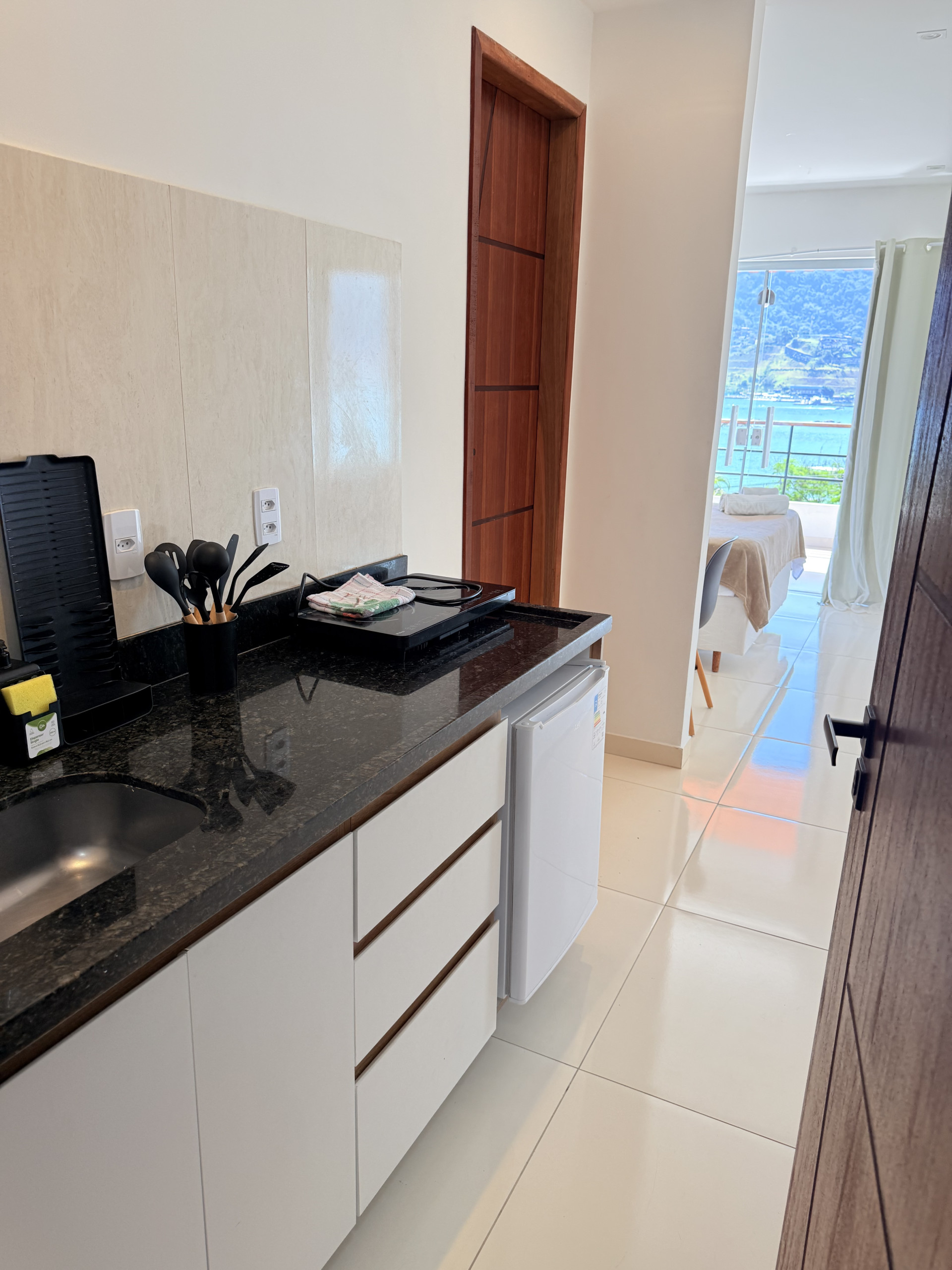 Acomodação de 18 m² mobiliado com gosto e moderno, com vistas para o mar.
