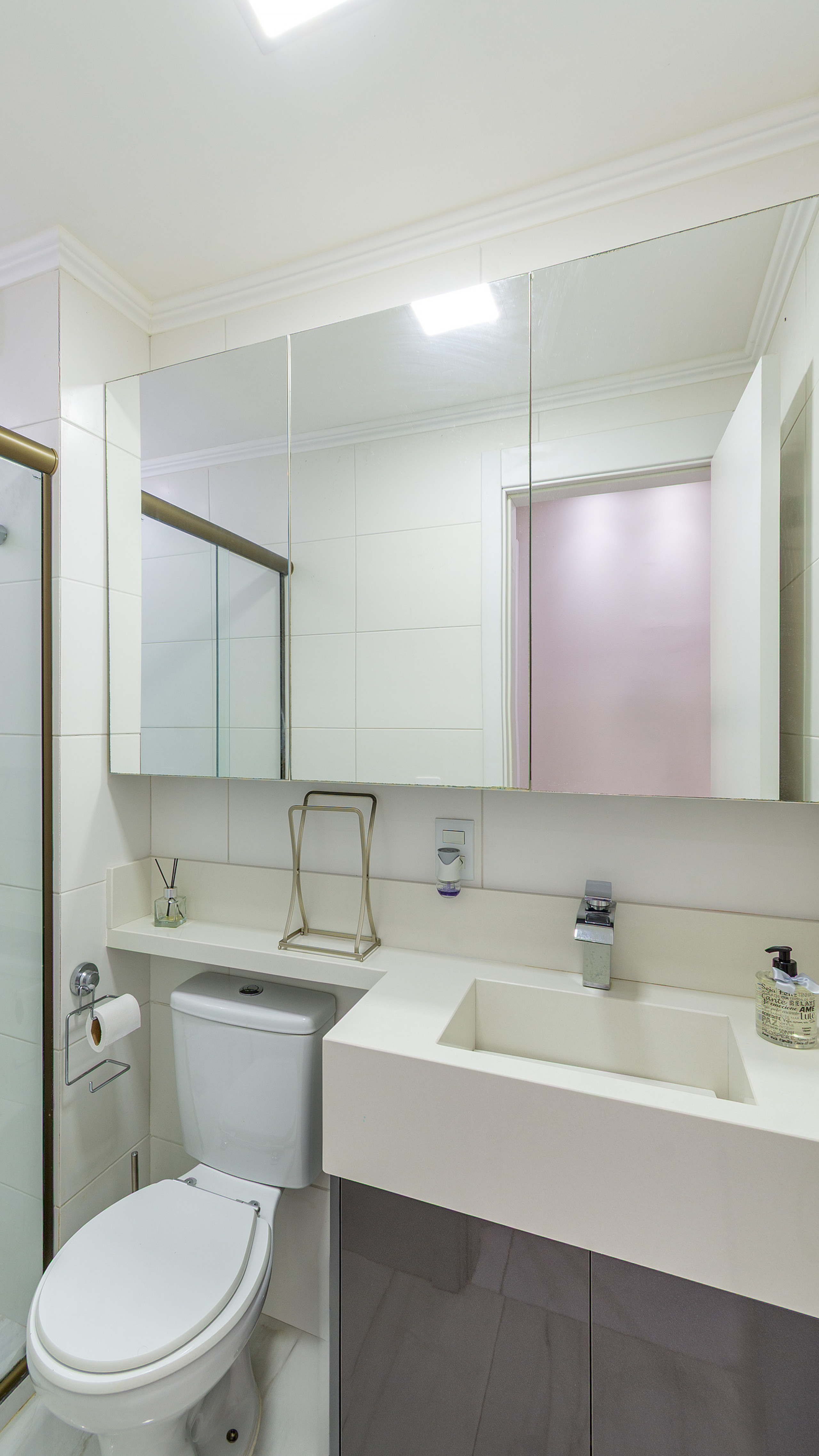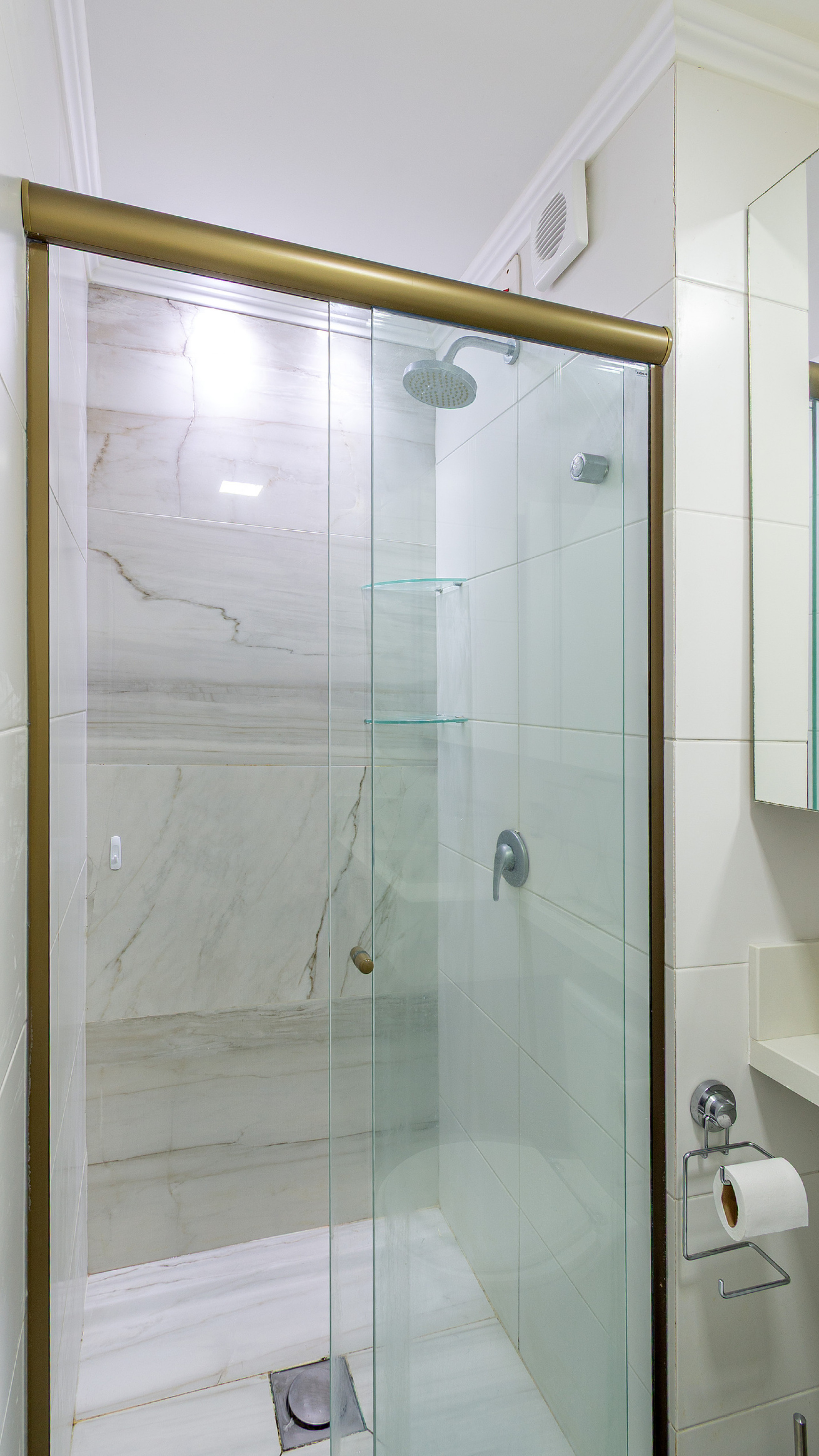 - O banheiro tem chuveiro a gás e box de vidro/acrílico