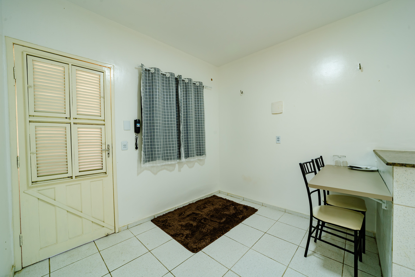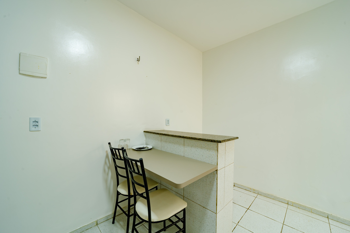 - Sala com bancada multifuncional para refeições e trabalho, e puffs