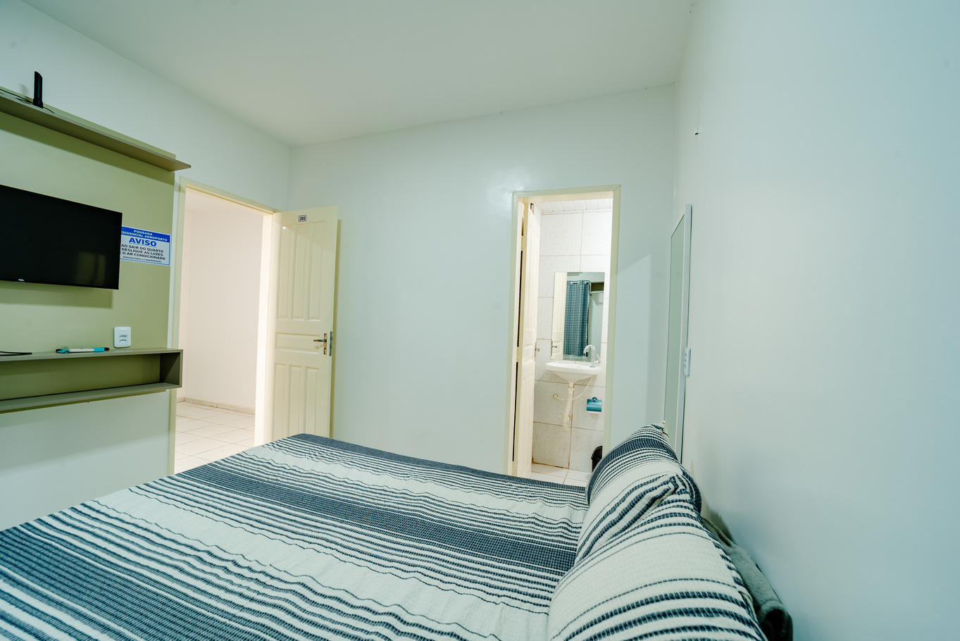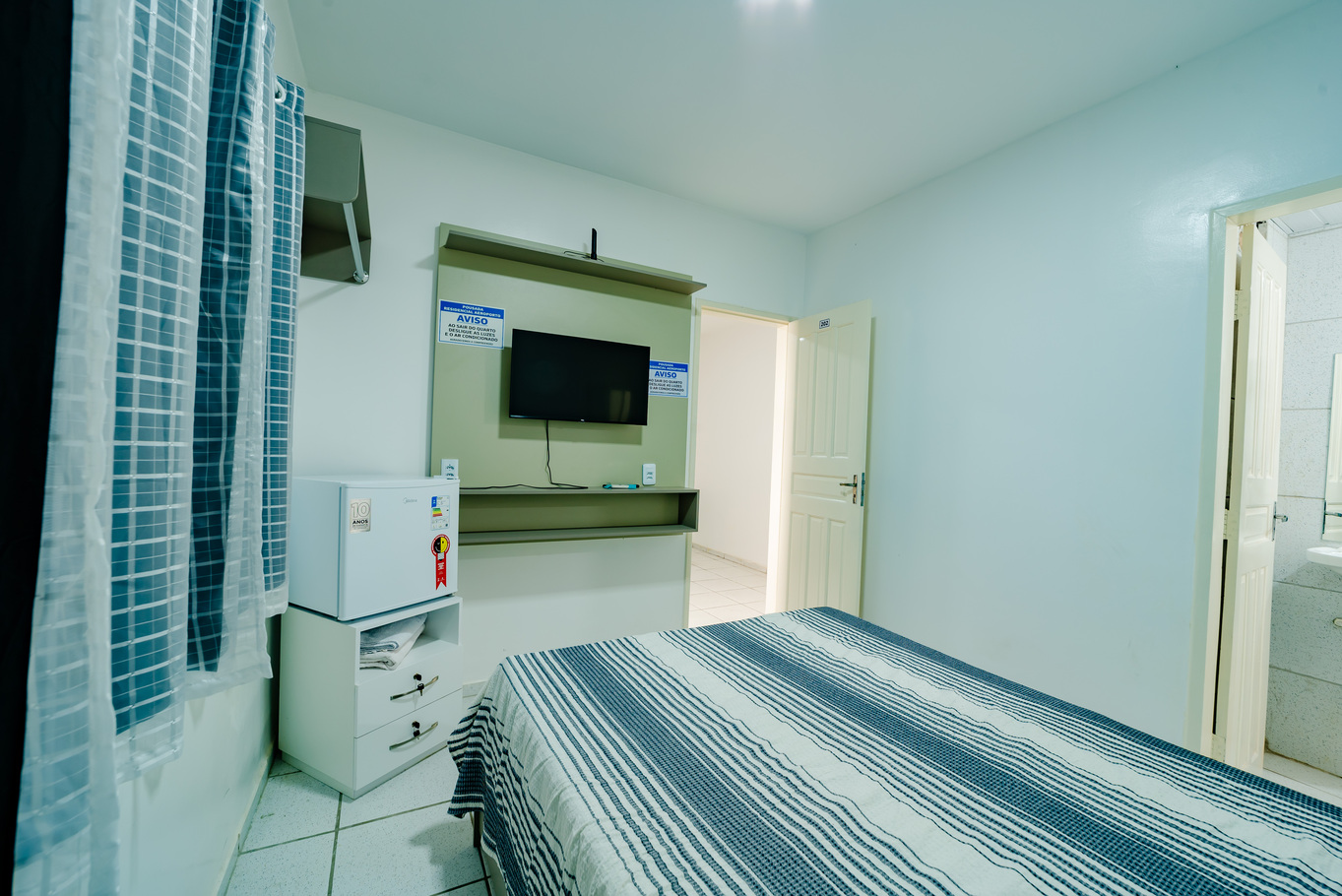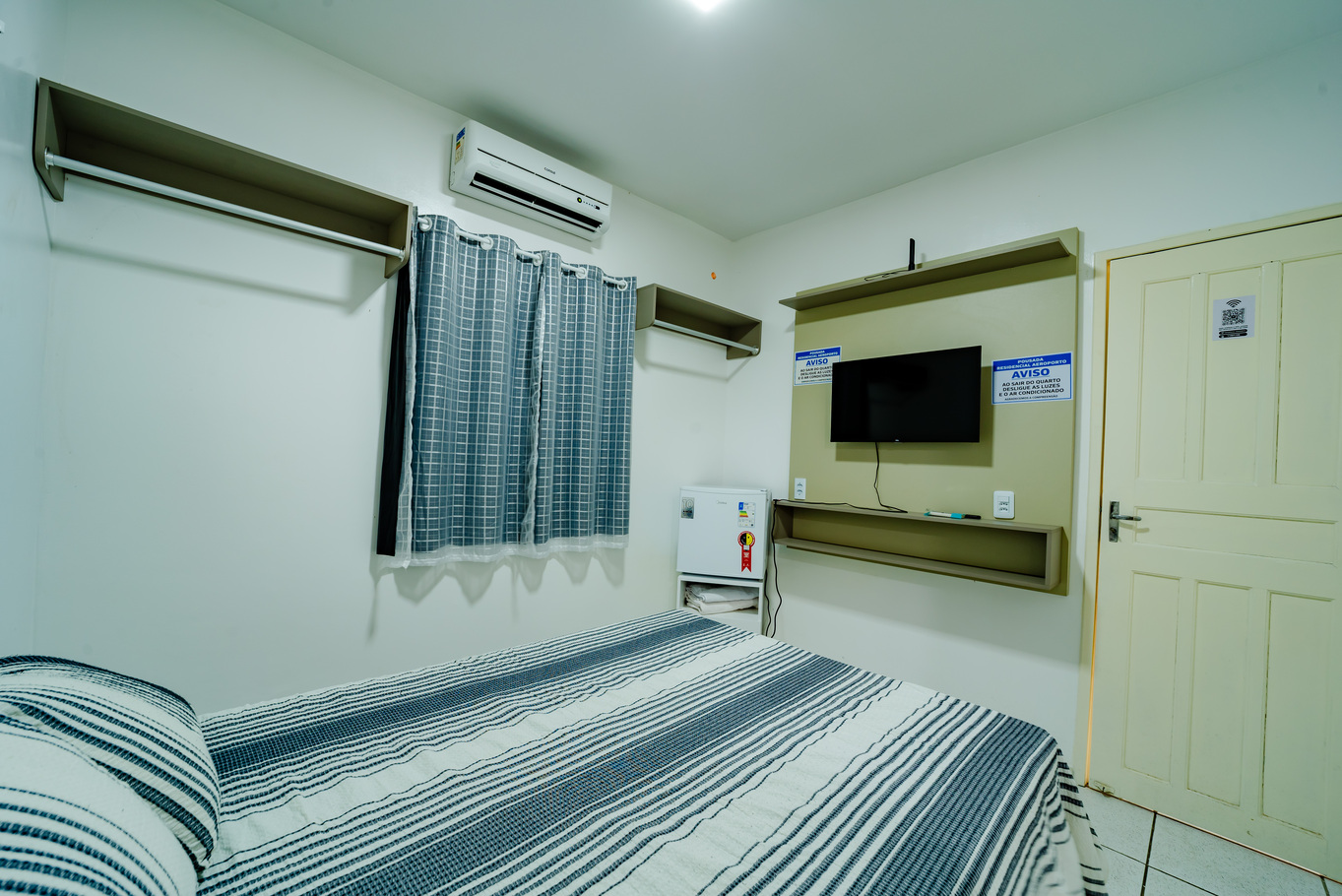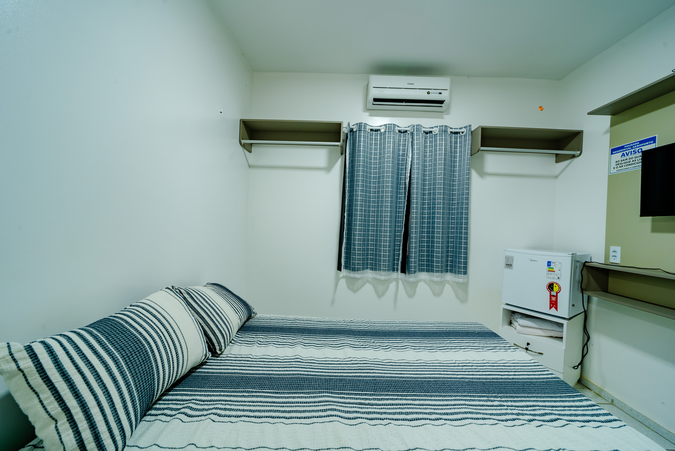 - Quarto com cama de casal, frigobar, ar-condicionado e Smart TV para seu entretenimento