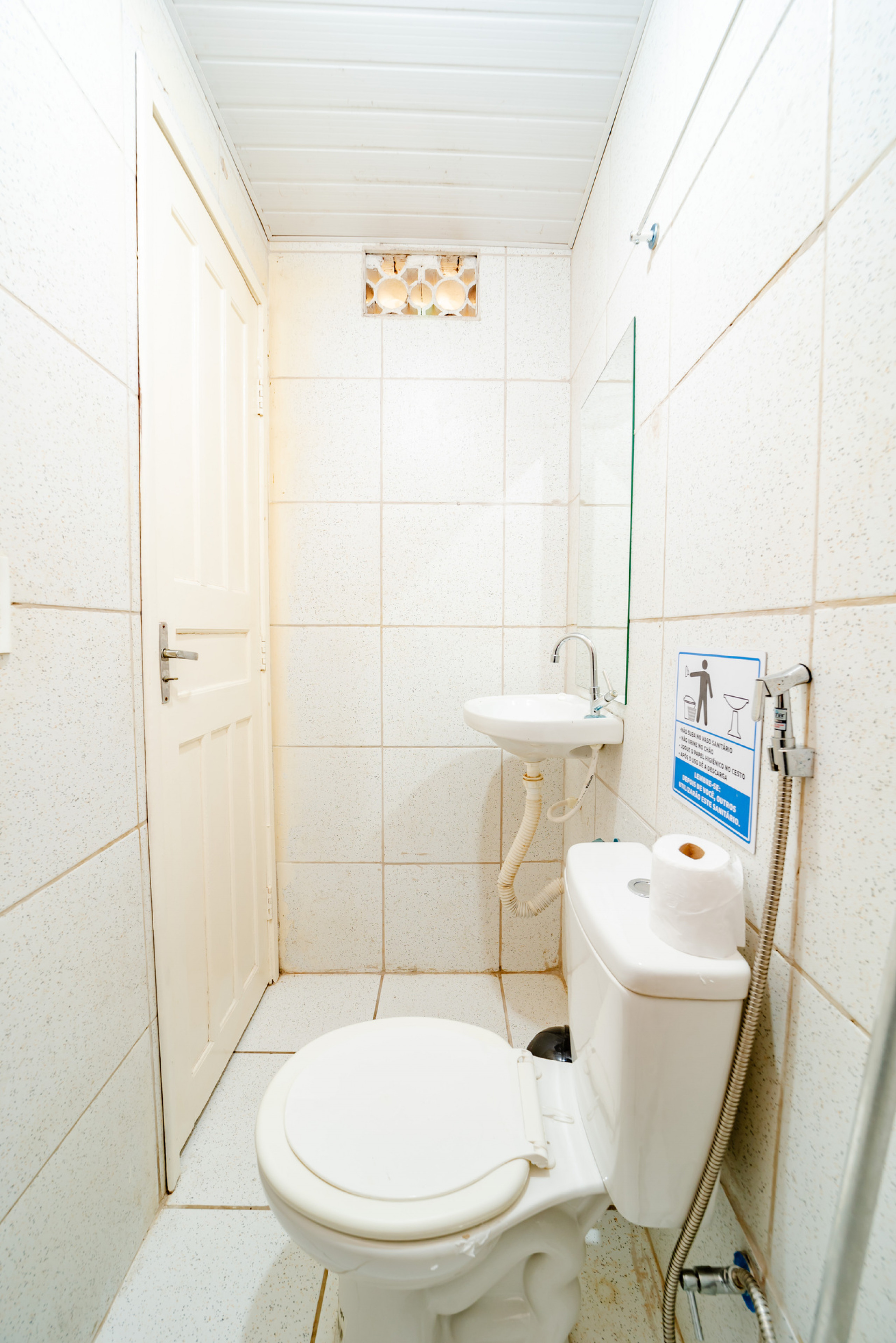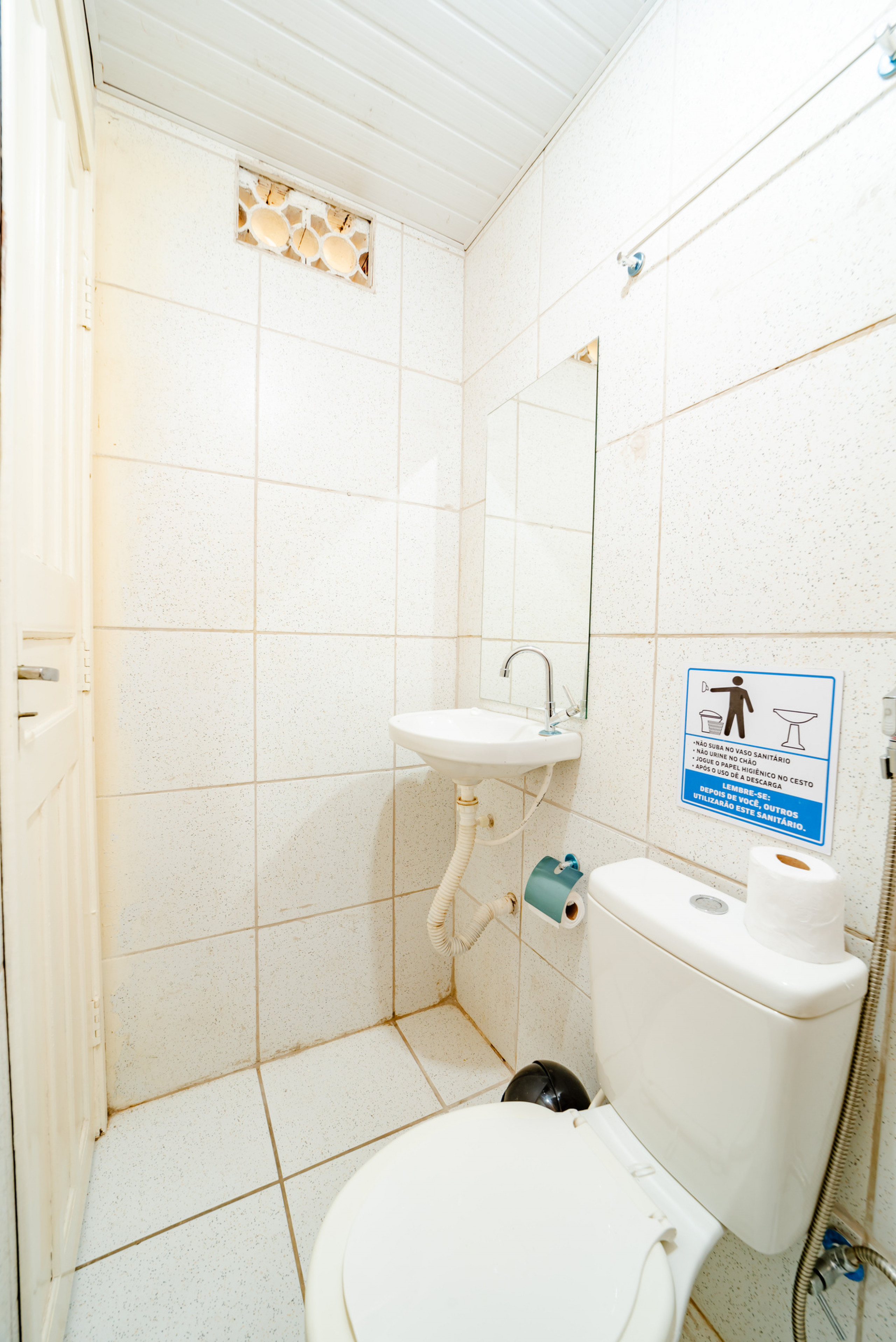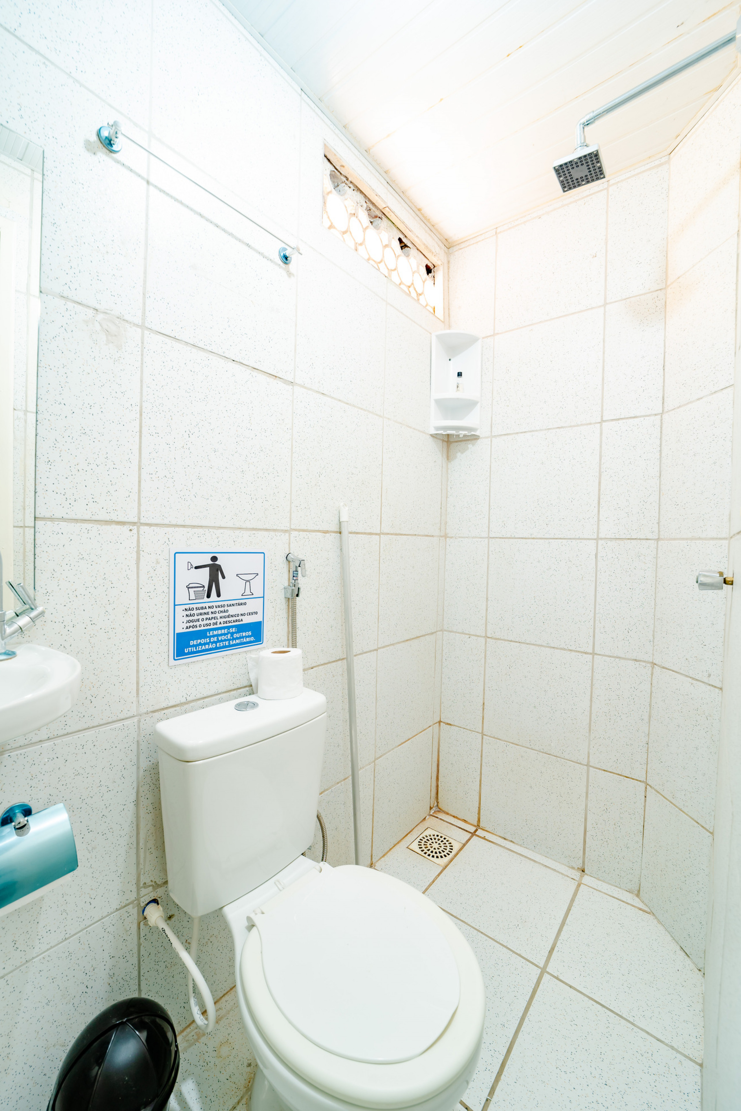 - Banheiro com chuveiro frio, pia e espelho