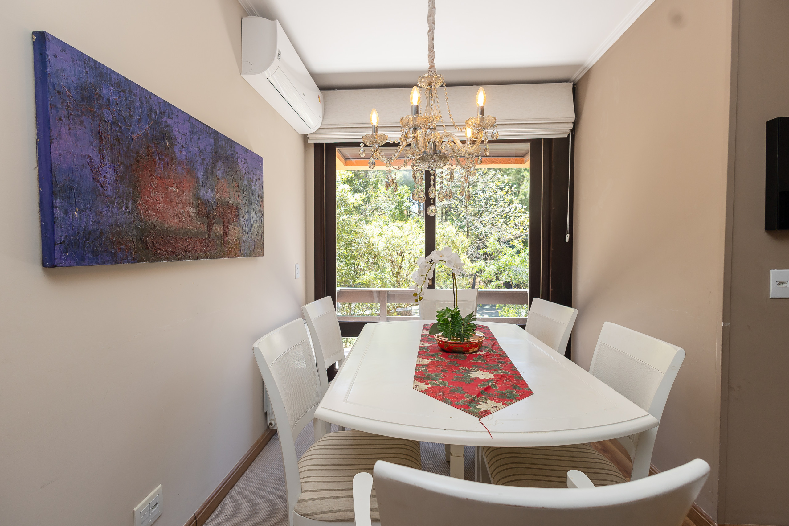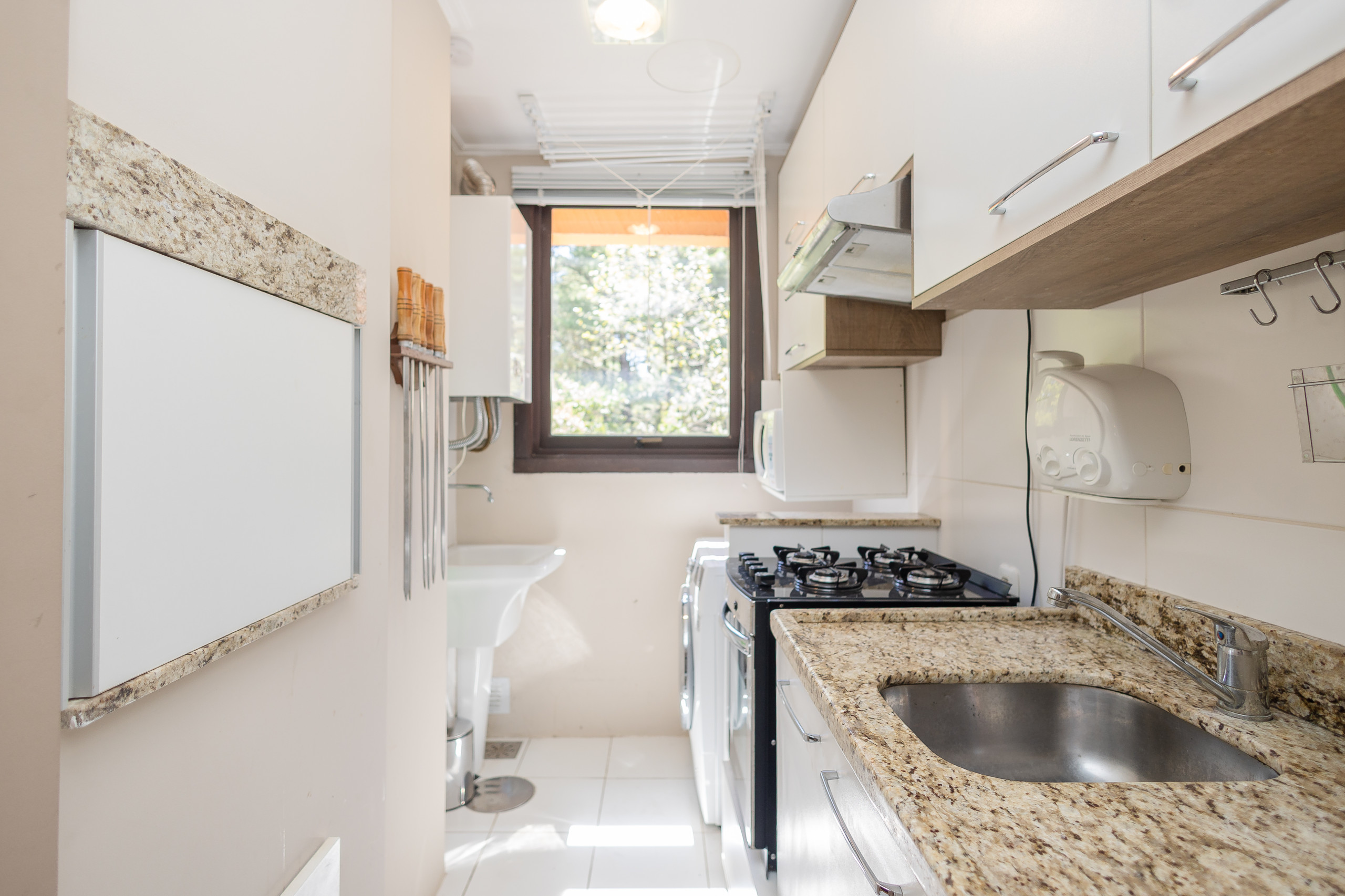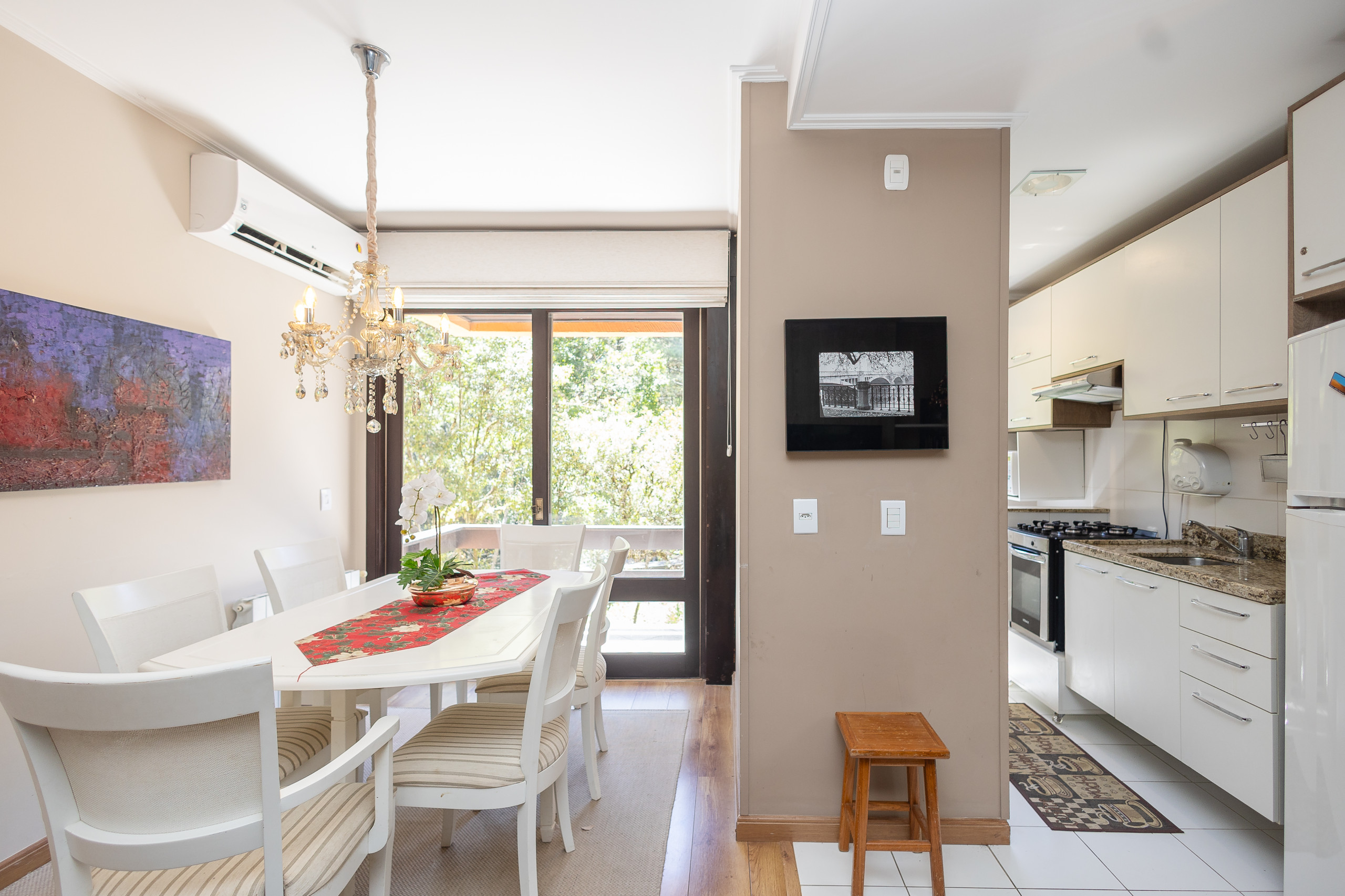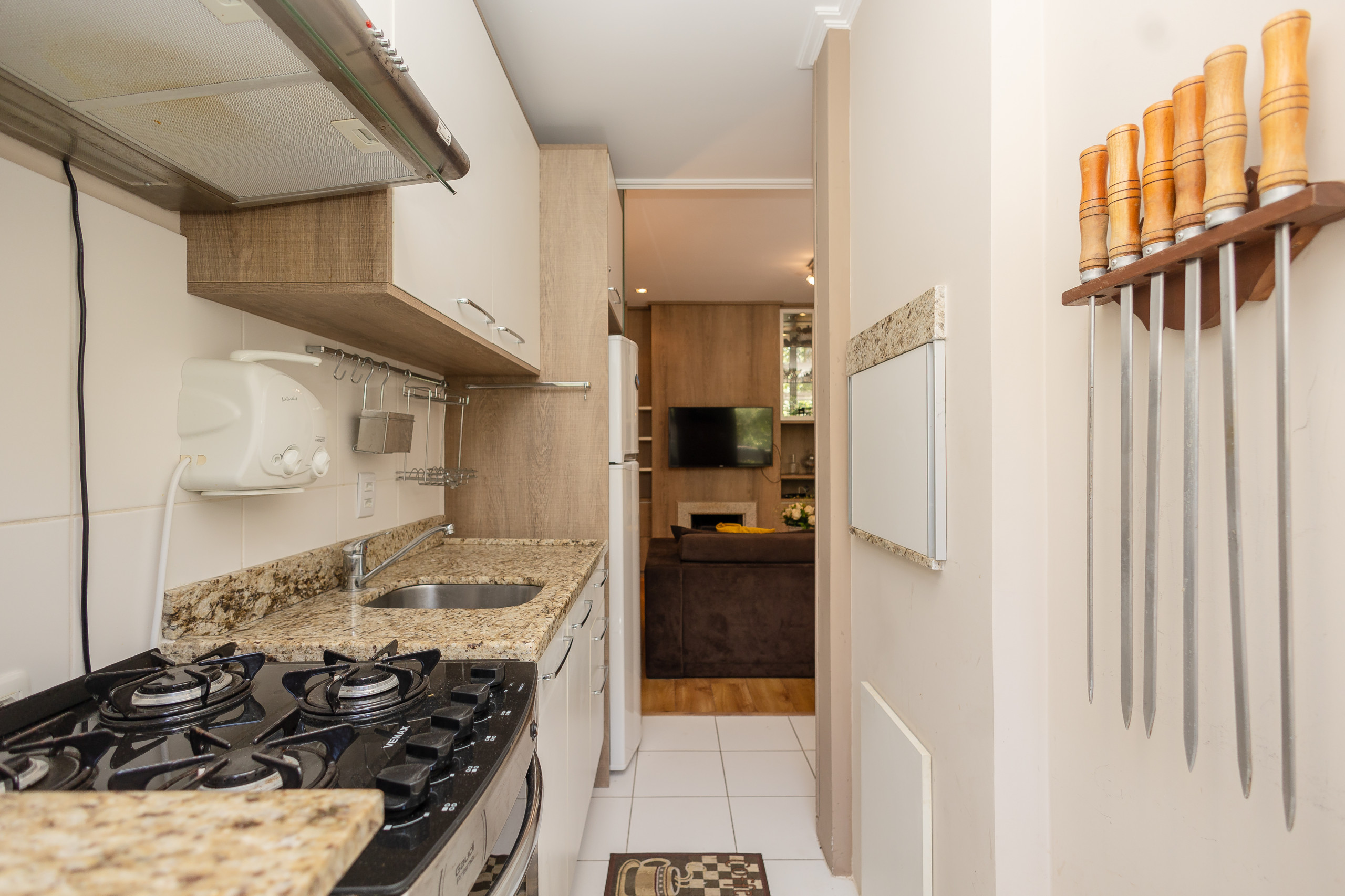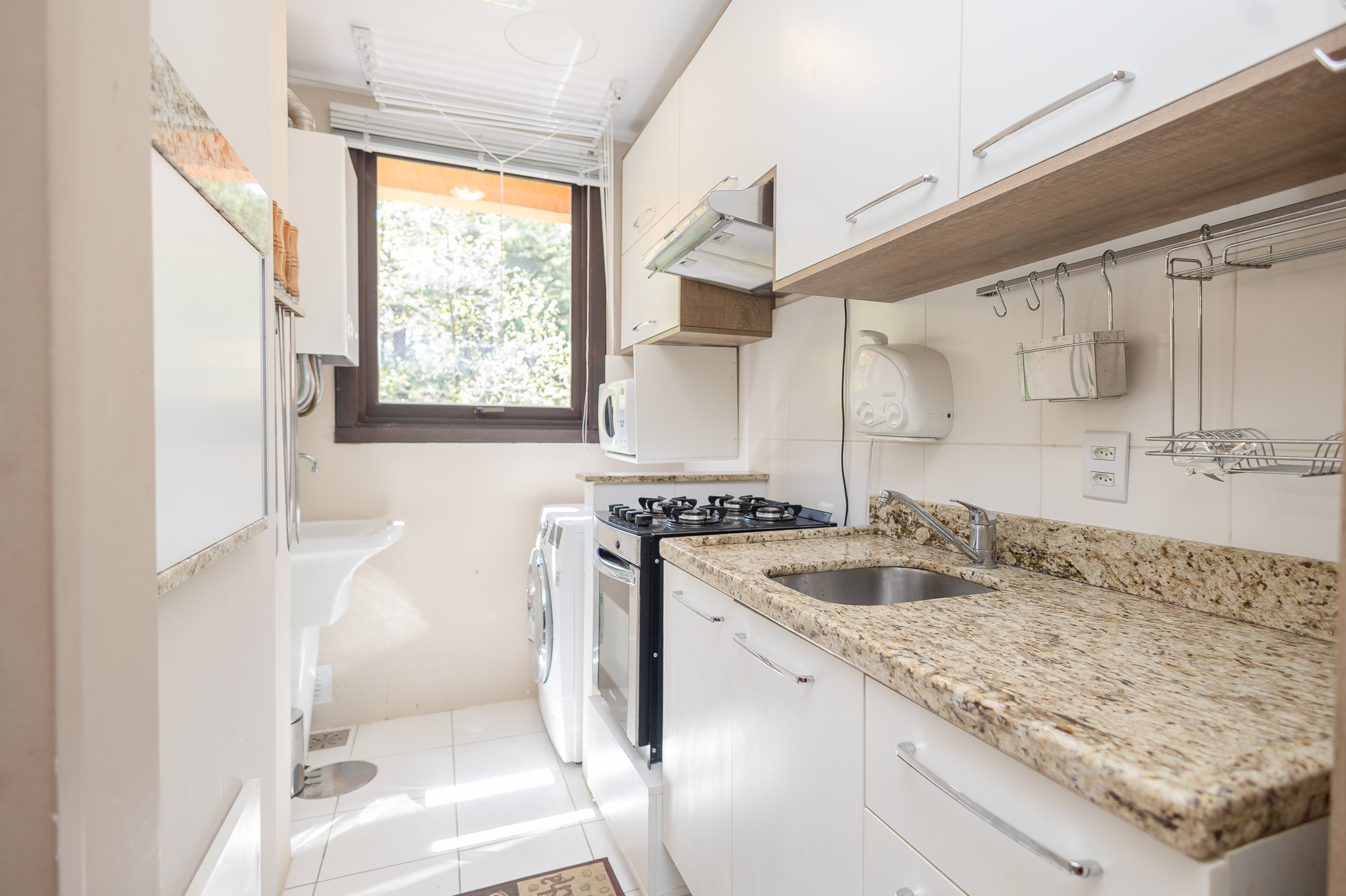 A cozinha completa conta geladeira, cafeteira, sanduicheira, micro-ondas, forno e fogão. À mesa, poderão sentar-se até 06 hospedes para refeições ou para simplesmente apreciar um chocolate quente ou um vinho. O apartamento ainda dispõe de lavanderia com lava e seca.