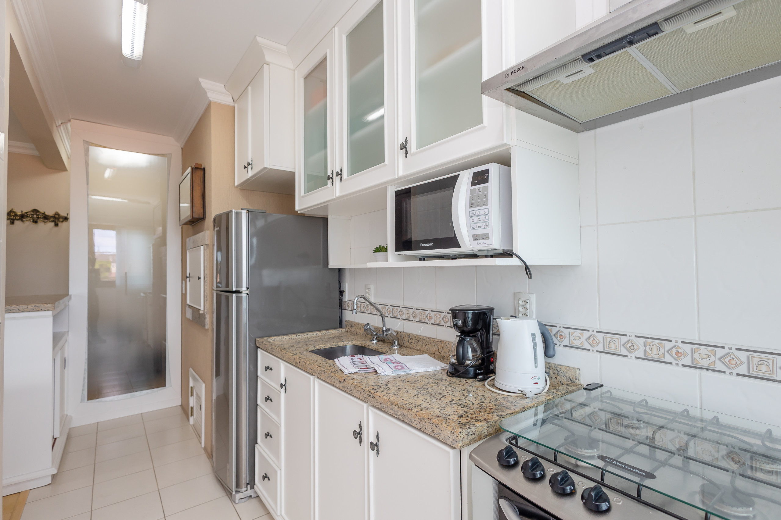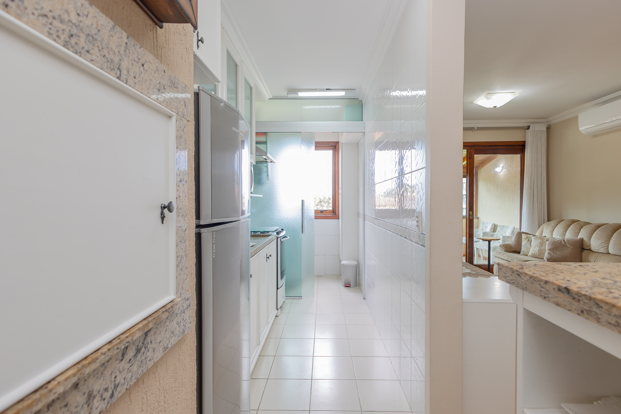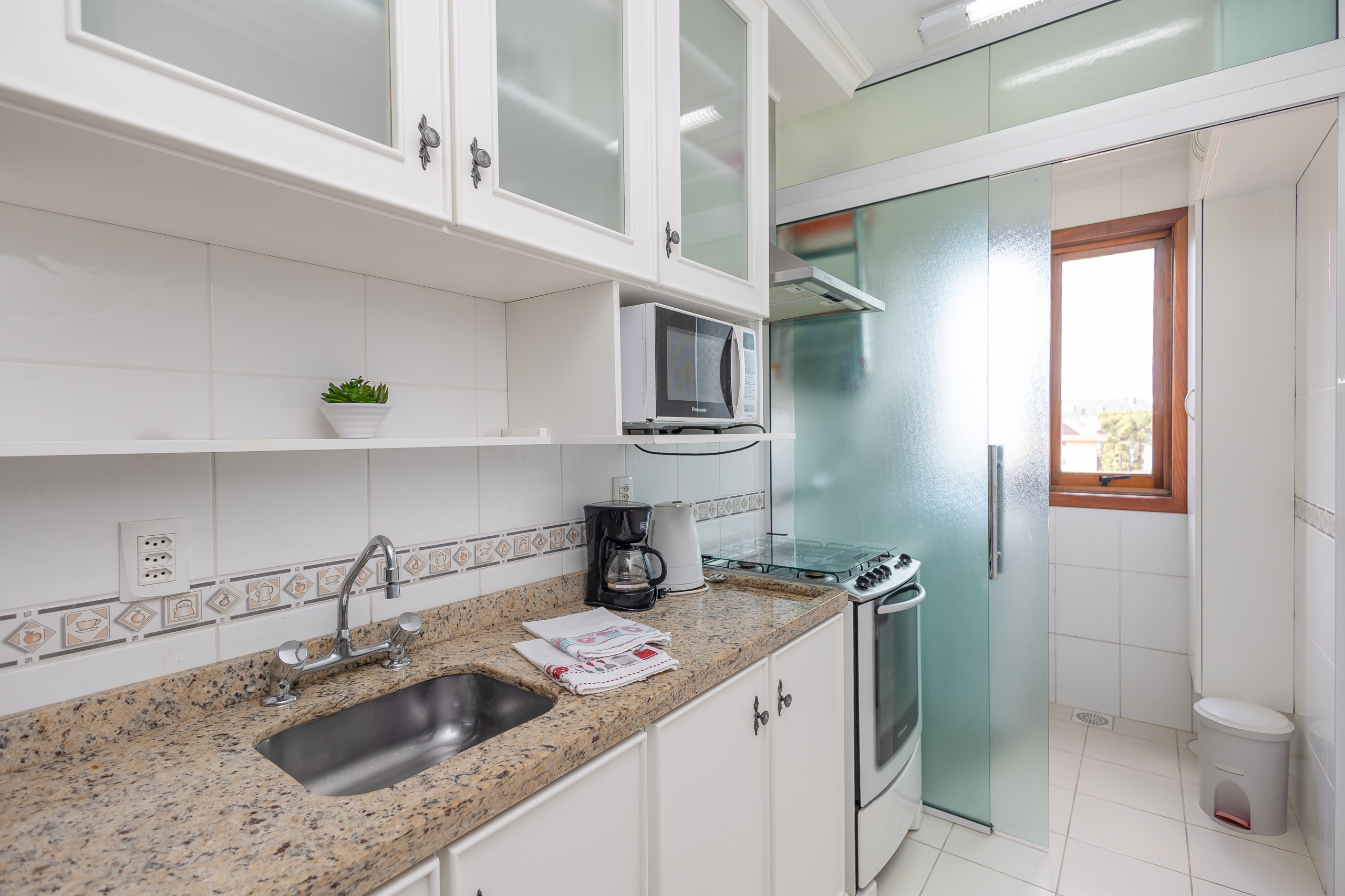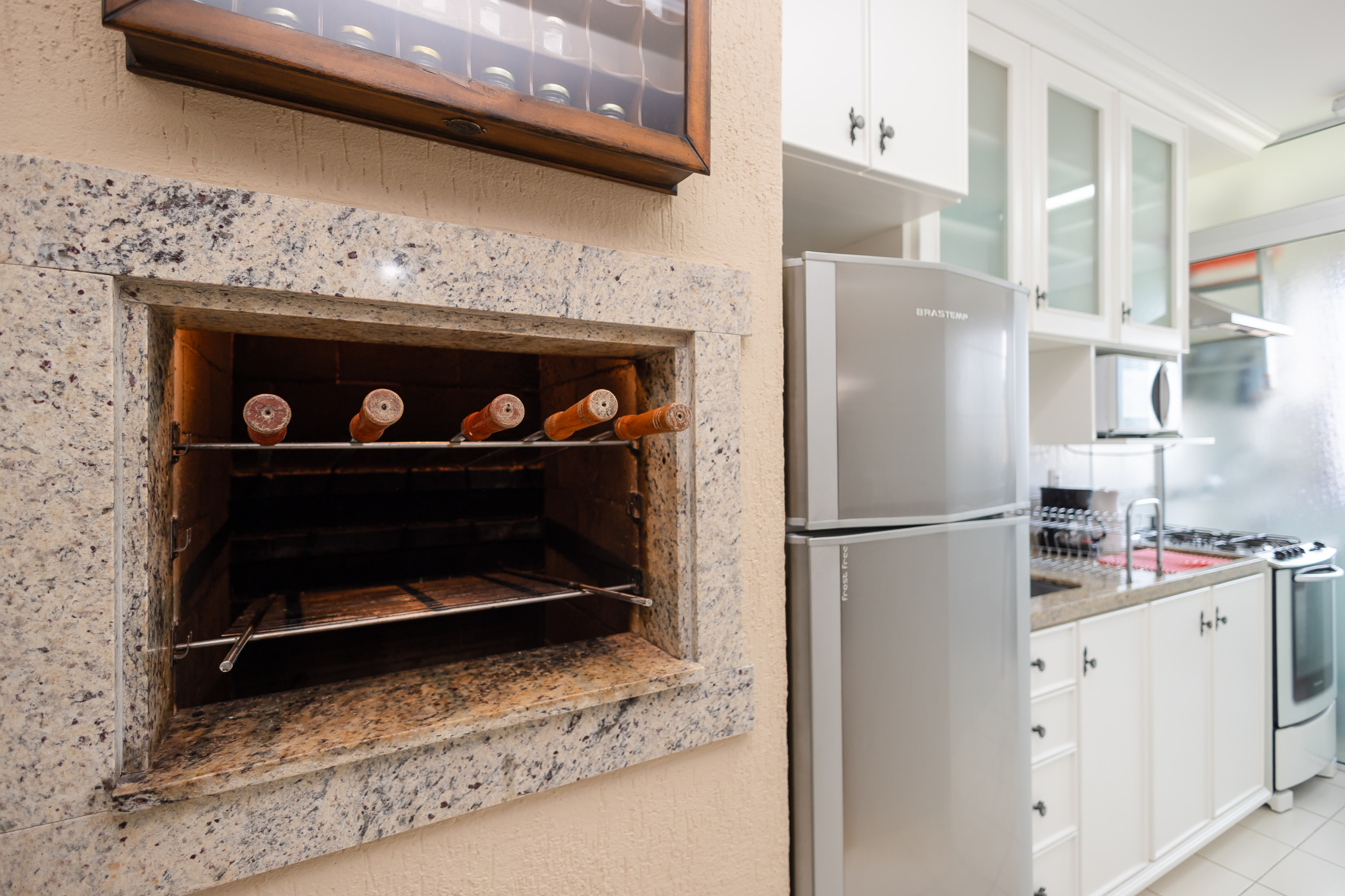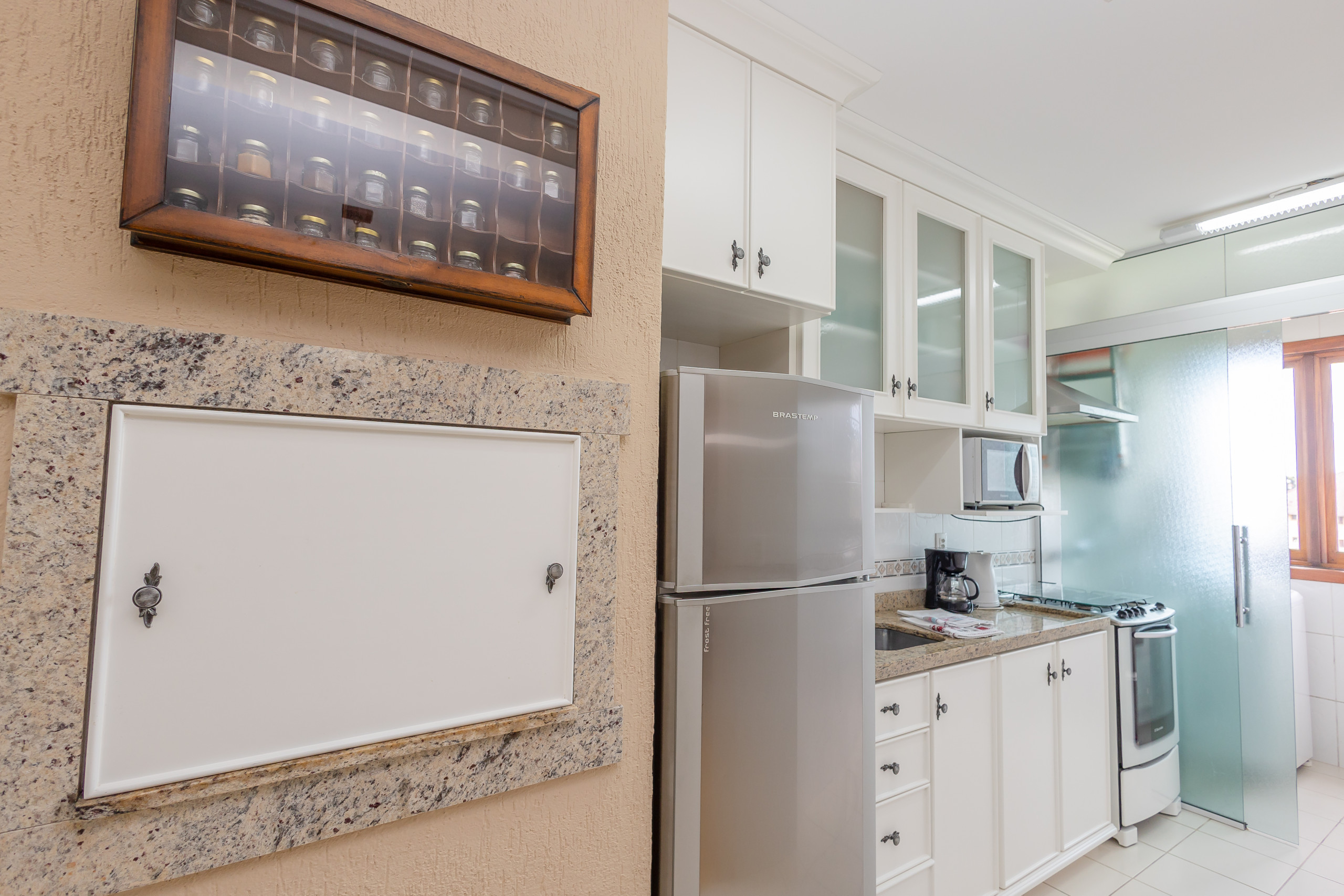 A cozinha completa conta com churrasqueira, geladeira, cafeteira, sanduicheira, micro-ondas, forno e fogão. À mesa, poderão sentar-se até 06 hospedes para refeições ou para simplesmente apreciar um chocolate quente. O apartamento ainda dispõe de lavanderia com tanque e bancada com mais dois assentos.