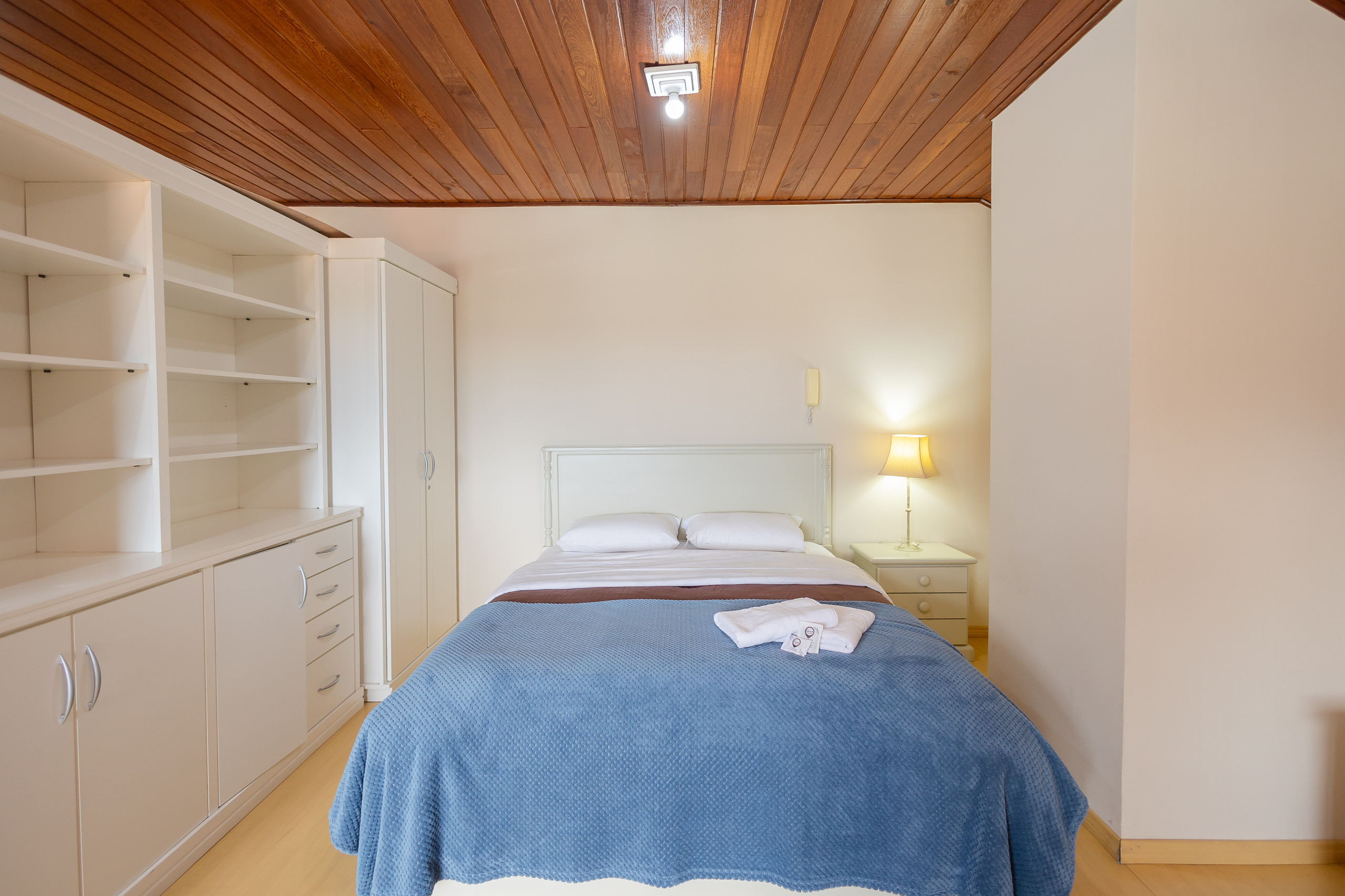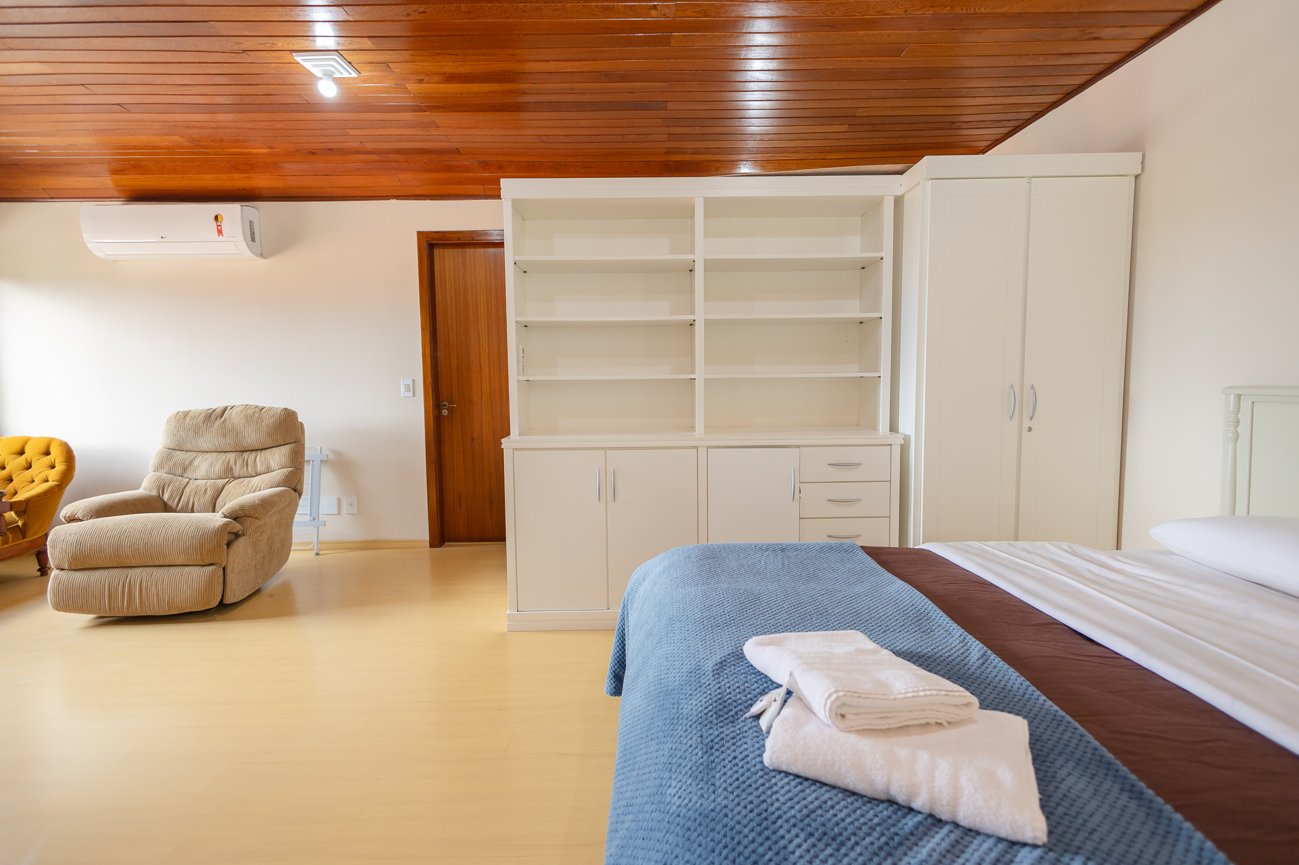 Na área íntima do andar principal há uma suíte, um quarto e um banheiro social completo. No andar superior há um grande quarto com banheiro completo e cama queen e dois colchões avulsos de solteiro. Todos os quartos dispõem de split Q/F e blackout que trarão aconchego.