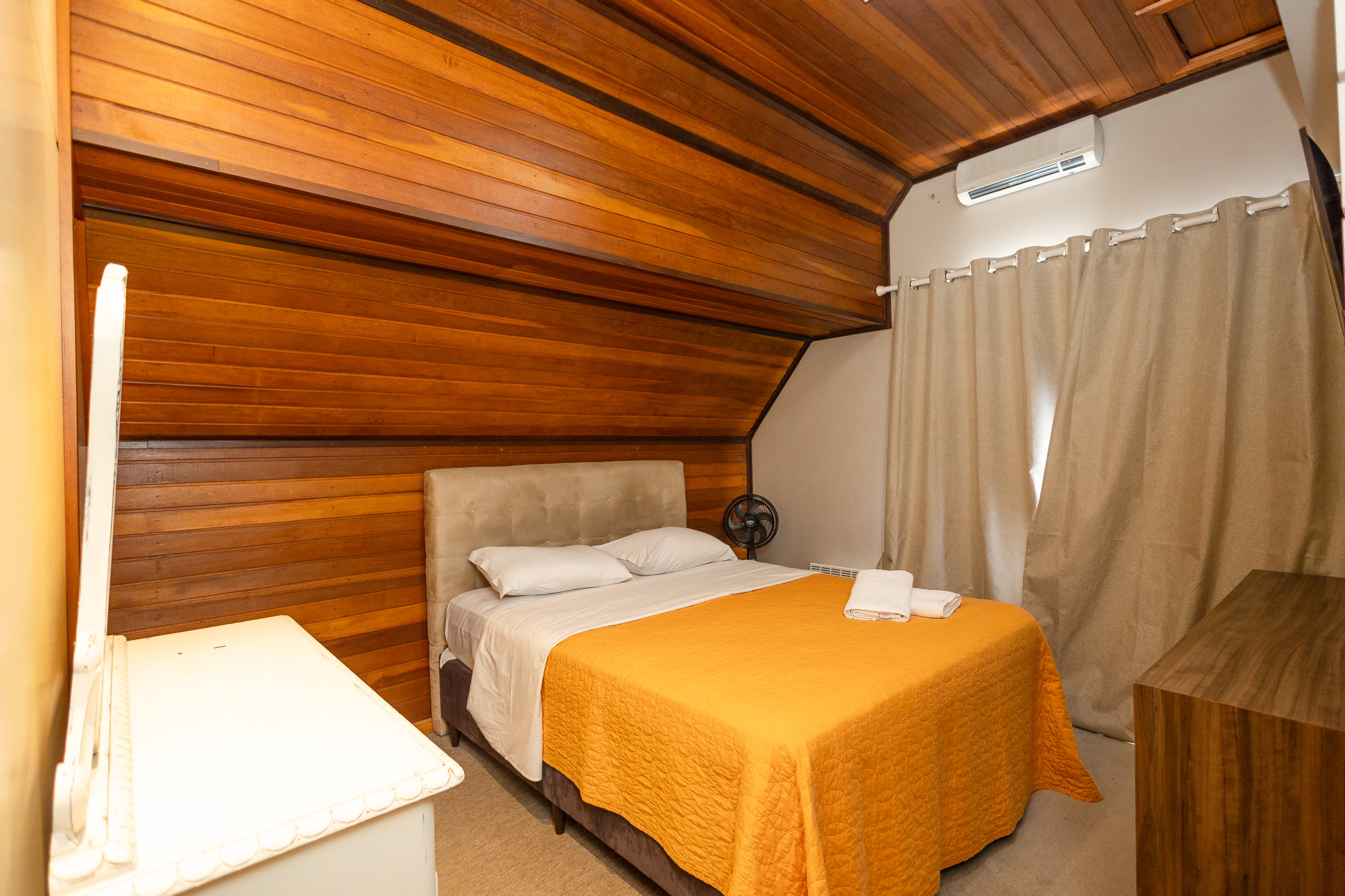 O apartamento é um duplex e dispõe no andar principal de um quarto com cama de casal, um banheiro completo, cozinha equipada com tanque, living com dois ambientes (estar e jantar, com churrasqueira e lareira). No andar superior há uma suíte com closet e sacada! Ainda conta com garagem coberta, internet de alta velocidade e enxoval completo!
