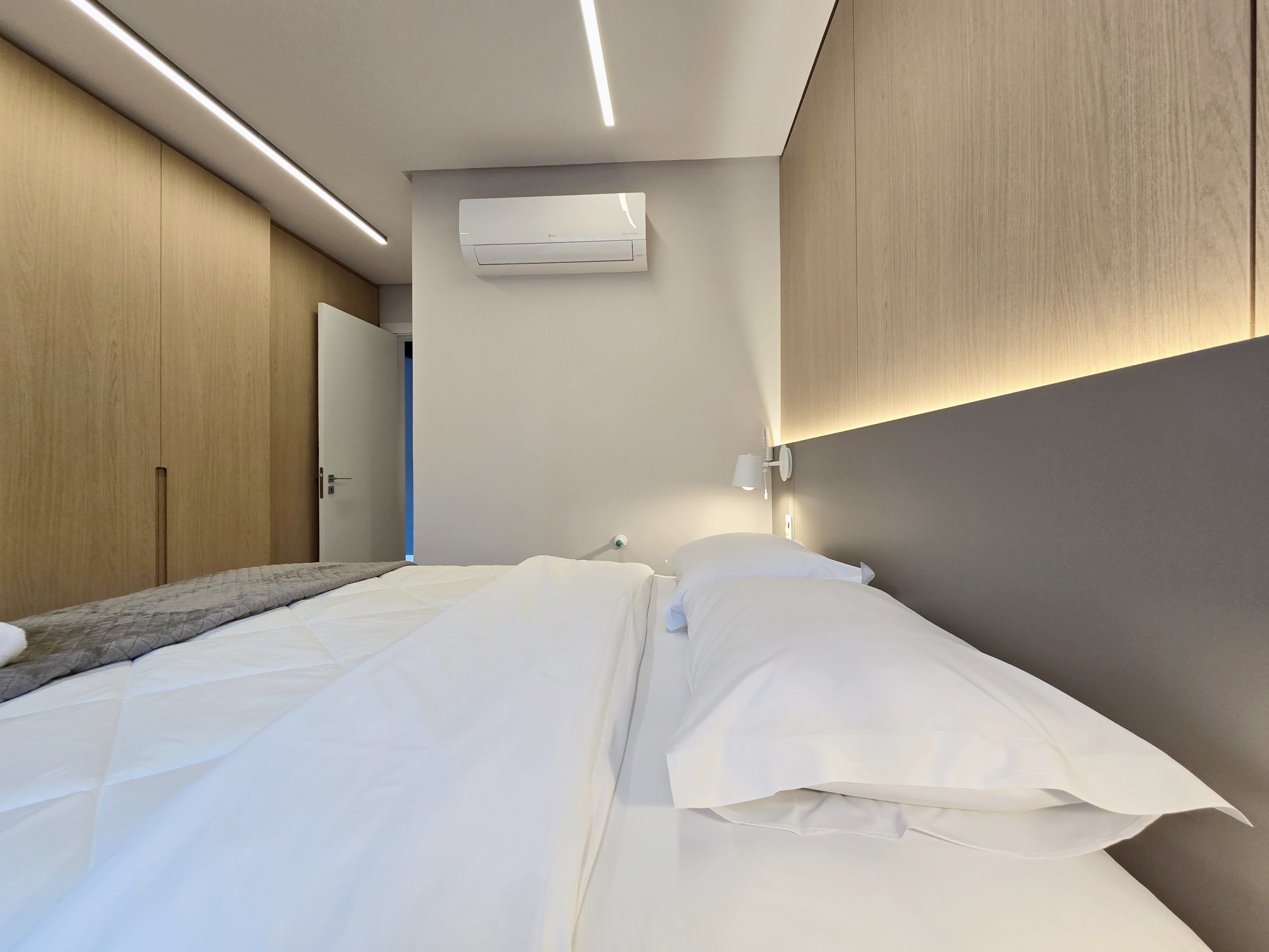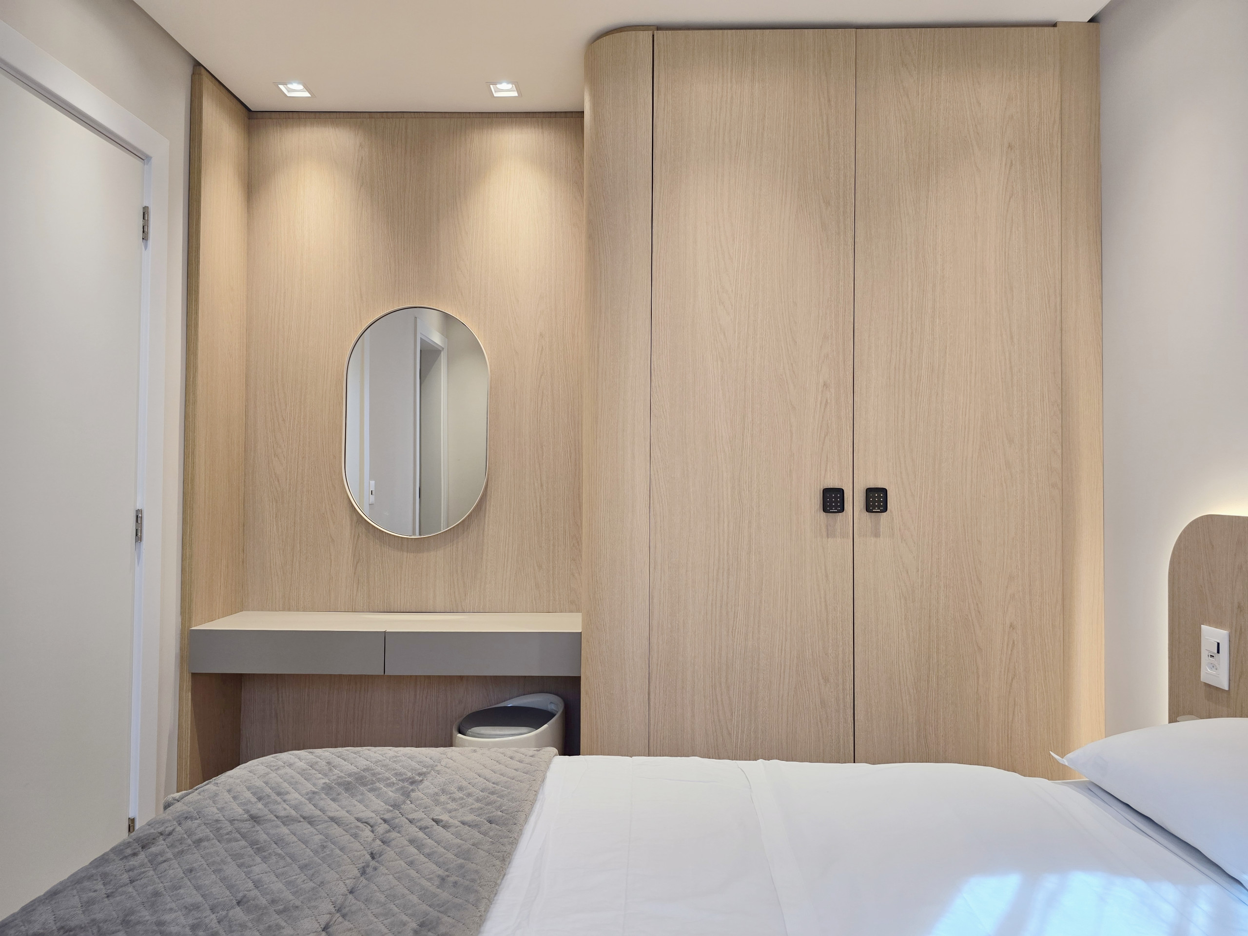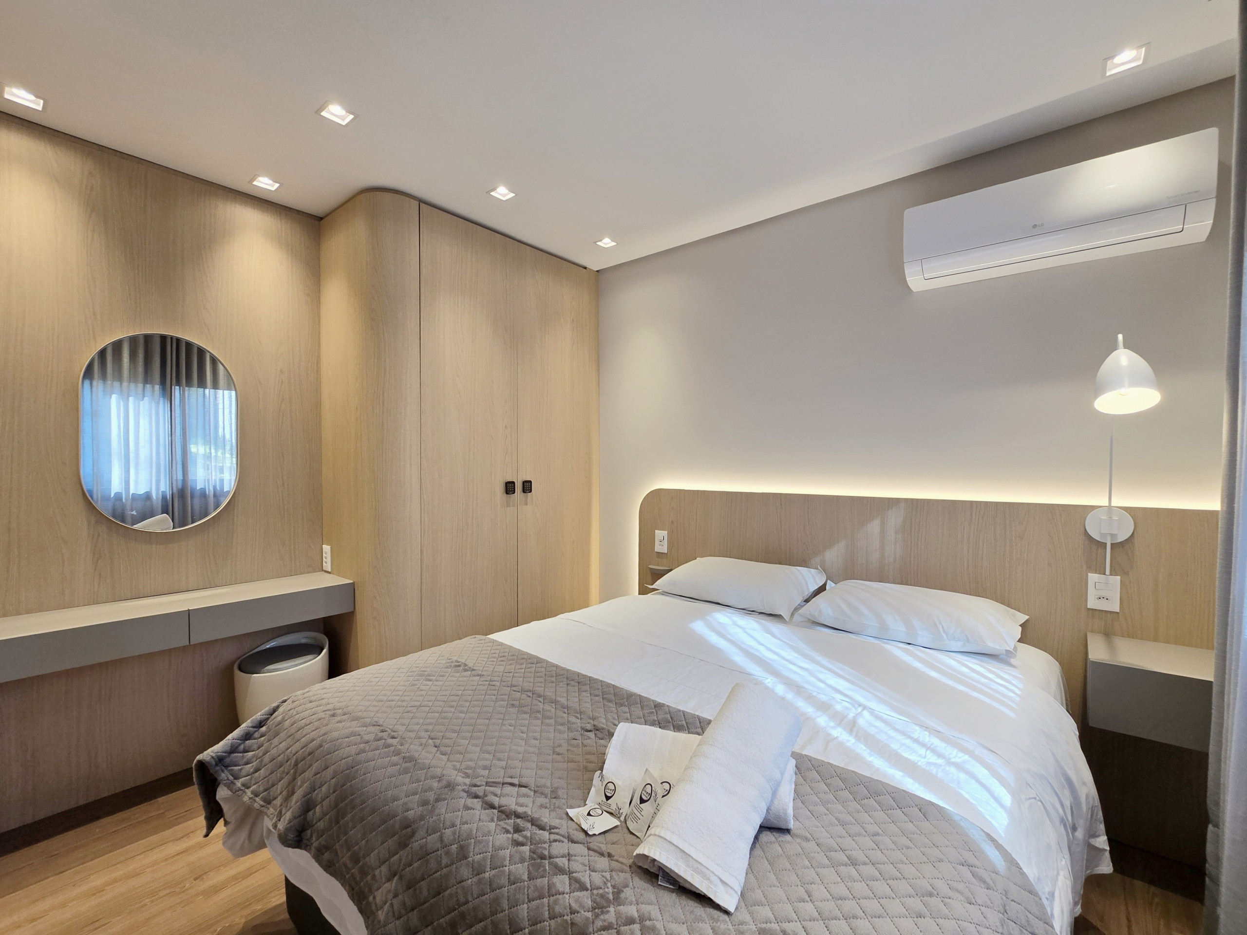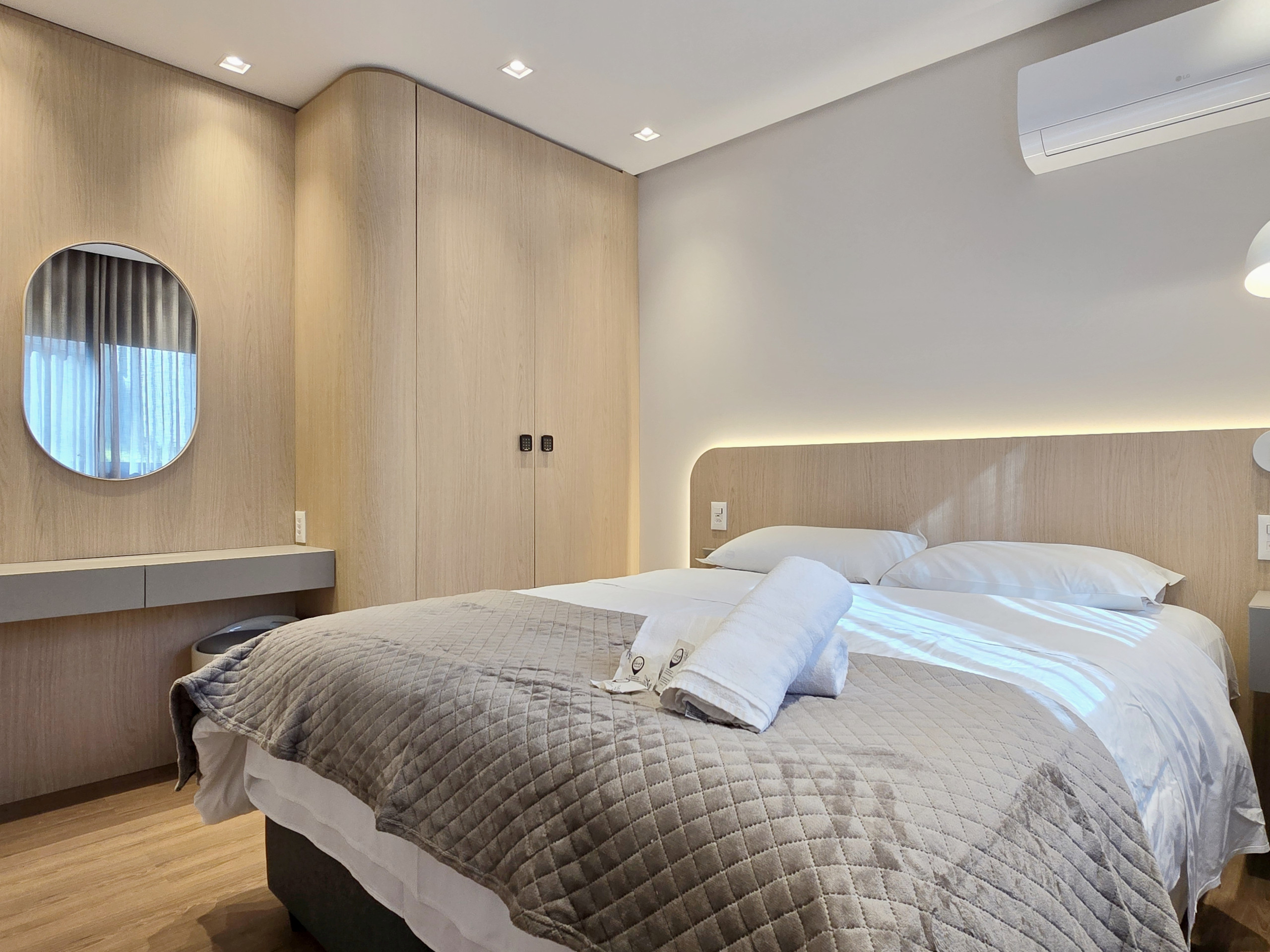 Na área íntima encontramos duas suítes, cada uma com split Q/f, persianas blackout e cortinas que trazem aconchego. Uma das suítes conta com cama queen e a outra suíte conta uma cama de casal.