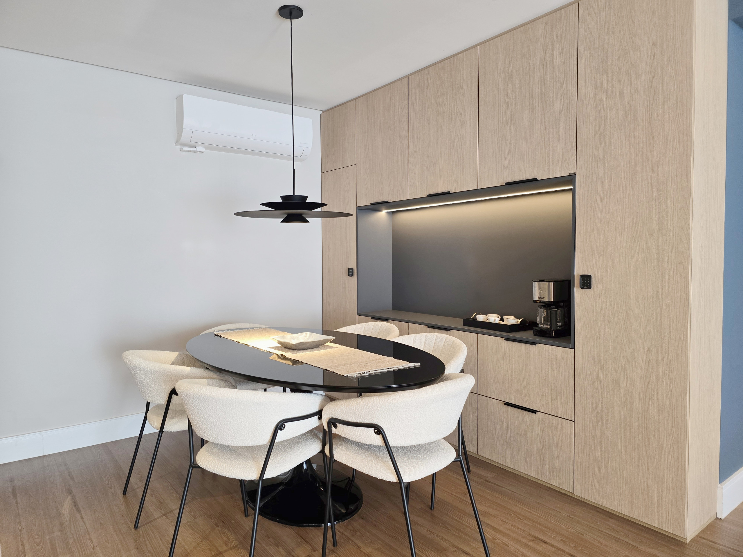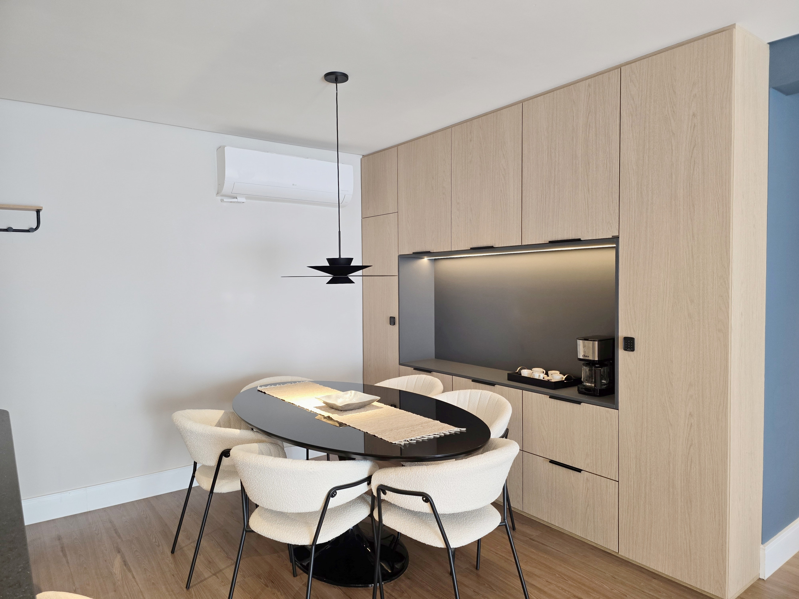 A cozinha completa conta com lava louças, churrasqueira, geladeira, cafeteira, sanduicheira, micro-ondas, liquidificador e fogão com forno. À mesa, poderão sentar-se até 06 hospedes para refeições ou para simplesmente apreciar um chocolate quente ou um vinho. O apartamento ainda dispõe de lavanderia com lava e seca.