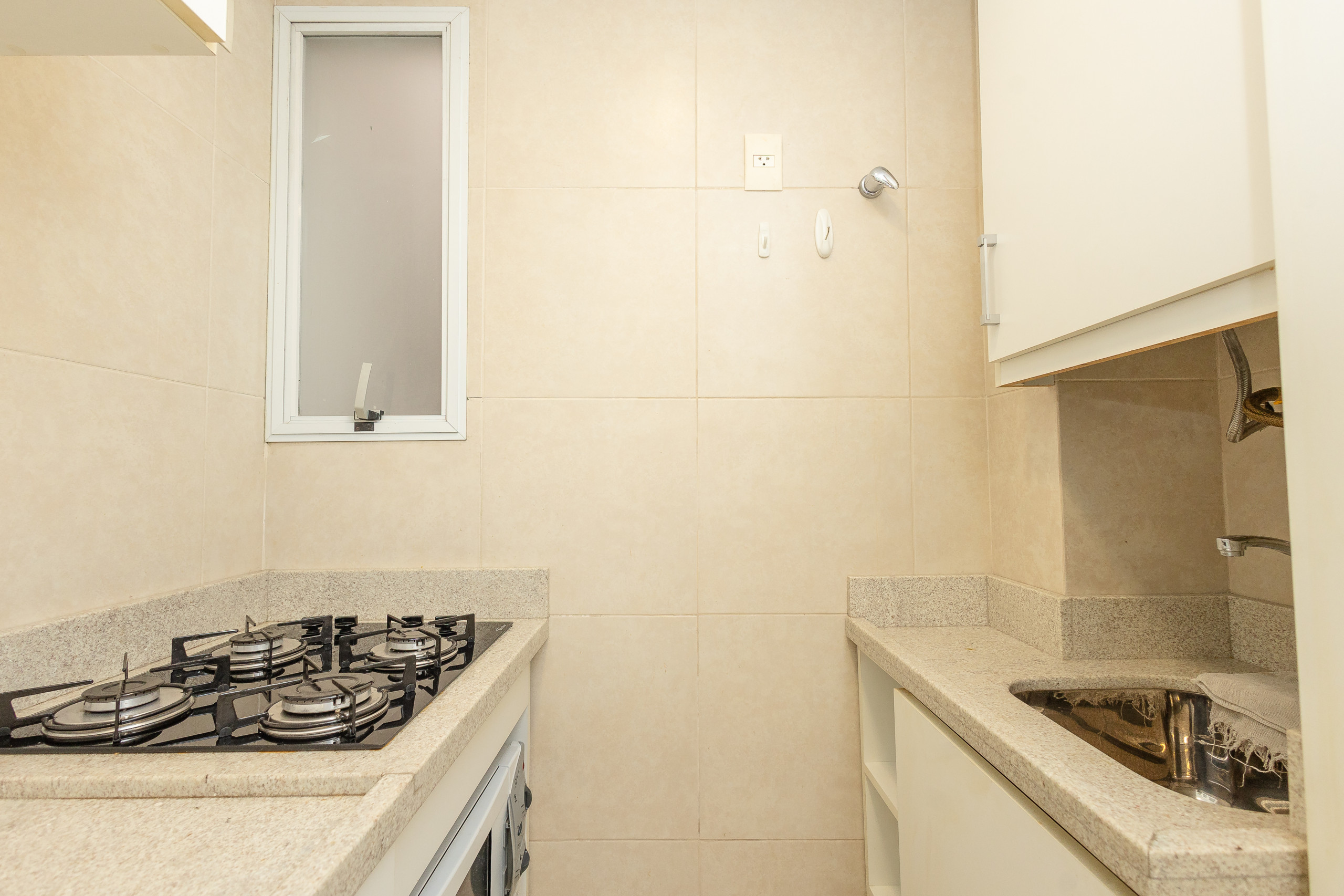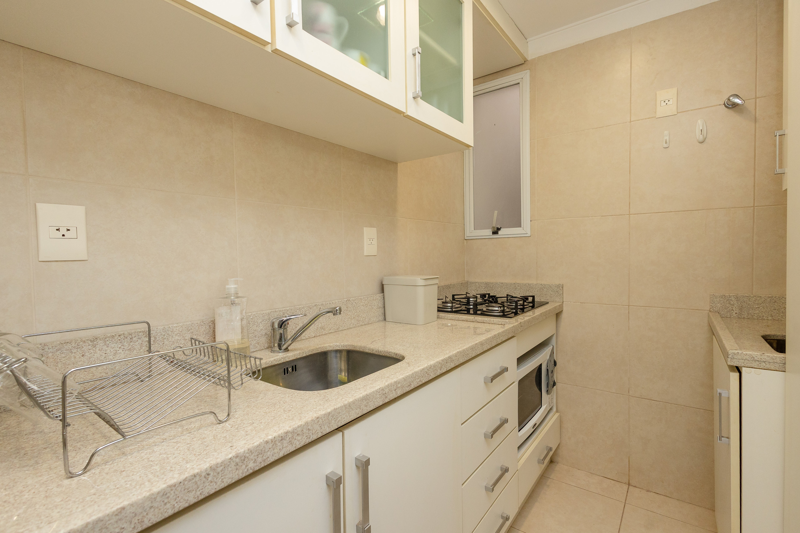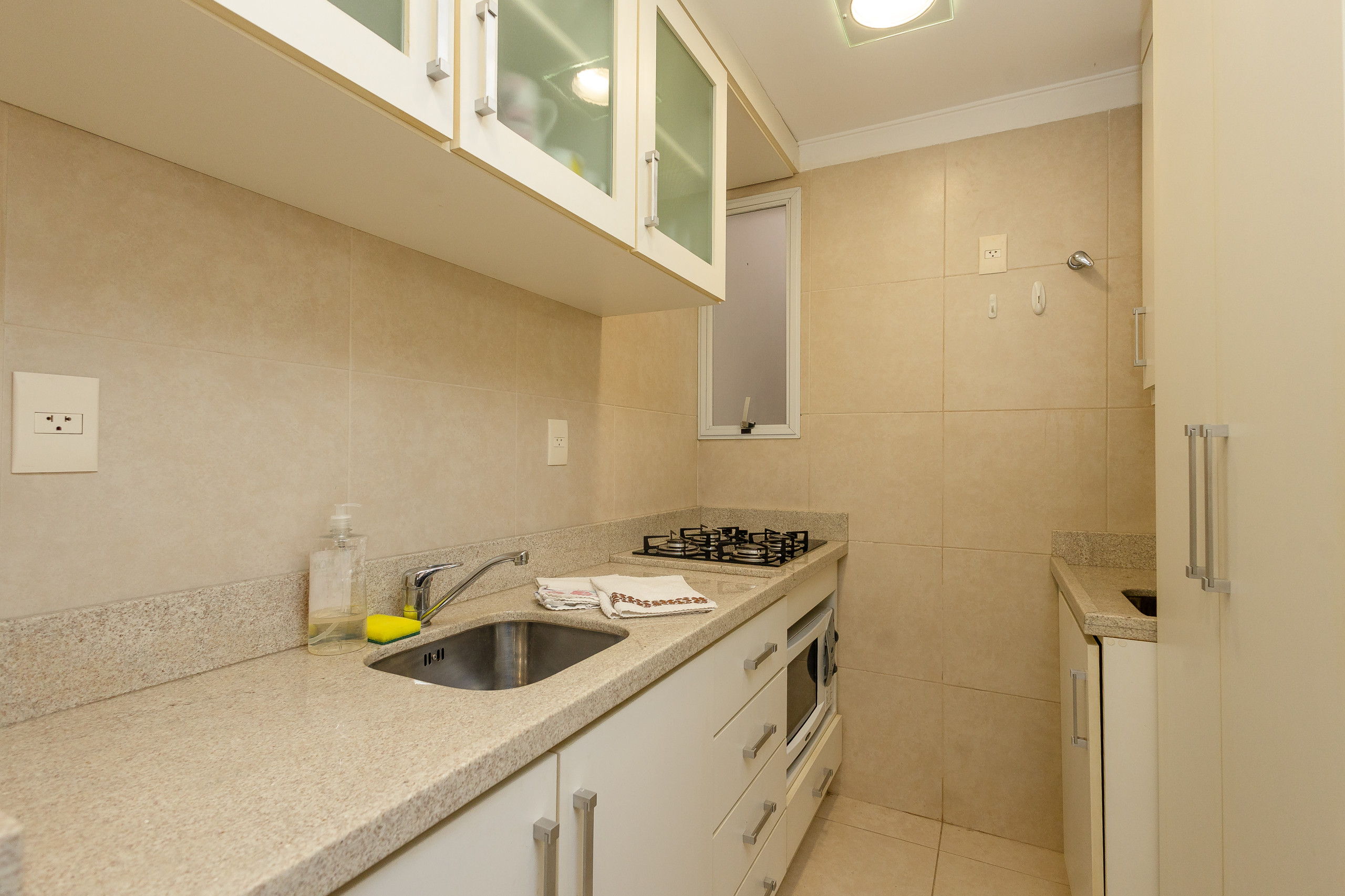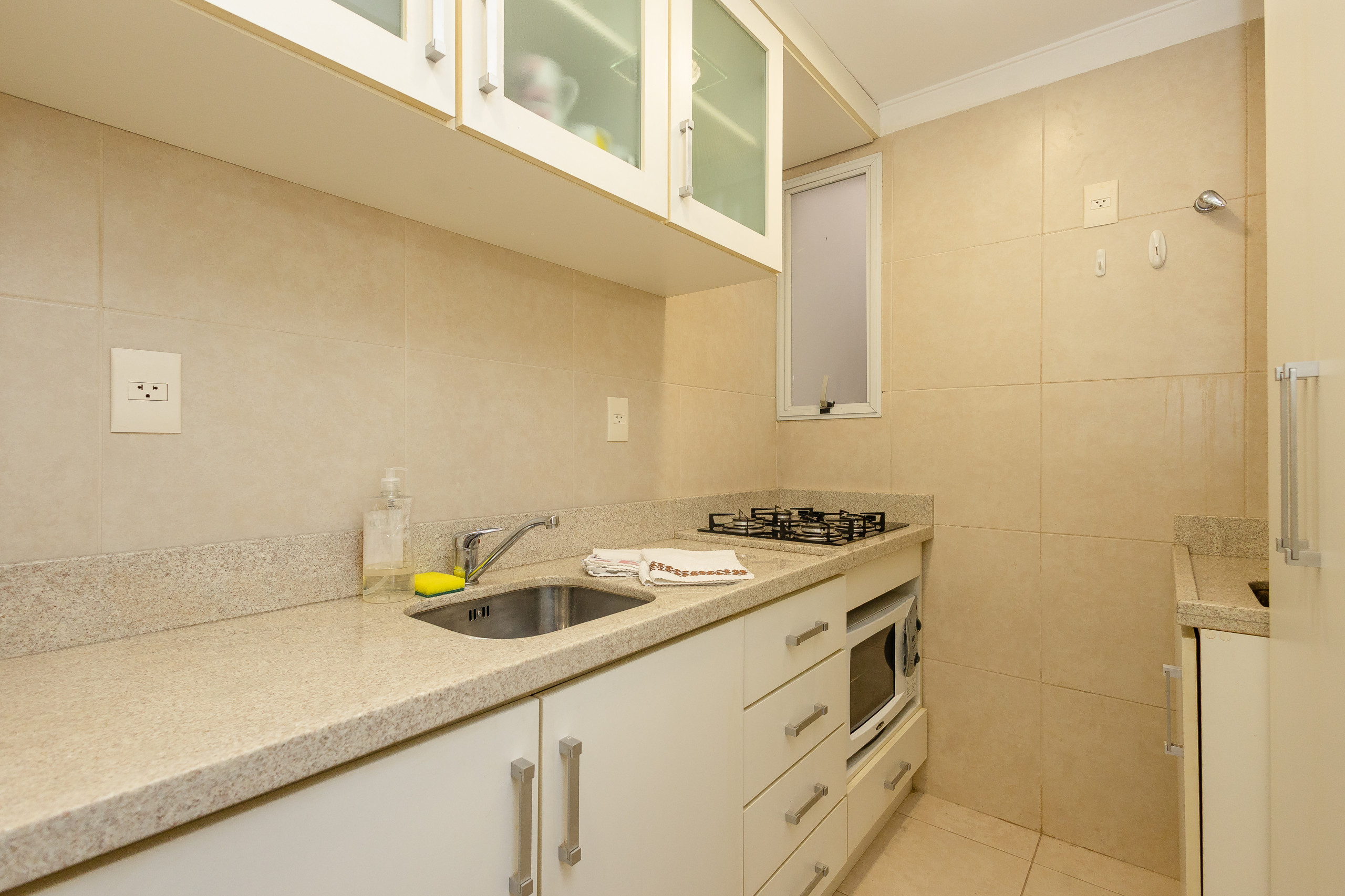 A cozinha americana, equipada com geladeira, freezer, fogão a gás, micro-ondas, cafeteira, utensílios e tudo o que você precisa para preparar refeições, facilita o dia a dia. O apartamento também conta com Wi-Fi, TV e ferro de passar roupa.