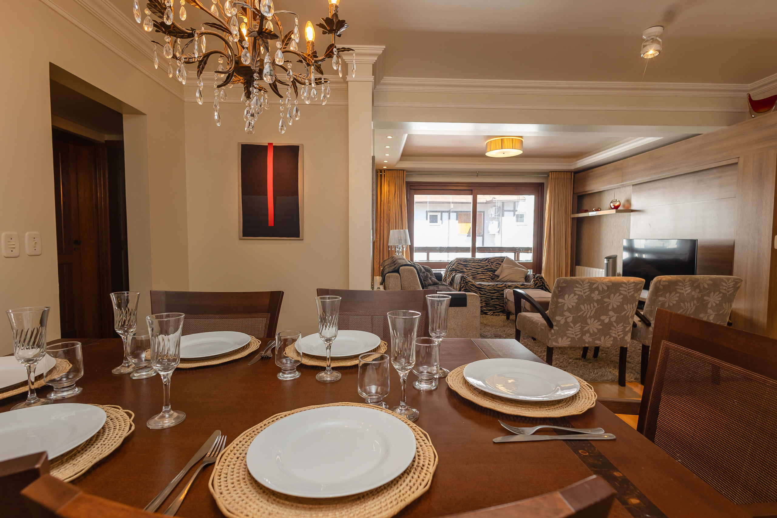 O apartamento é amplo e dispõe de dois dormitórios com split Q/F, lavabo, living 2 ambientes (estar e jantar), cozinha completa, espaço gourmet com churrasqueira, vaga de garagem e enxoval completo para a estadia!