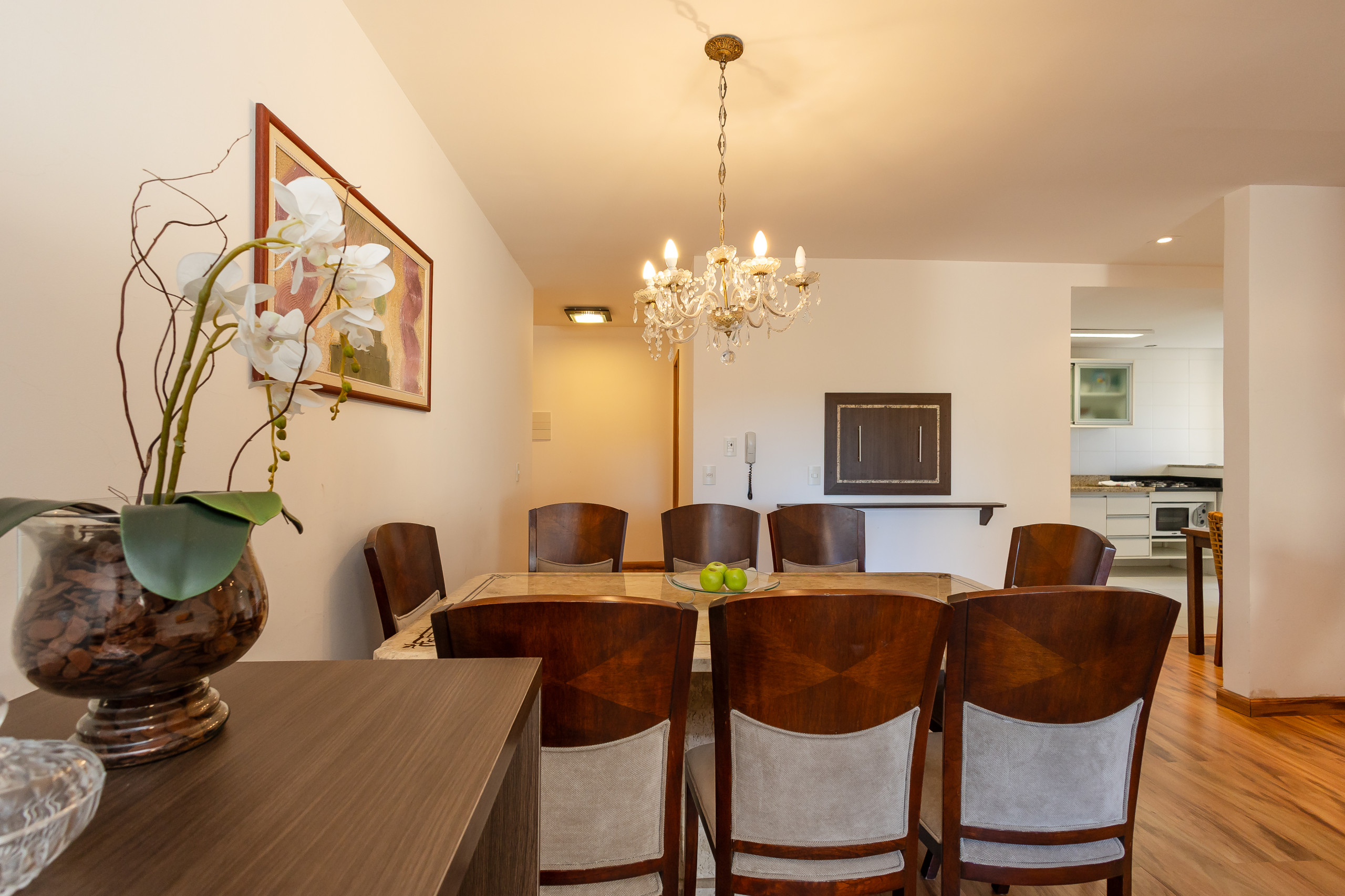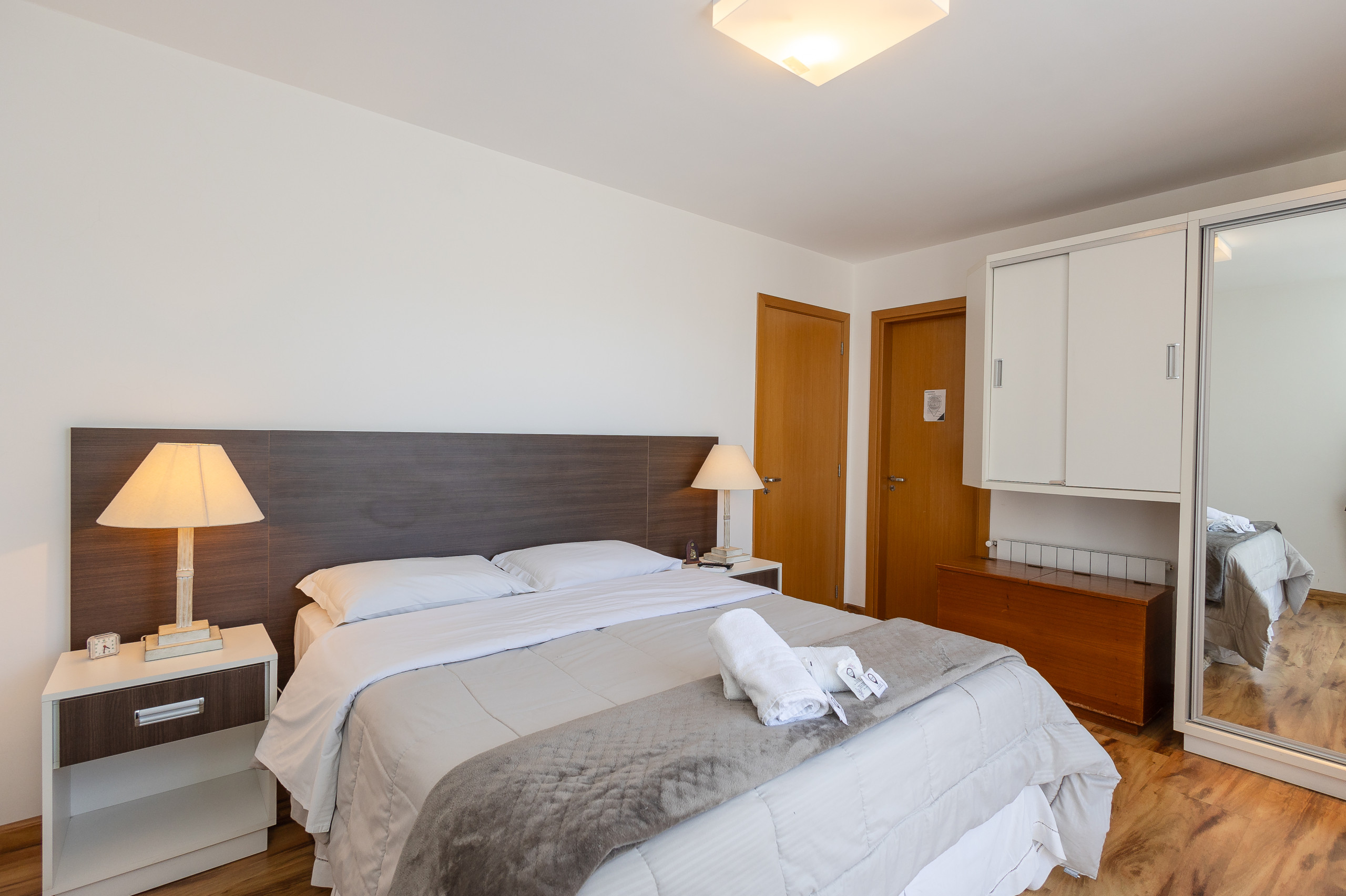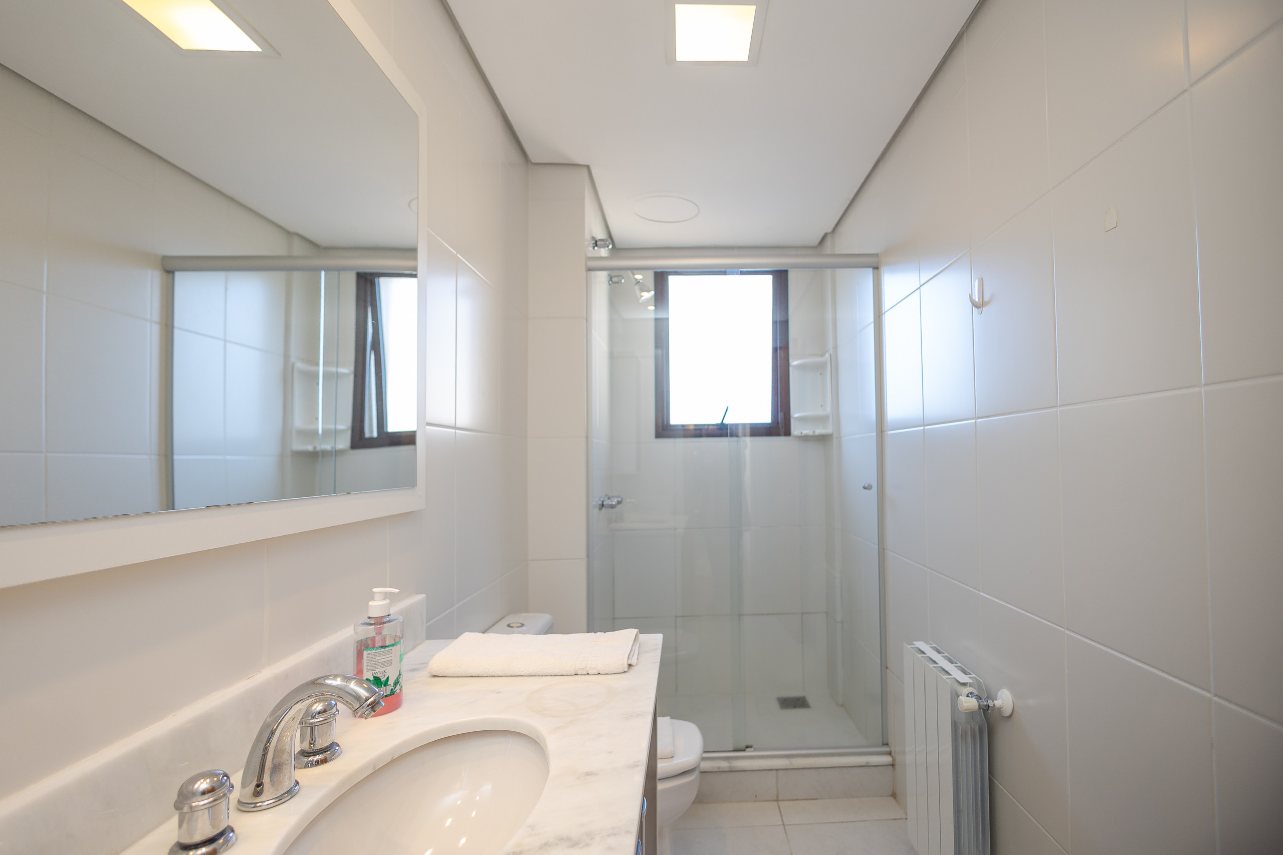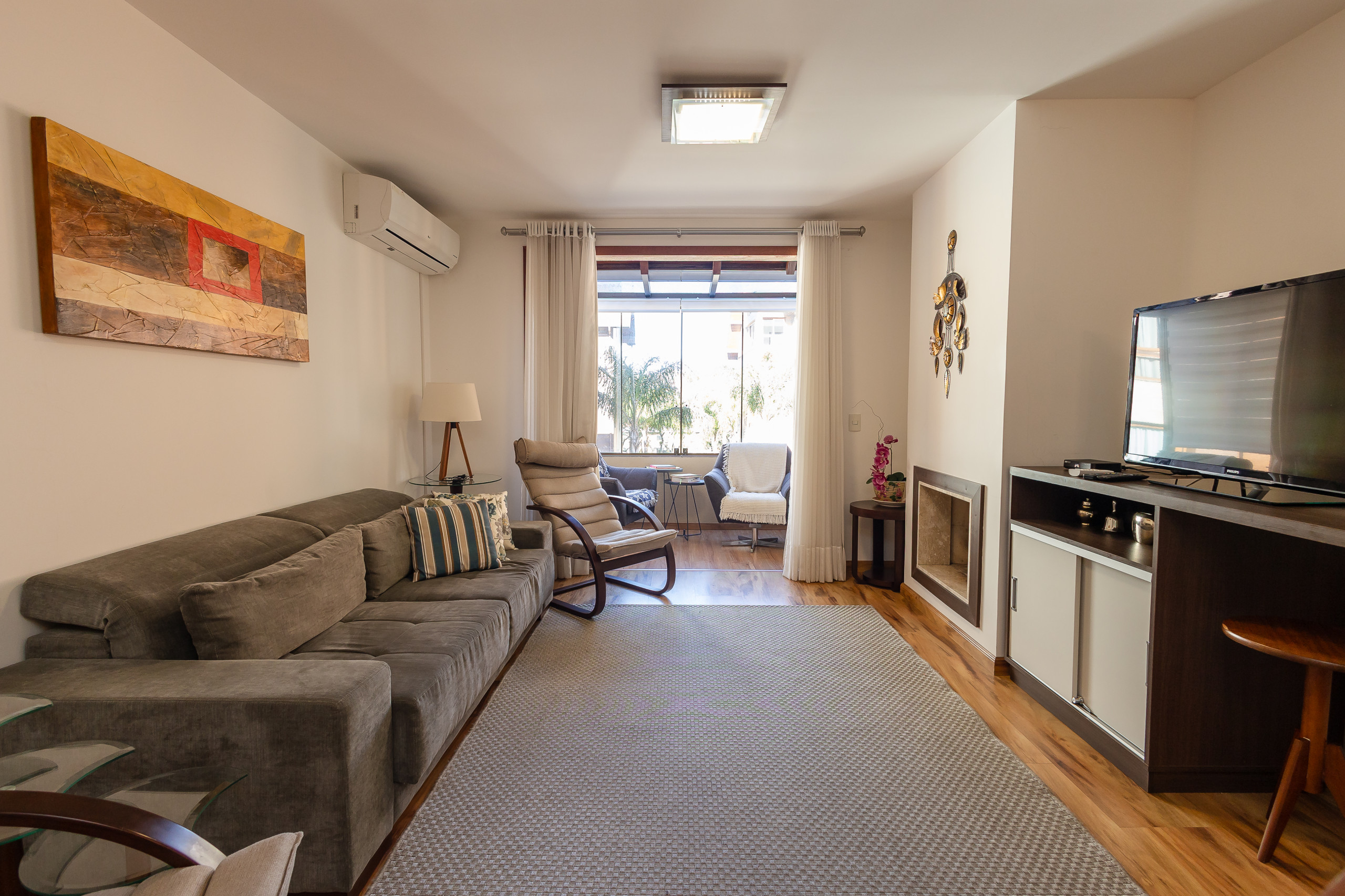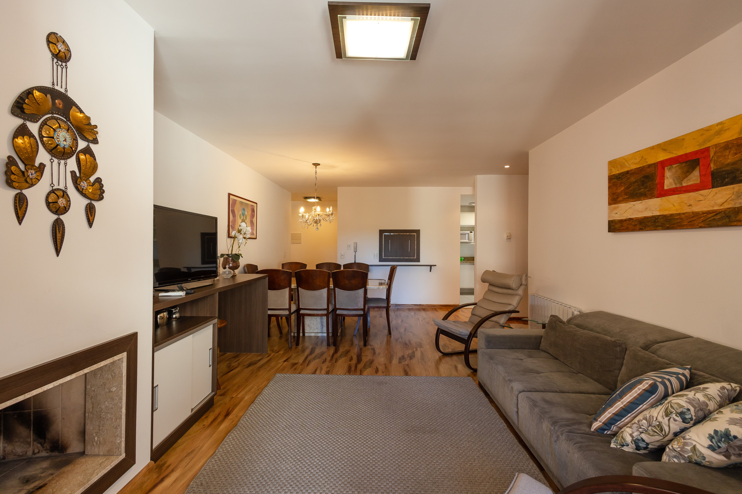 São 110m², peças amplas e iluminadas, sendo duas suítes com split Q/F, sala de estar (com churrasqueira, lareira, Split Q/F, televisão) cozinha equipada, lavabo, lavanderia e 3 sacadas. O apartamento também dispõe de Wi-Fi de alta velocidade, água quente em todos os pontos e demais eletrodomésticos.