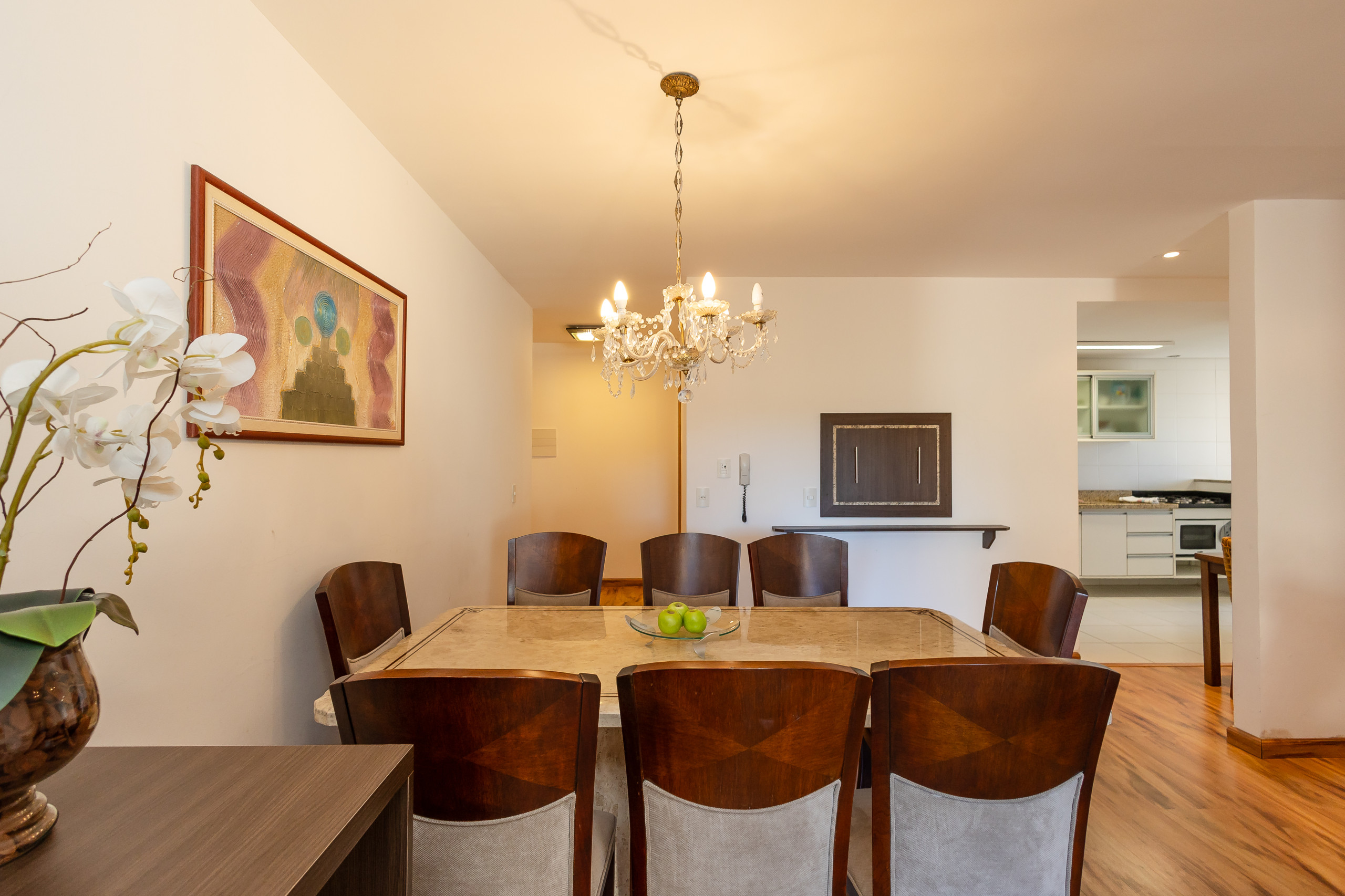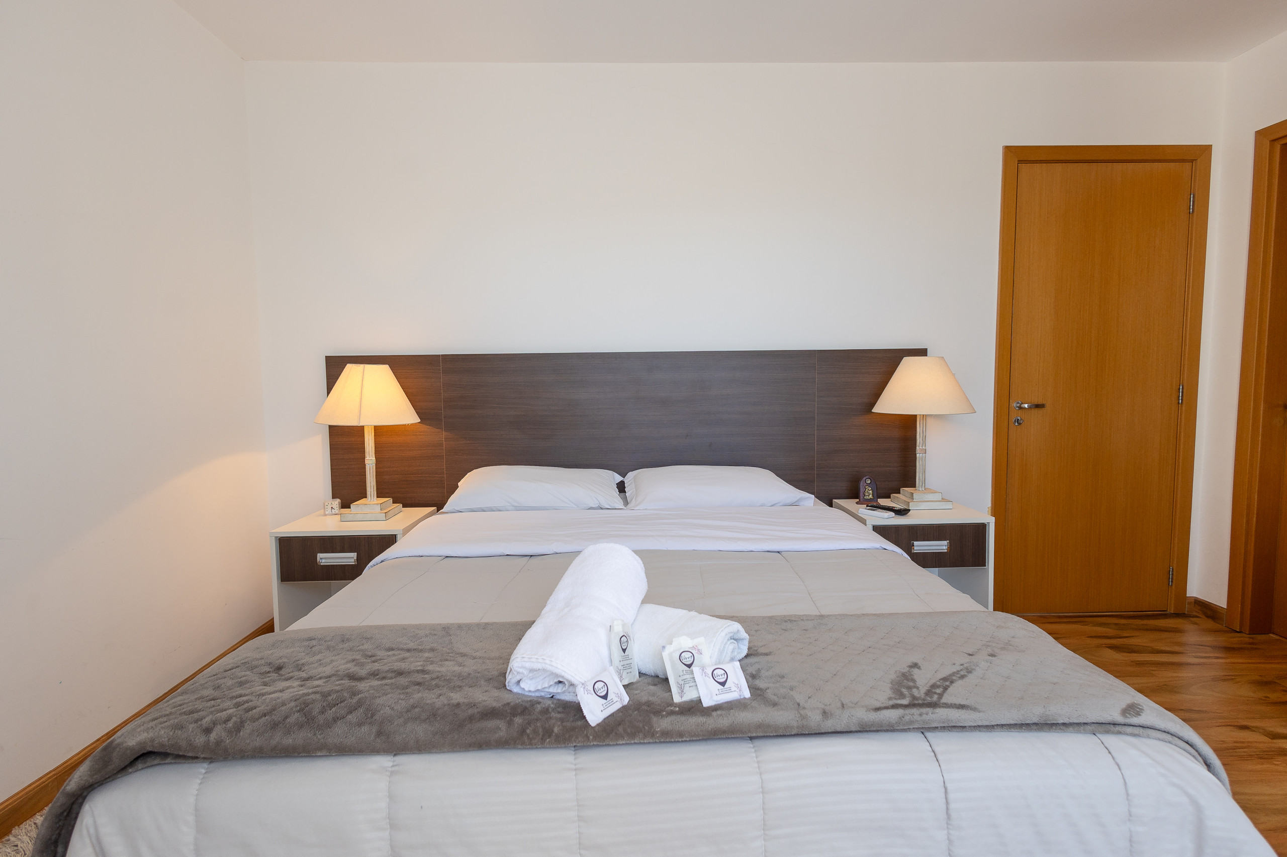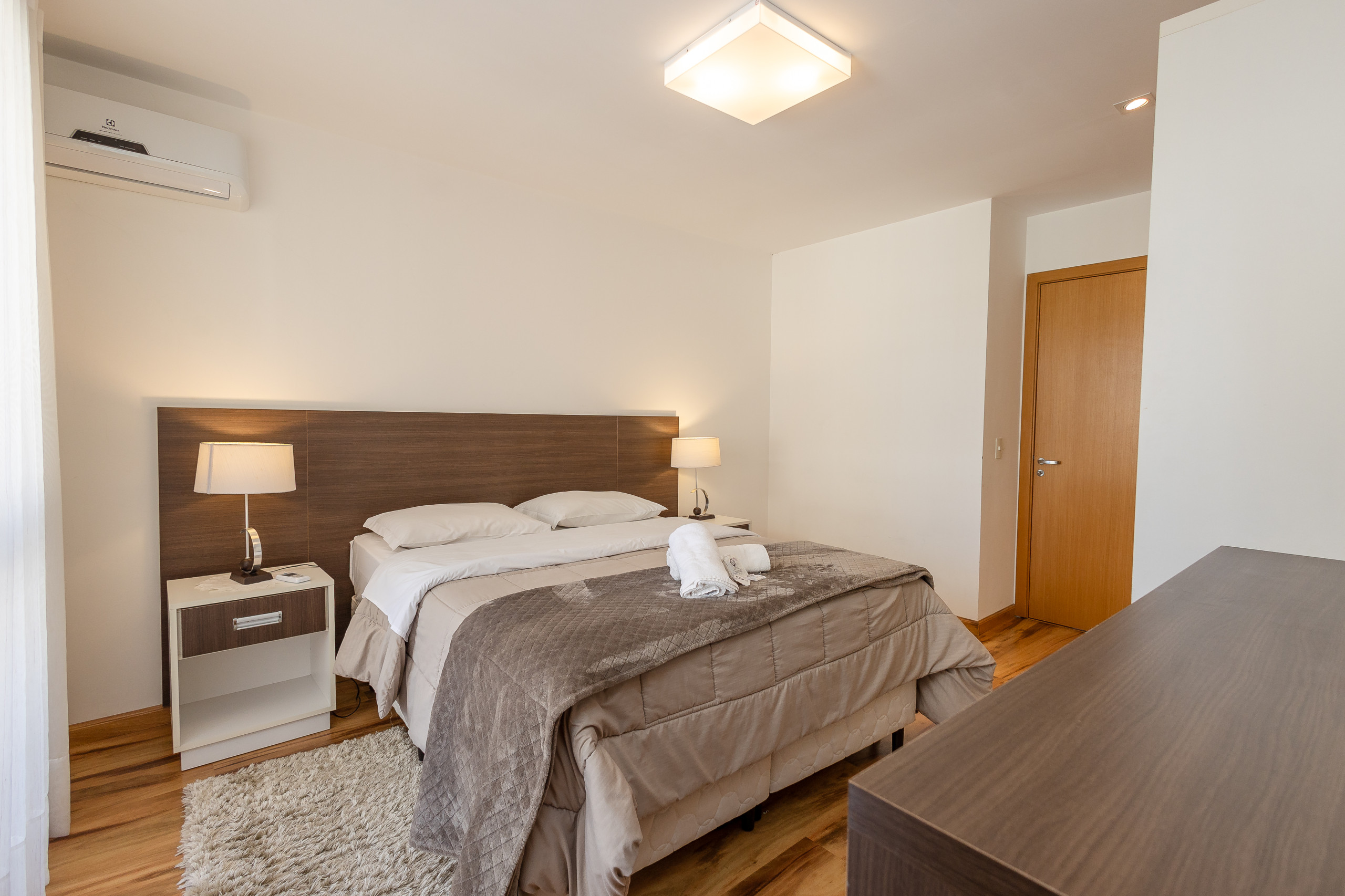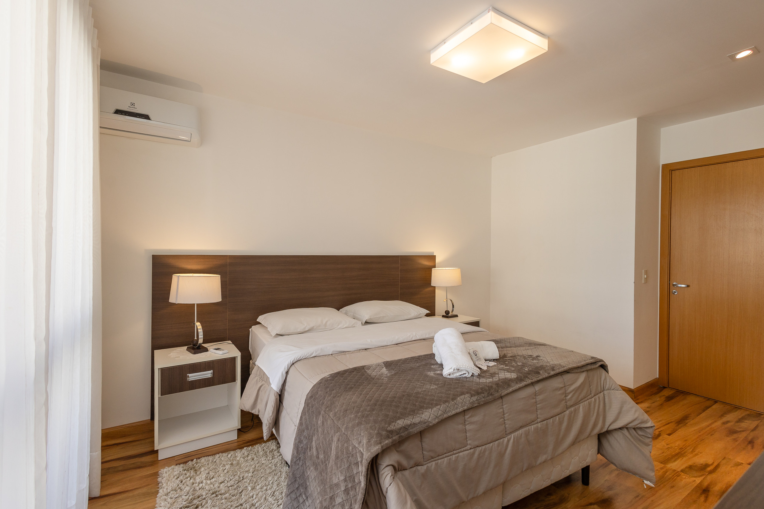 São 110m², peças amplas e iluminadas, sendo duas suítes com split Q/F, sala de estar (com churrasqueira, lareira, Split Q/F, televisão) cozinha equipada, lavabo, lavanderia e 3 sacadas. O apartamento também dispõe de Wi-Fi de alta velocidade, água quente em todos os pontos e demais eletrodomésticos.