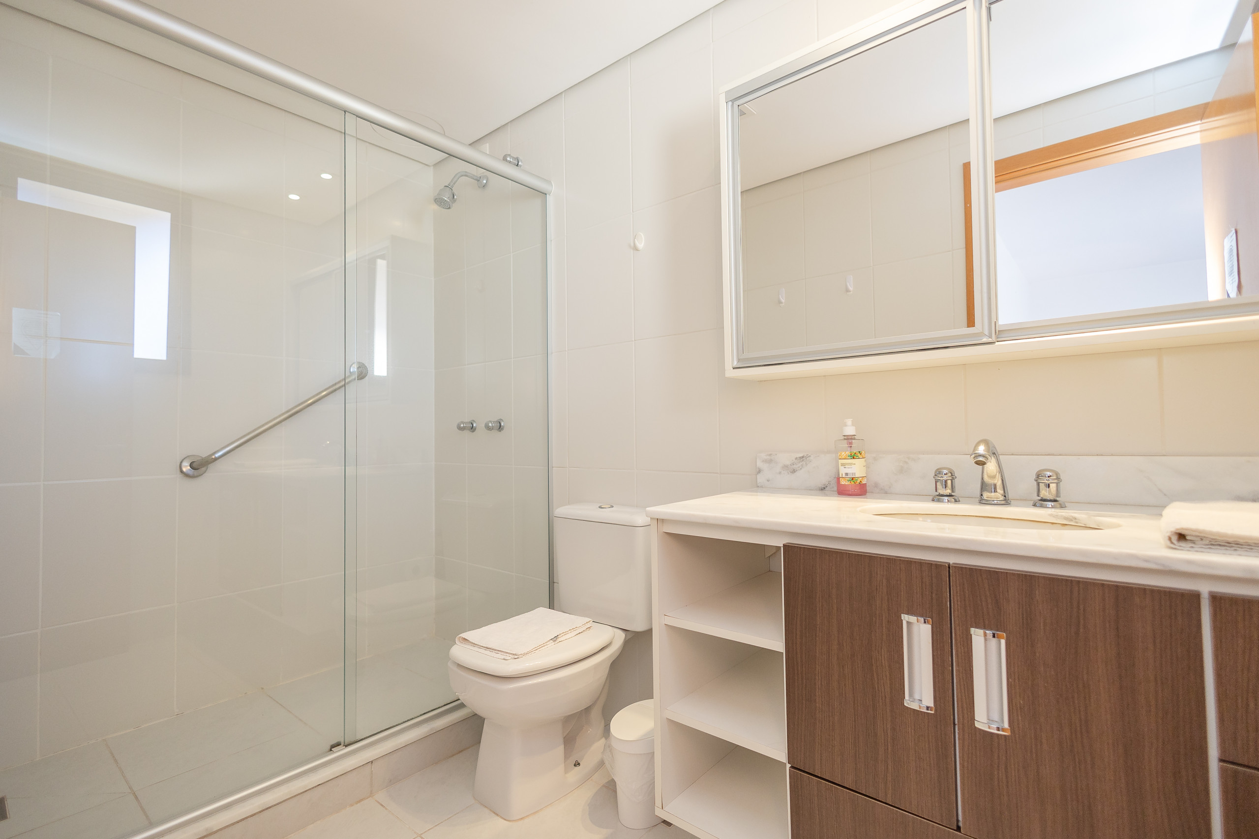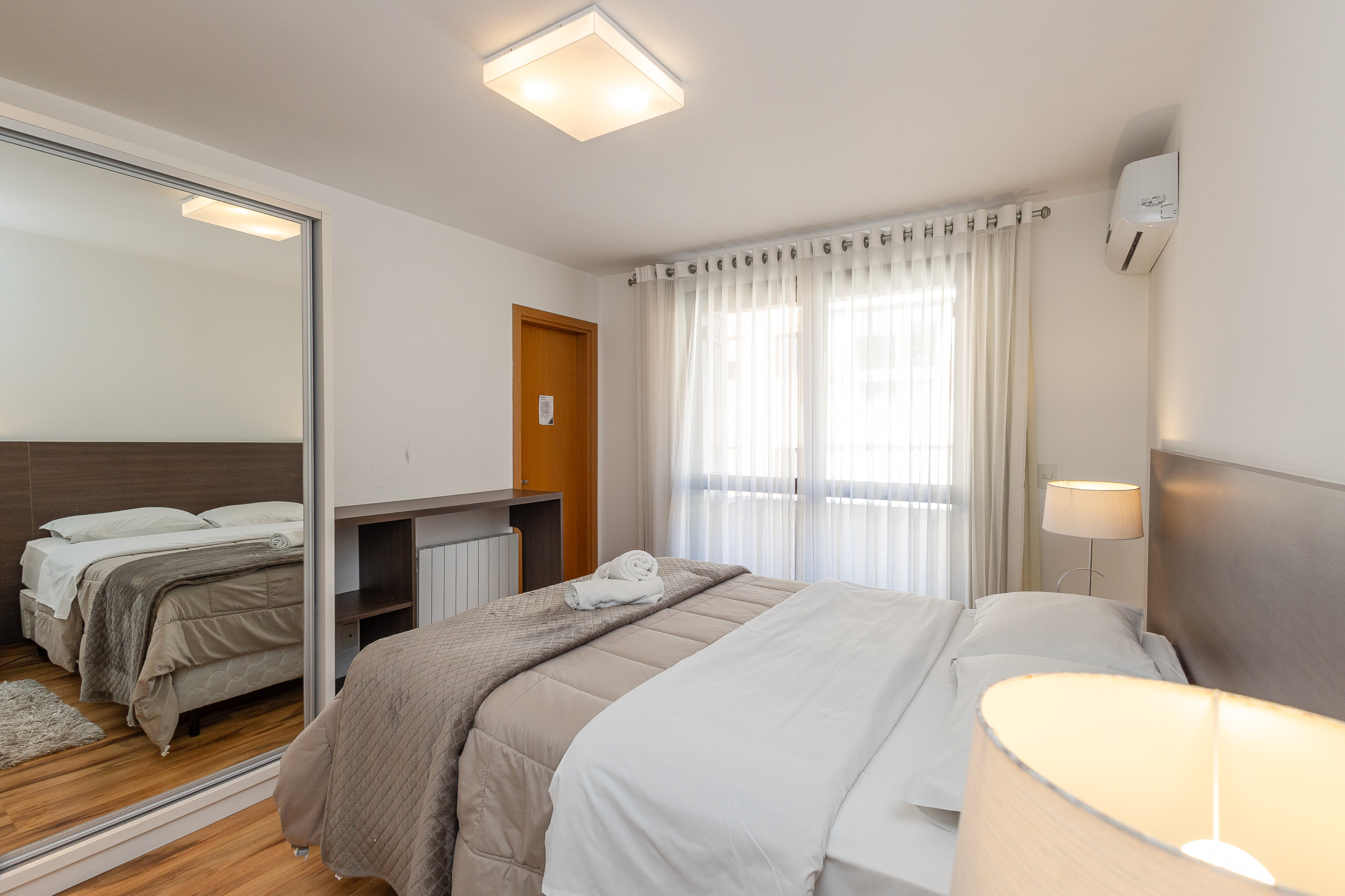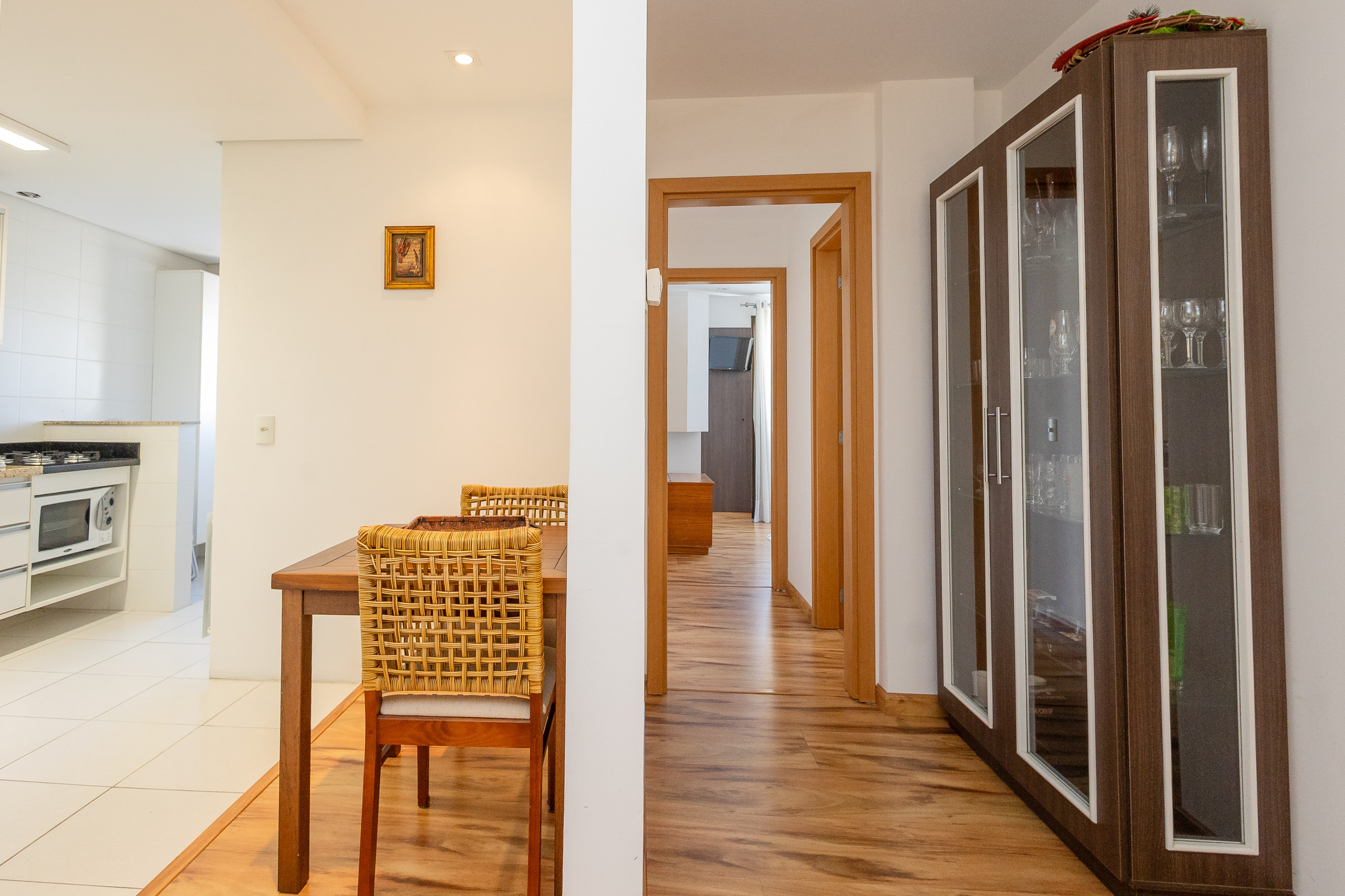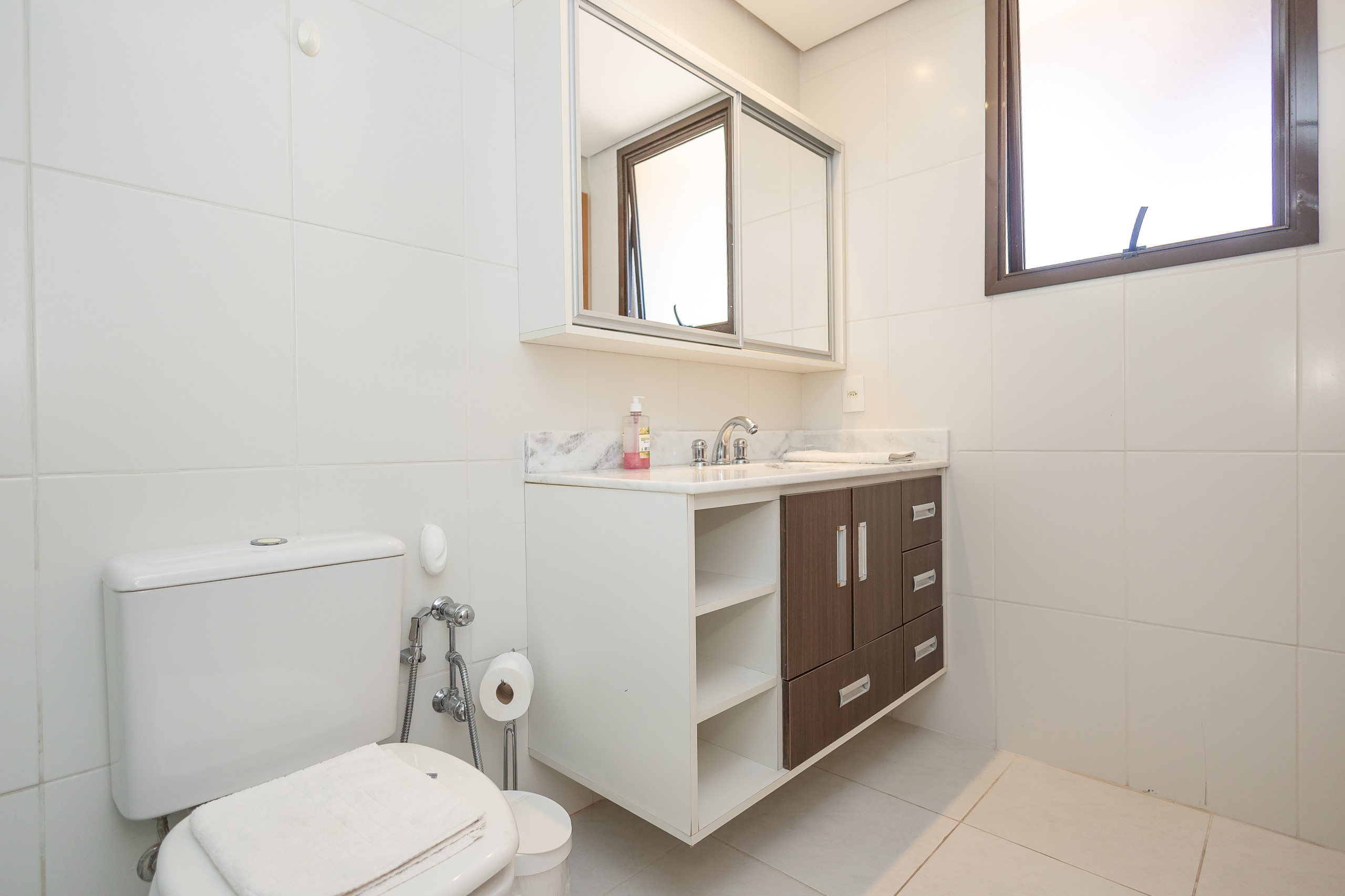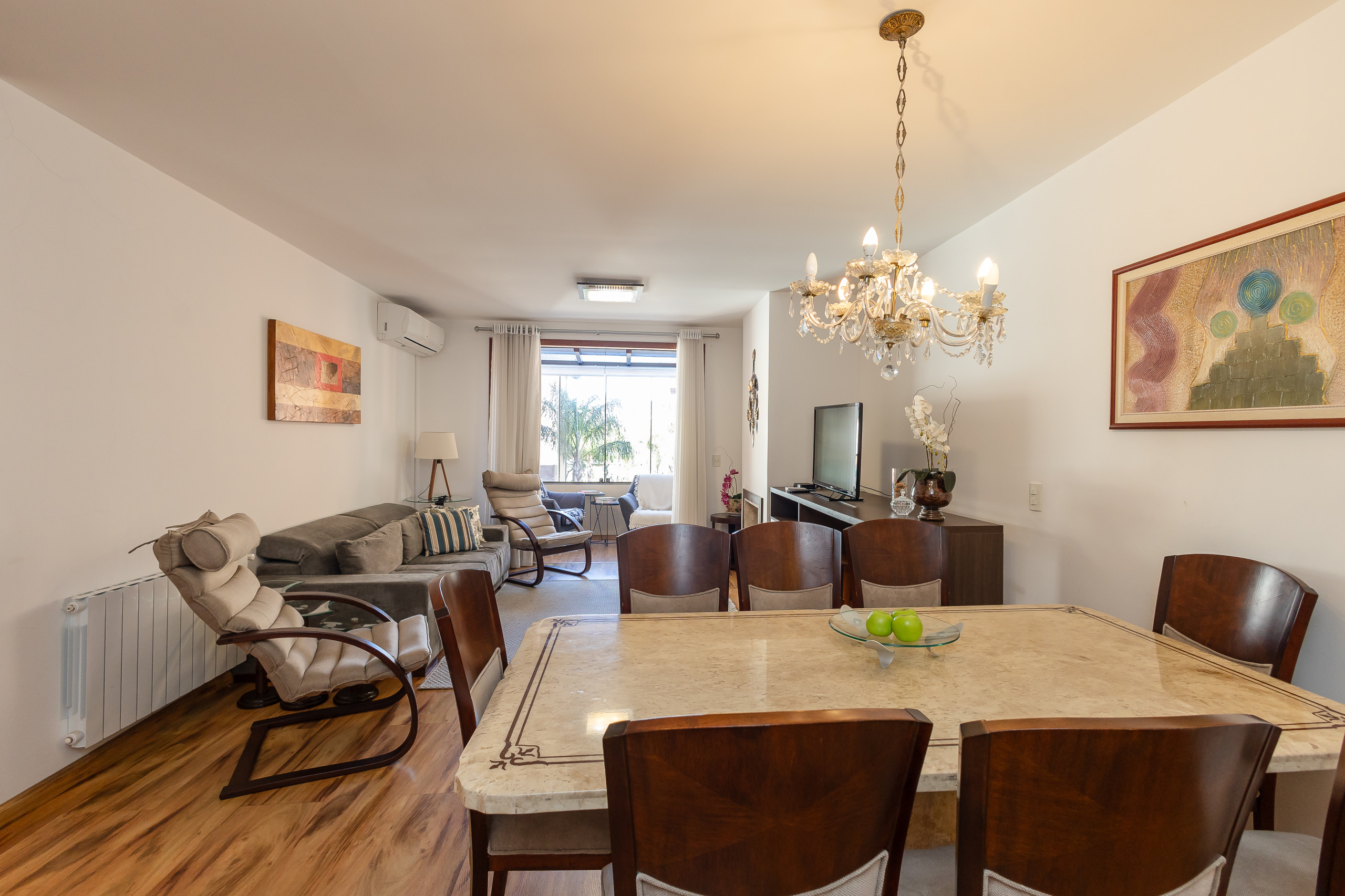 São 110m², peças amplas e iluminadas, sendo duas suítes com split Q/F, sala de estar (com churrasqueira, lareira, Split Q/F, televisão) cozinha equipada, lavabo, lavanderia e 3 sacadas. O apartamento também dispõe de Wi-Fi de alta velocidade, água quente em todos os pontos e demais eletrodomésticos.