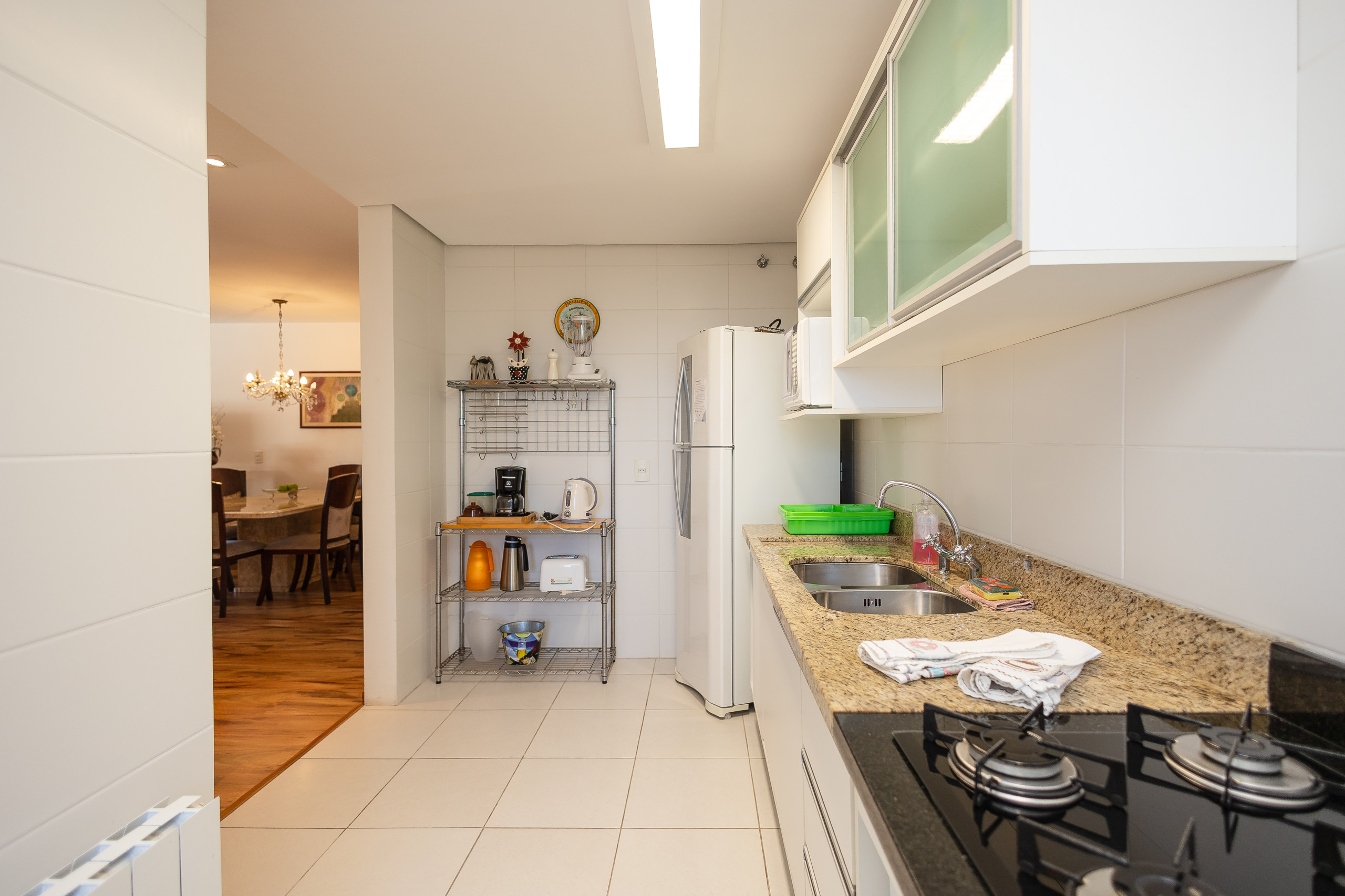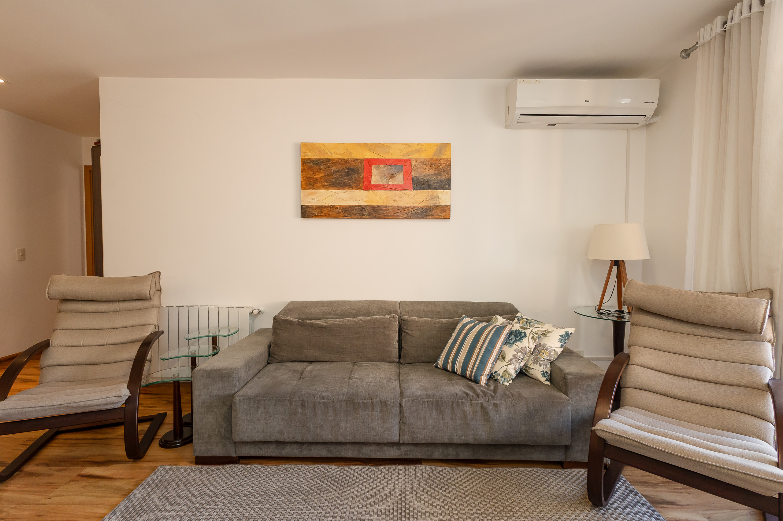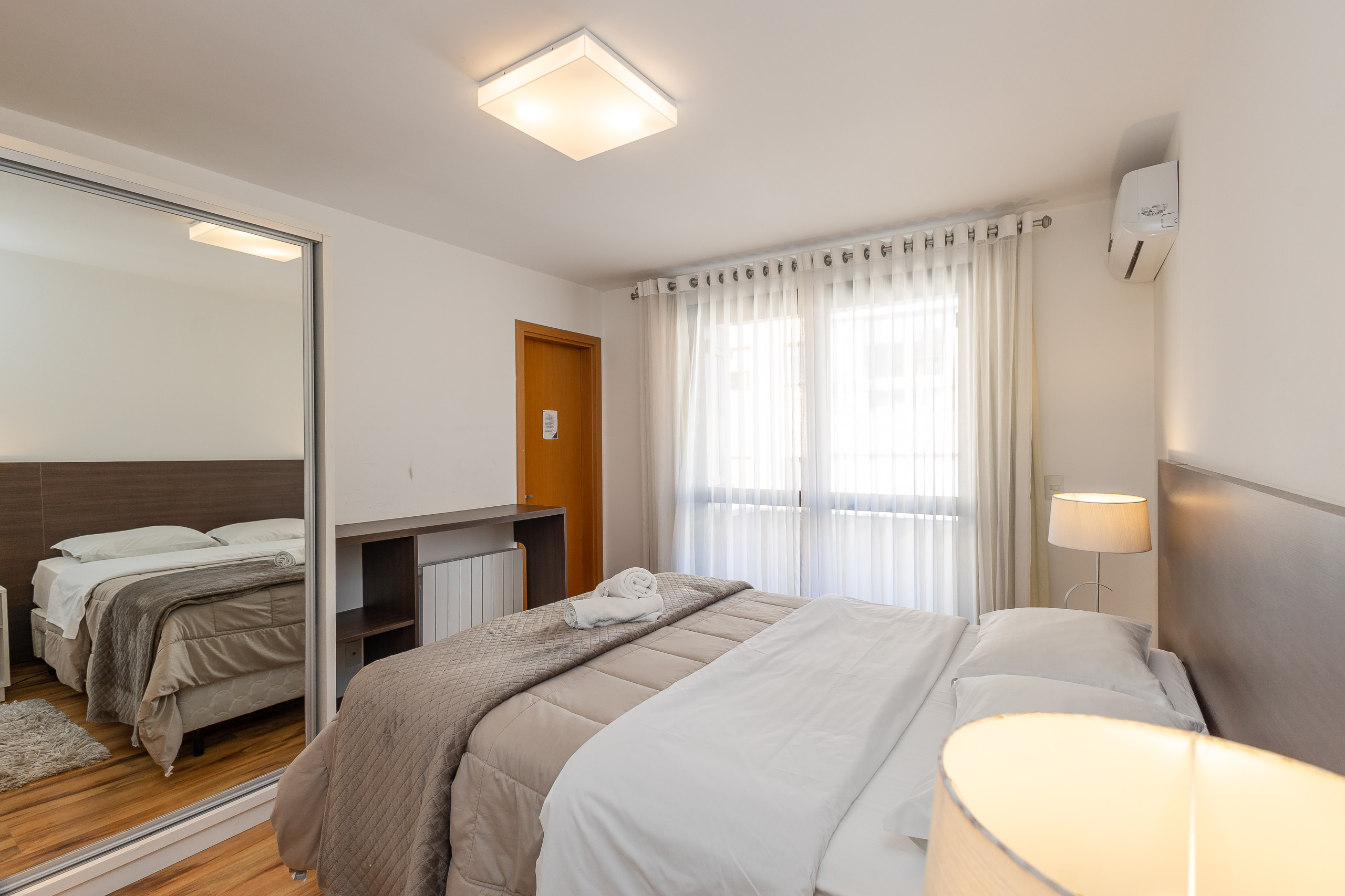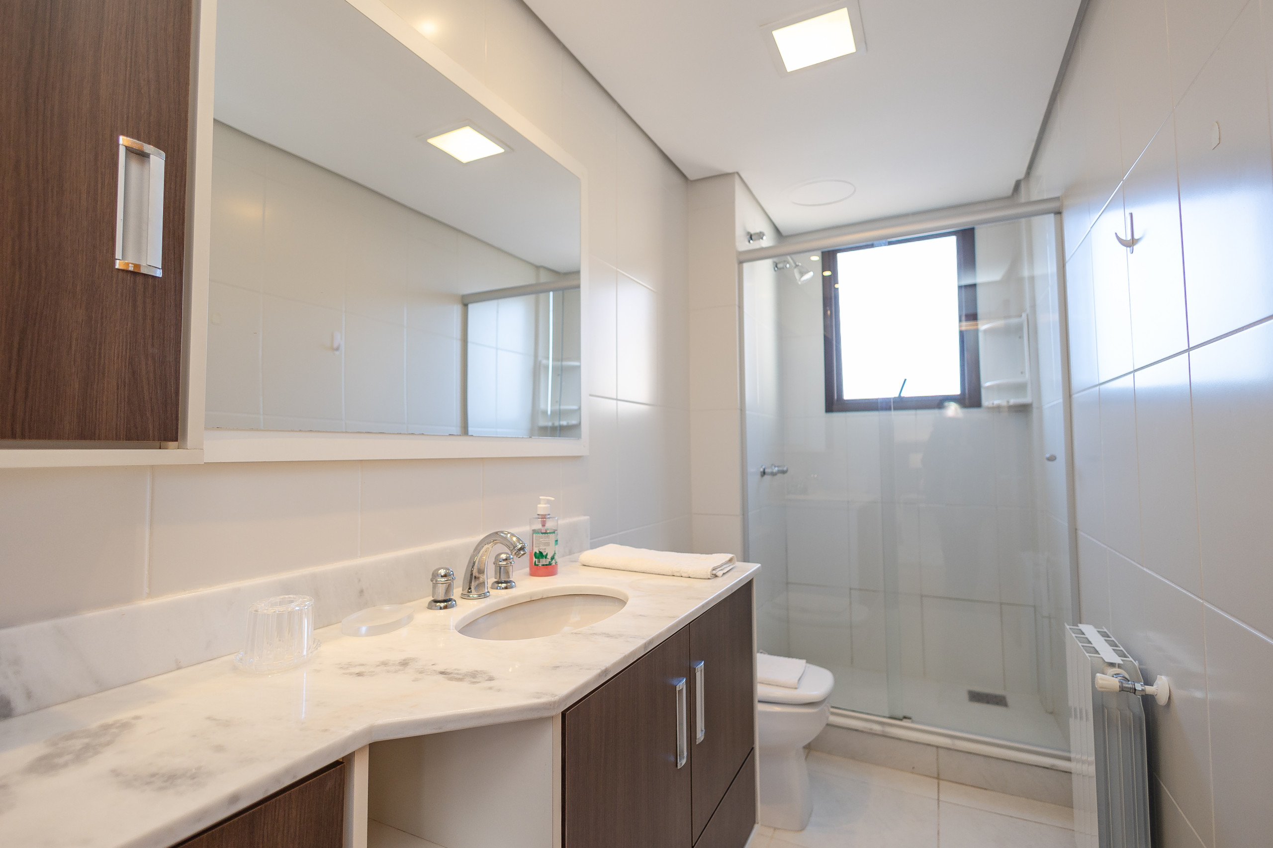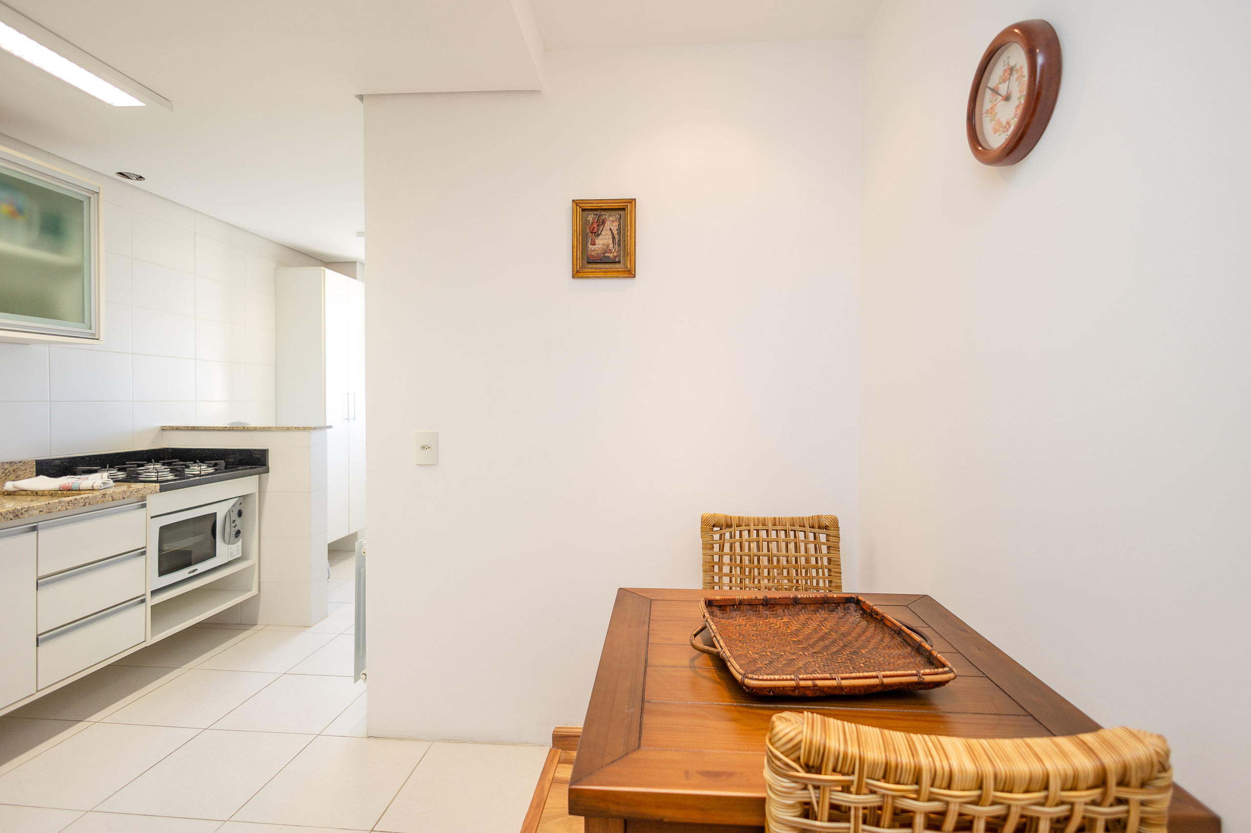 São 110m², peças amplas e iluminadas, sendo duas suítes com split Q/F, sala de estar (com churrasqueira, lareira, Split Q/F, televisão) cozinha equipada, lavabo, lavanderia e 3 sacadas. O apartamento também dispõe de Wi-Fi de alta velocidade, água quente em todos os pontos e demais eletrodomésticos.