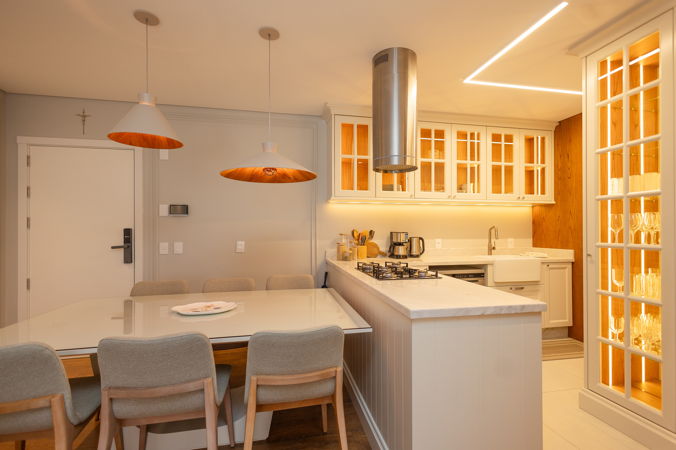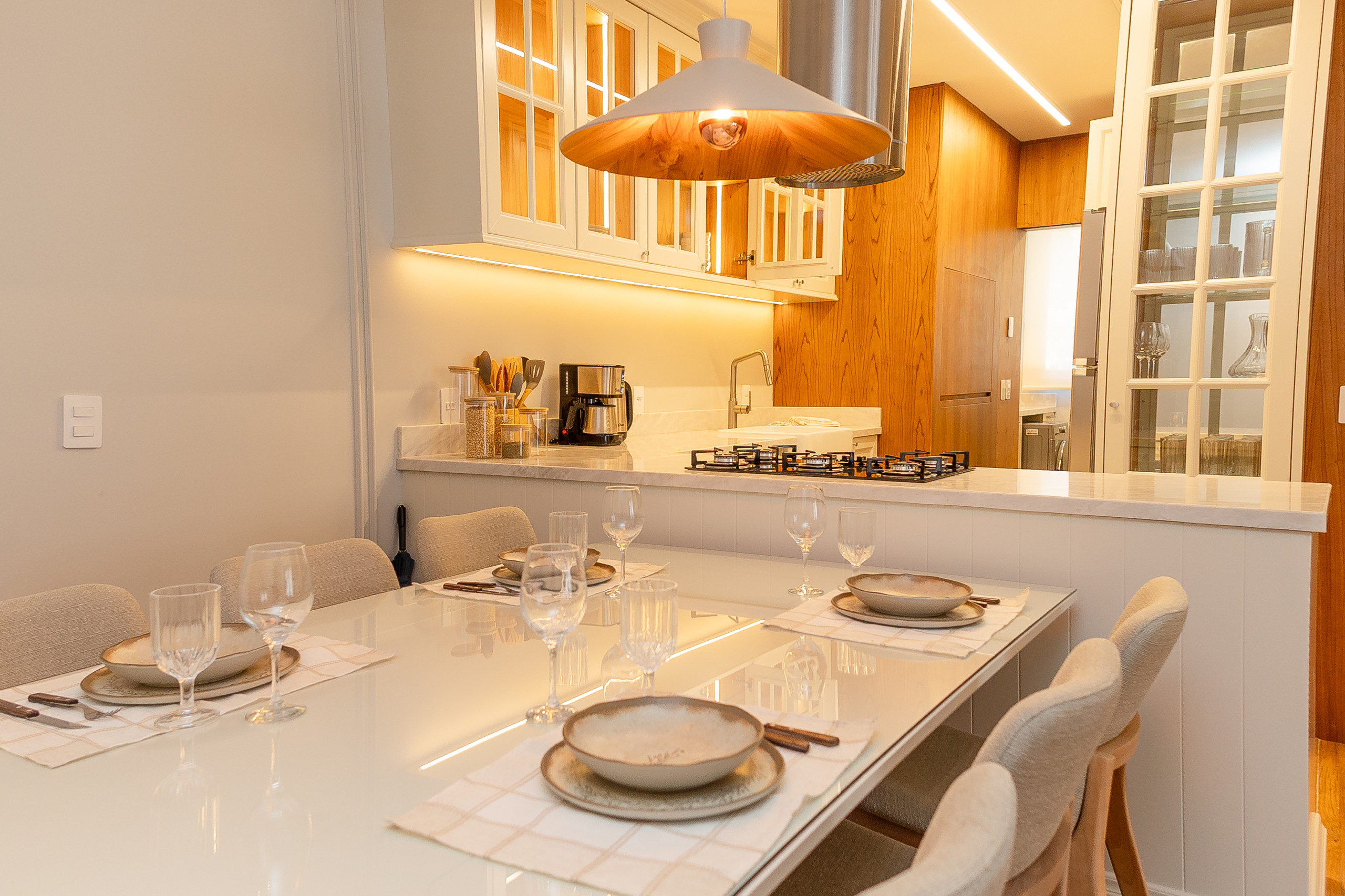 A cozinha completa conta com lava louças, churrasqueira, geladeira, cafeteira, sanduicheira, micro-ondas, cooktop e fogão. À mesa, poderão sentar-se até 06 hospedes para refeições ou para simplesmente apreciar um chocolate quente ou um vinho. O apartamento ainda dispõe de lavanderia com lava e seca.