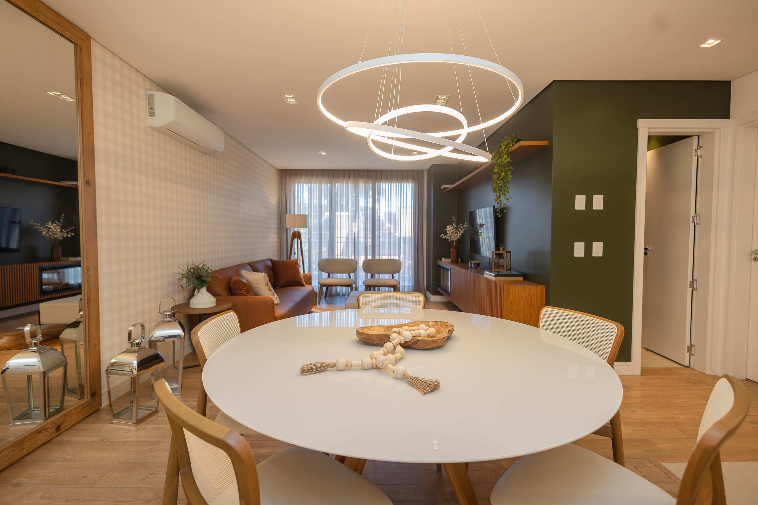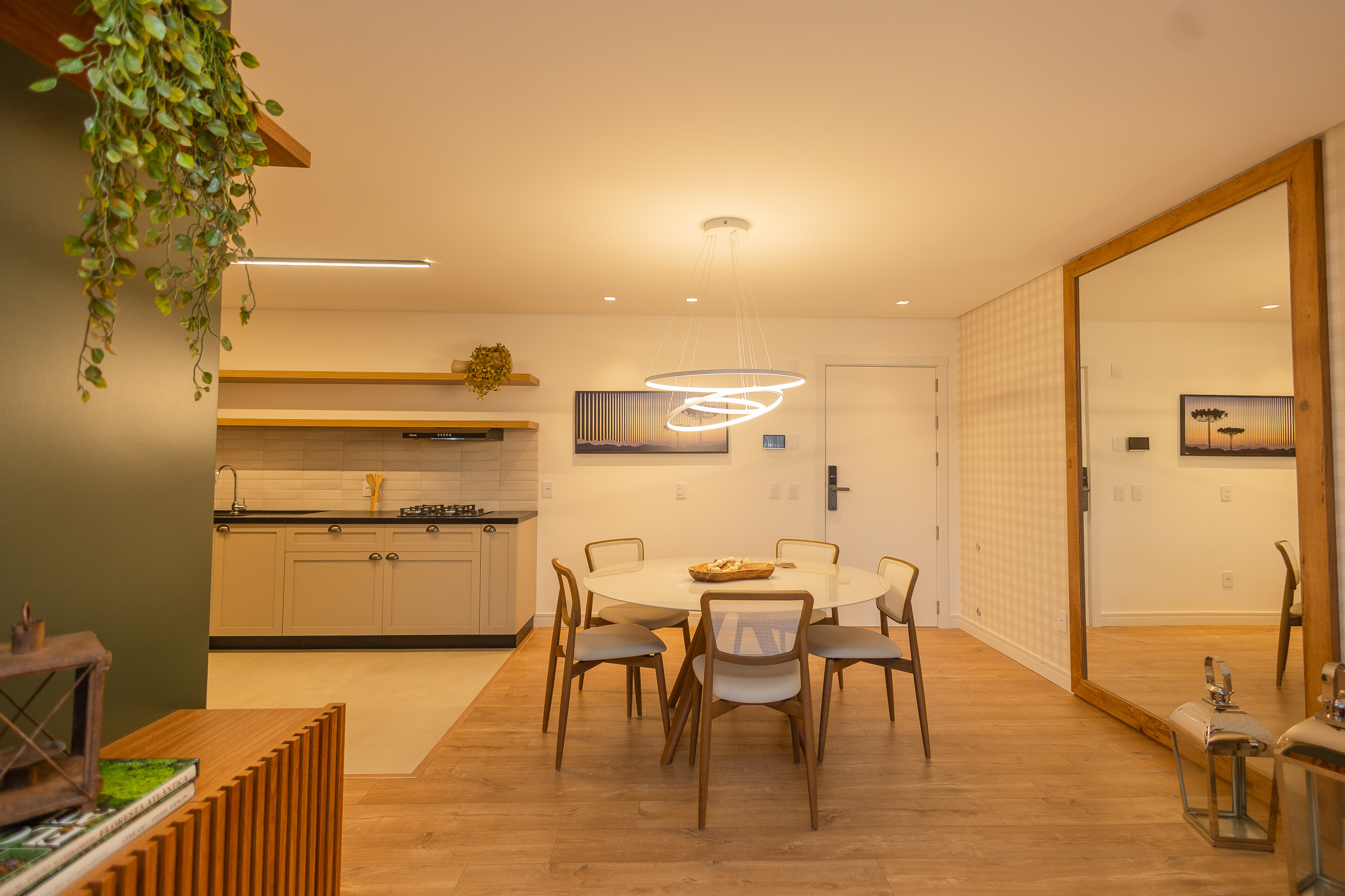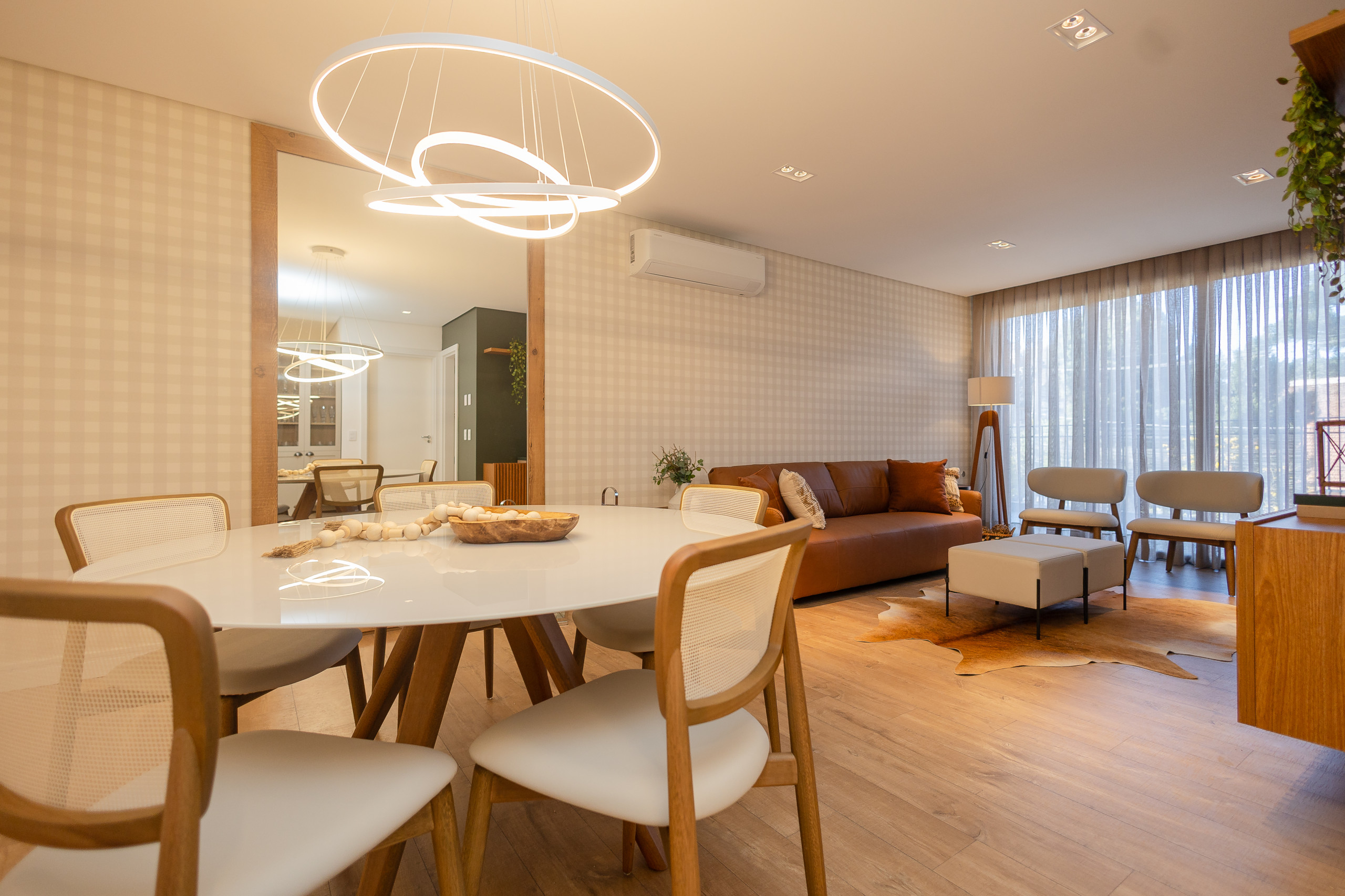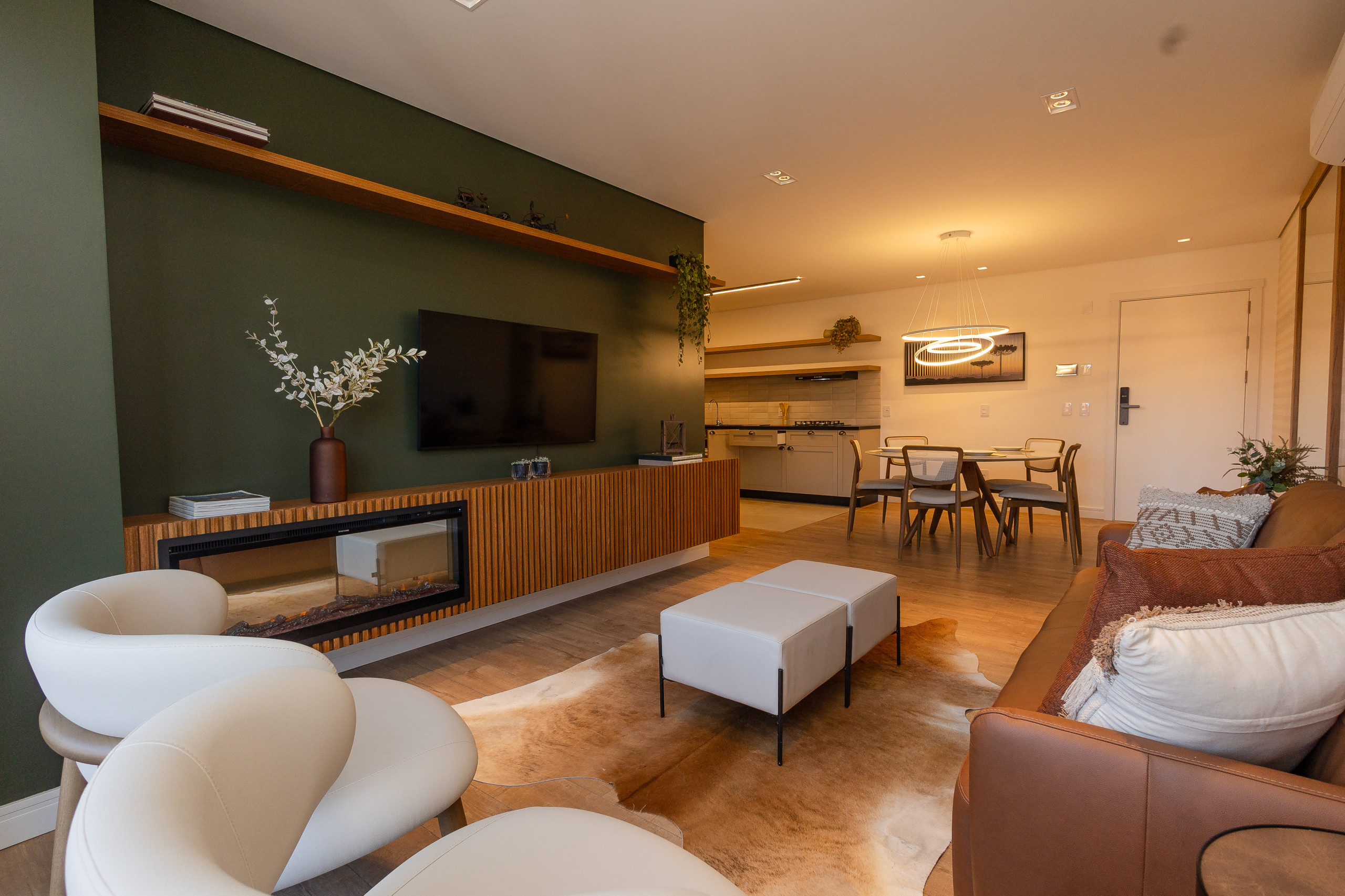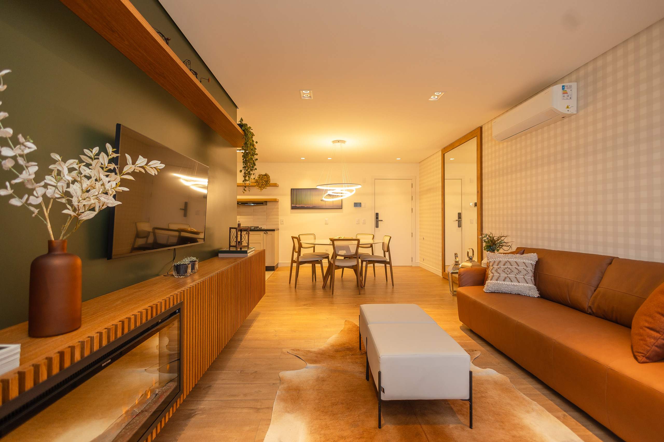 O amplo living com três ambientes (cozinha, estar e jantar) e lavabo vai proporcionar um espaço aconchegante para que aproveitem os momentos de descontração em grupo! Além da lareira elétrica também conta com split Q/F e varanda, tornando especiais os dias de verão e inverno!