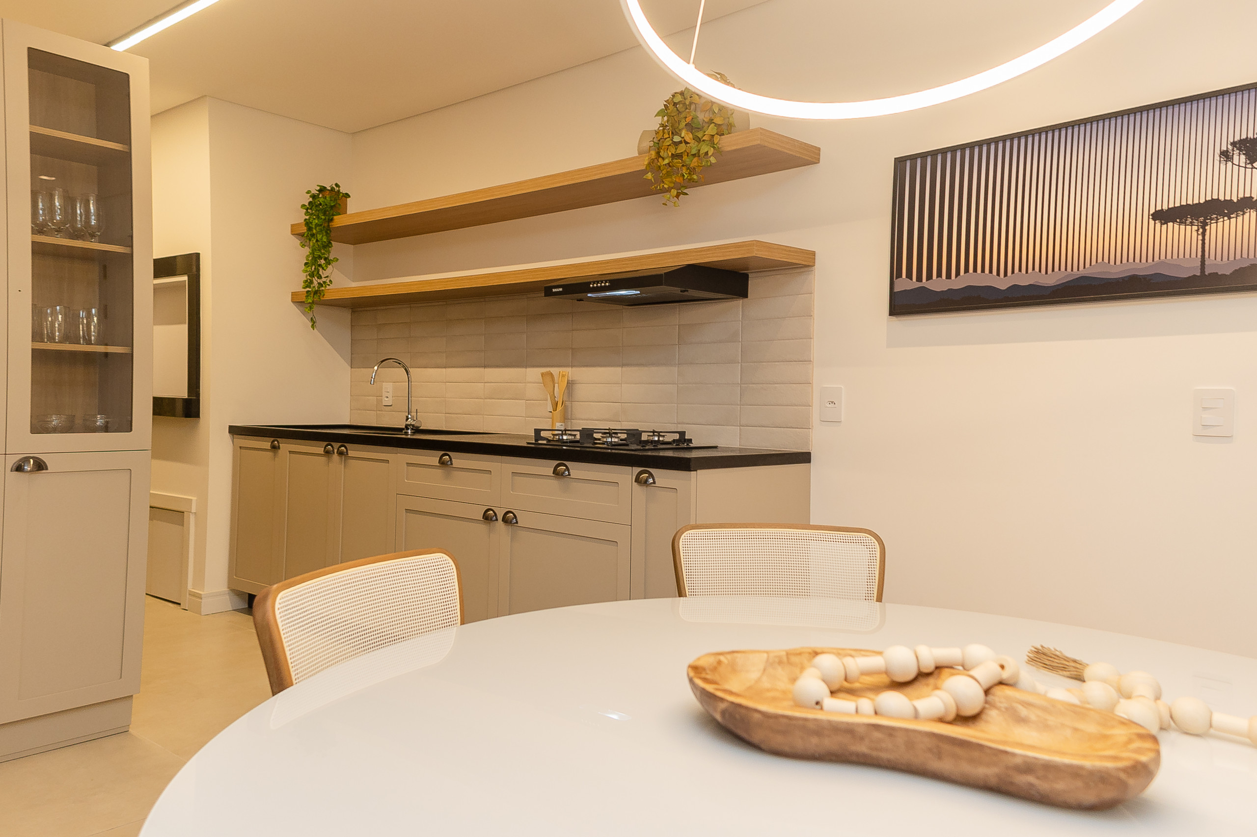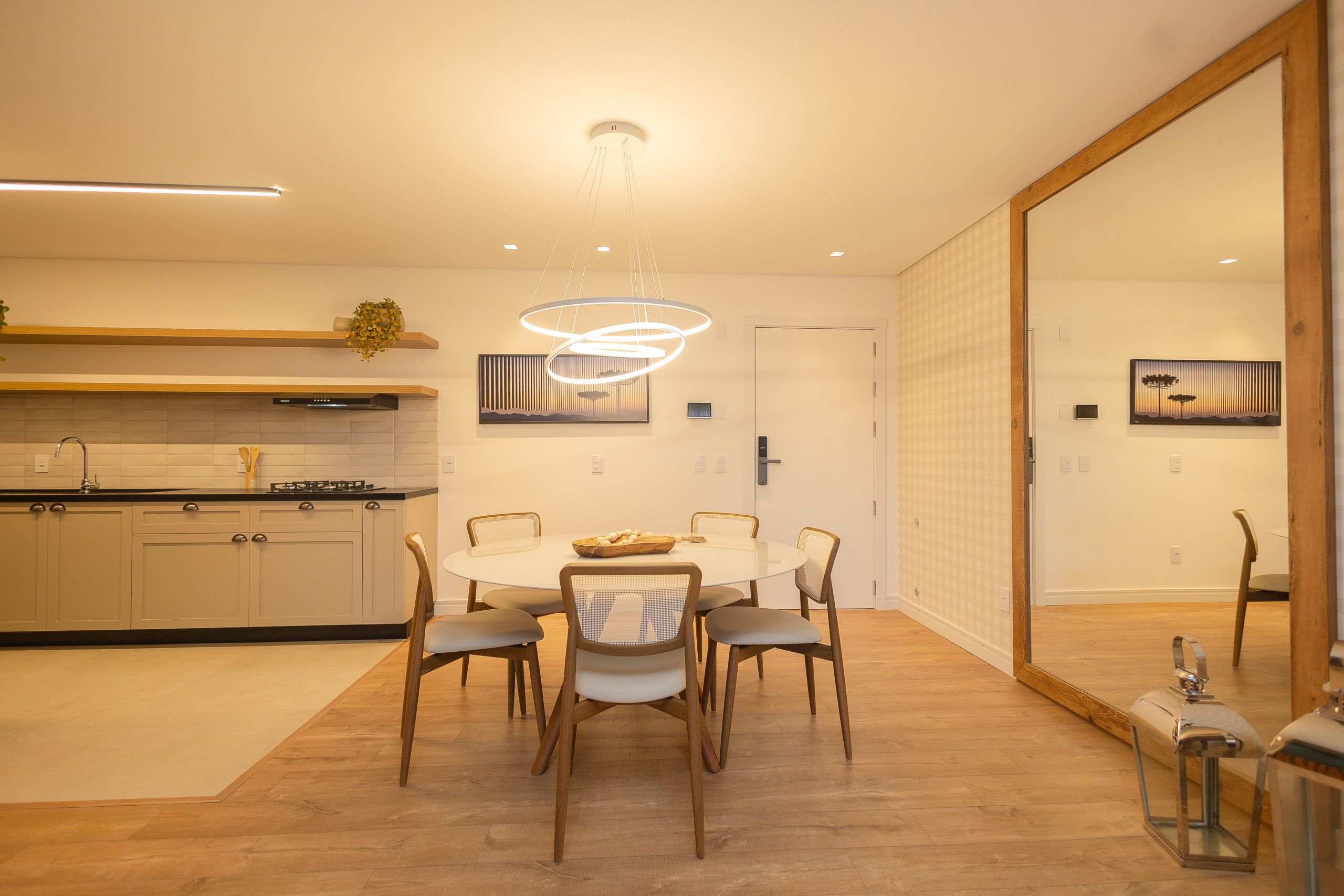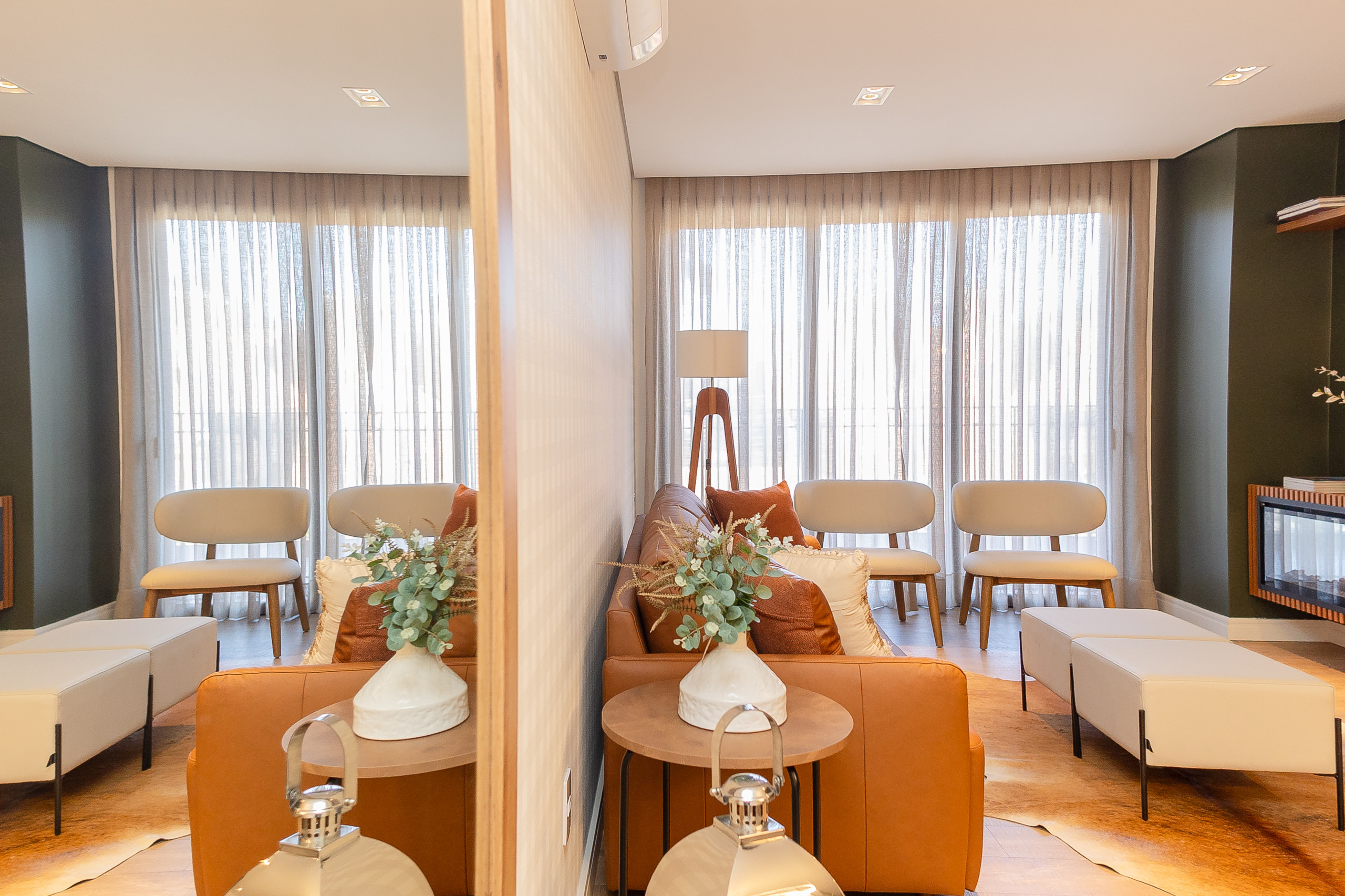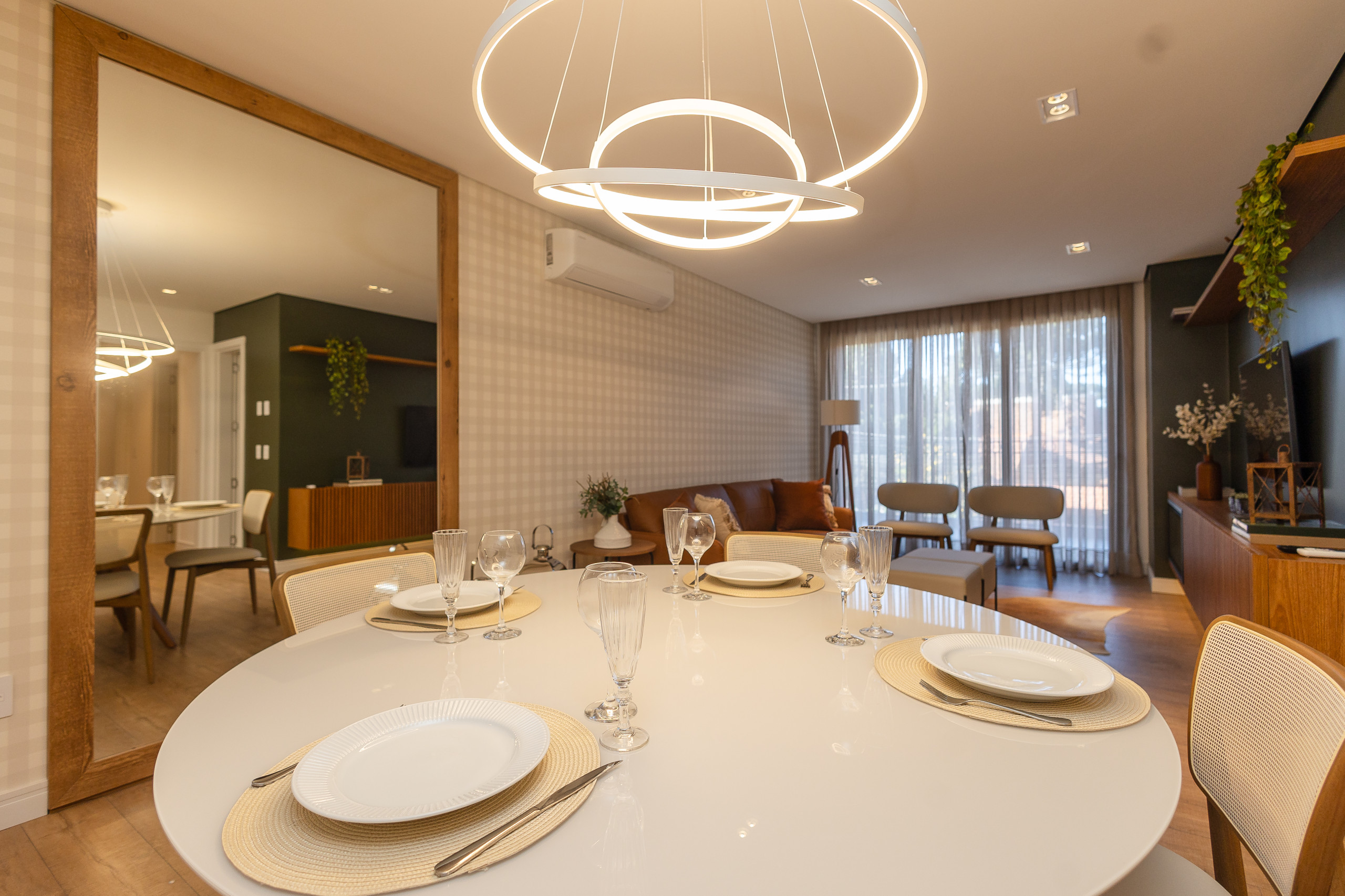 O amplo living com três ambientes (cozinha, estar e jantar) e lavabo vai proporcionar um espaço aconchegante para que aproveitem os momentos de descontração em grupo! Além da lareira elétrica também conta com split Q/F e varanda, tornando especiais os dias de verão e inverno!