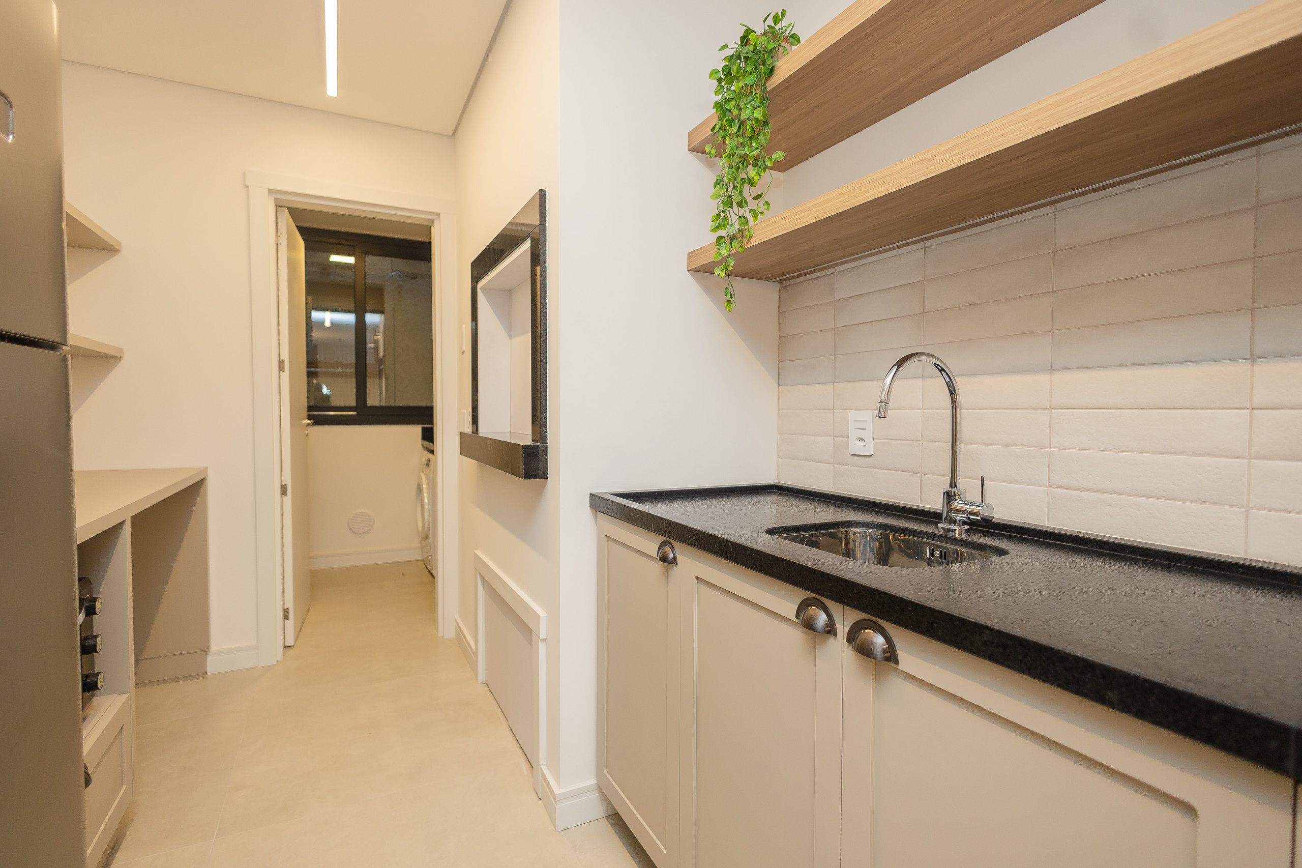 A cozinha completa conta com churrasqueira, geladeira, cafeteira, sanduicheira, micro-ondas, cooktop e fogão. À mesa, poderão sentar-se até 06 hospedes para refeições ou para simplesmente apreciar um chocolate quente ou um vinho. O apartamento ainda dispõe de lavanderia com lava e seca.