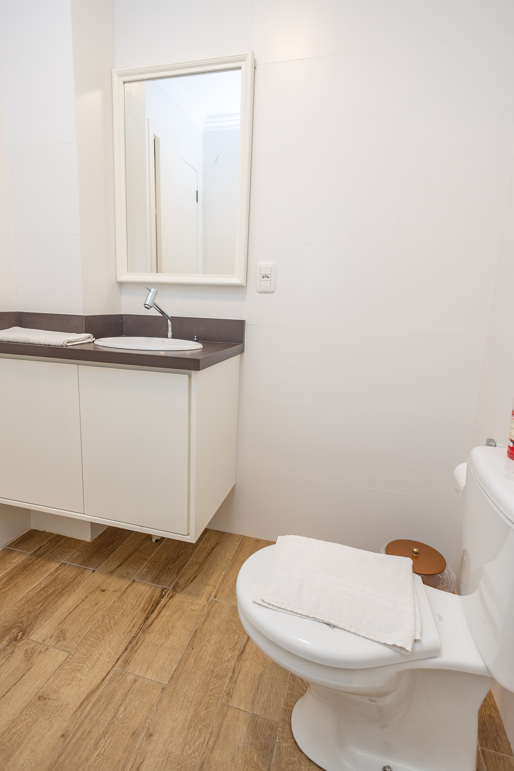 O imóvel conta com três banheiros - dois com chuveiro e um lavabo - facilitando a rotina de grupos maiores. Comodidades como Wi-Fi, ferro de passar e estacionamento privativo para dois carros em garagem completam a estrutura.