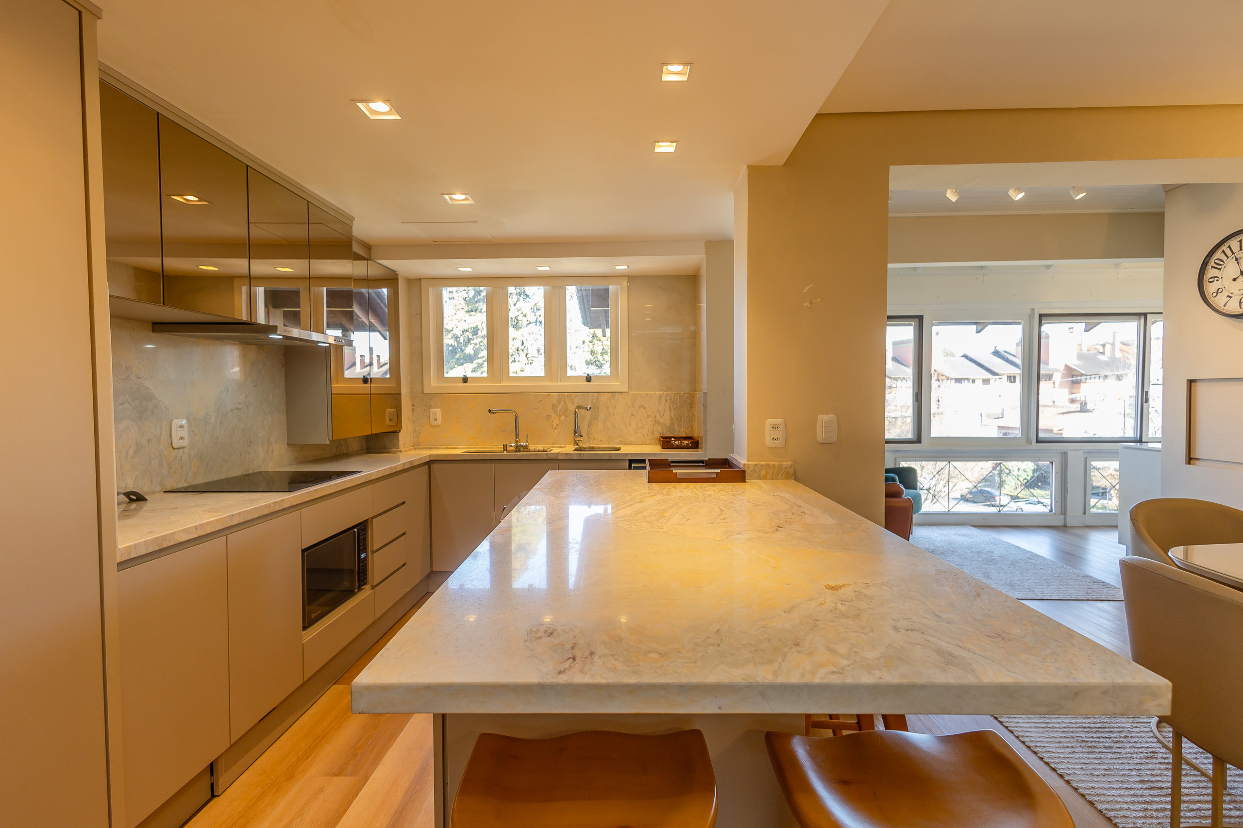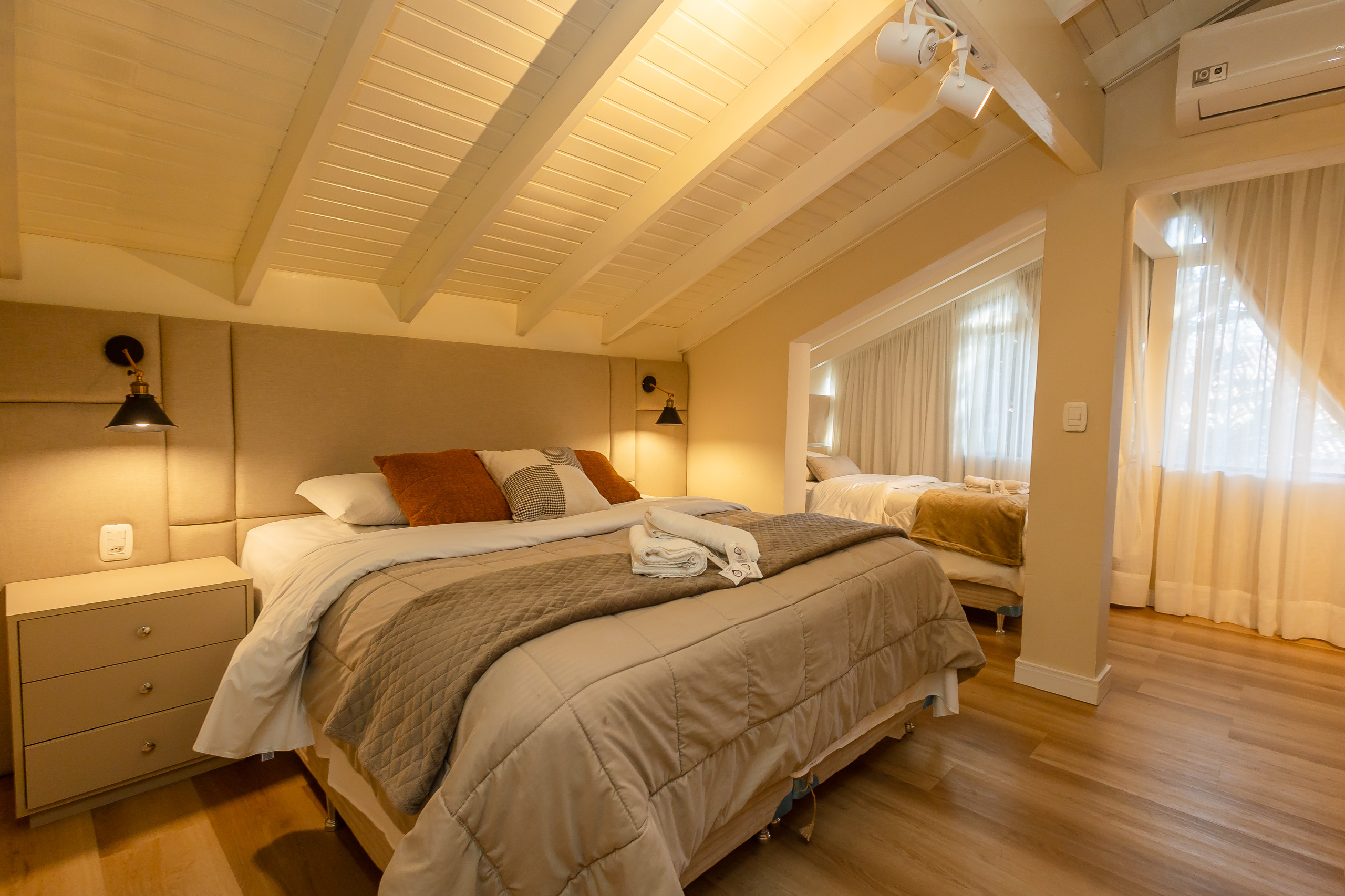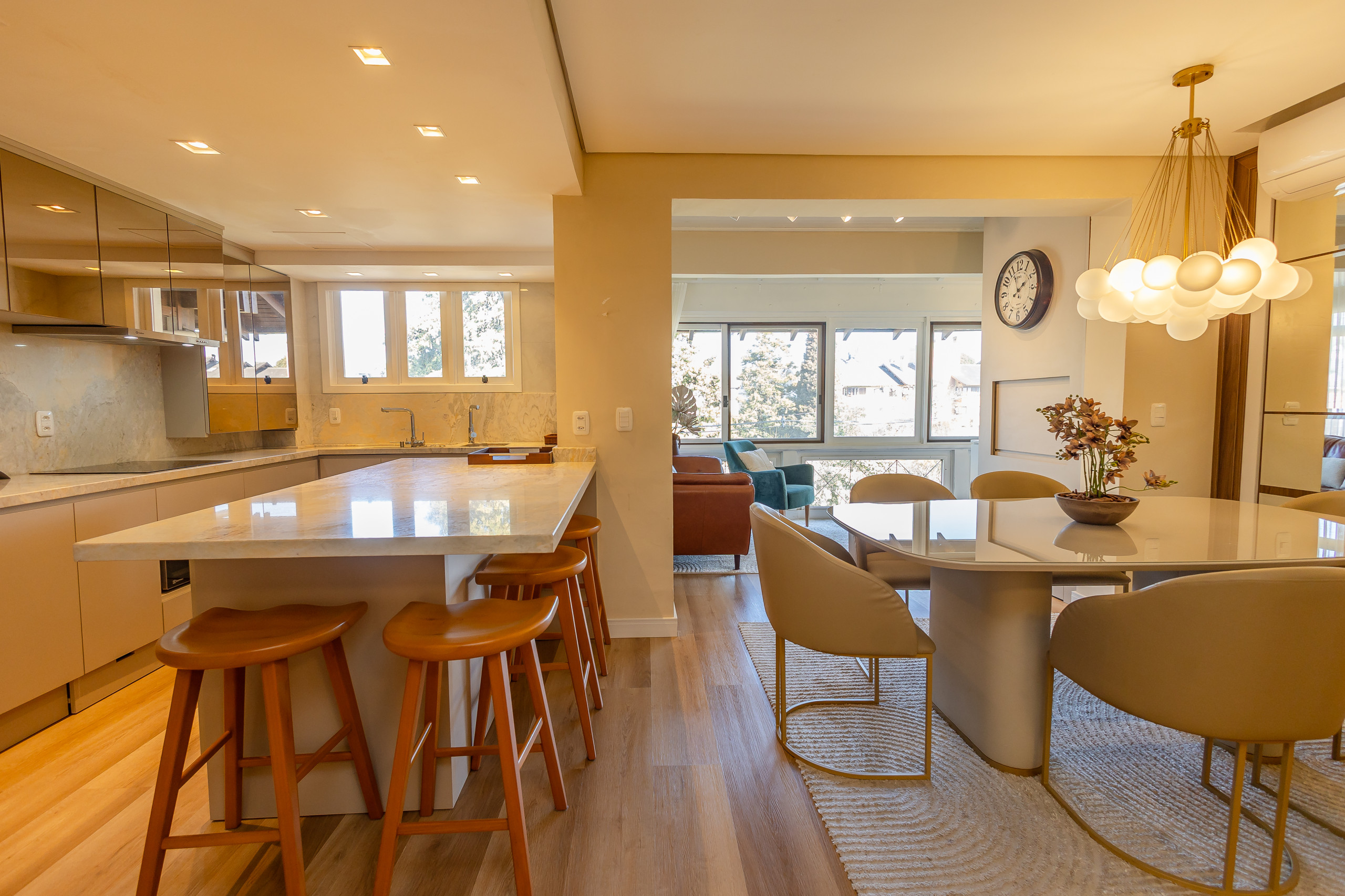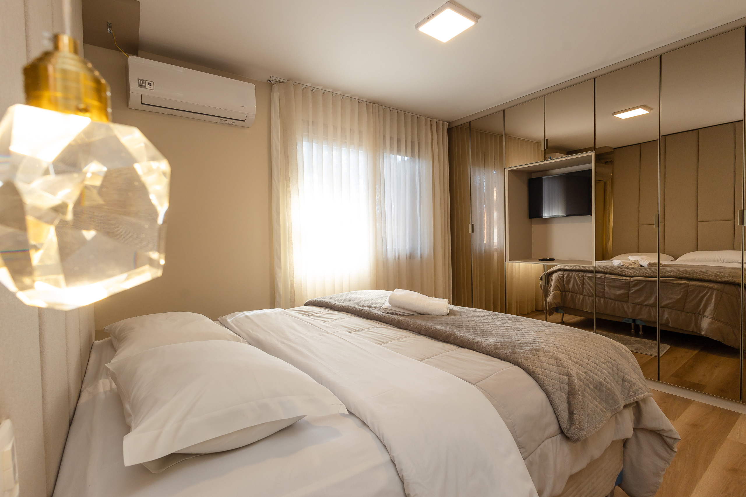 São 4 quartos e 4 banheiros (sendo 3 suítes, um dorm. e 1 banho social completo) climatizados com split Q/F e smart TV. Também conta com living climatizado com 4 ambientes (estar, jantar, cozinha americana completa e varanda fechada com vista para praça) com lareira e churrasqueira. Você ainda terá à sua disposição lava e seca, lava-louças, internet de alta velocidade e enxoval alto padrão completo para sua estadia.