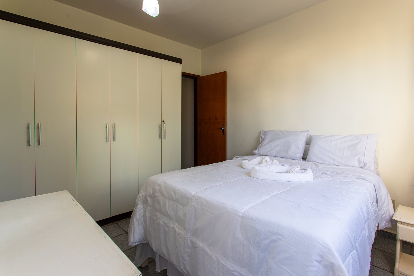 - Quarto 1 (suíte): cama de casal, ventilador de teto e banheiro privativo