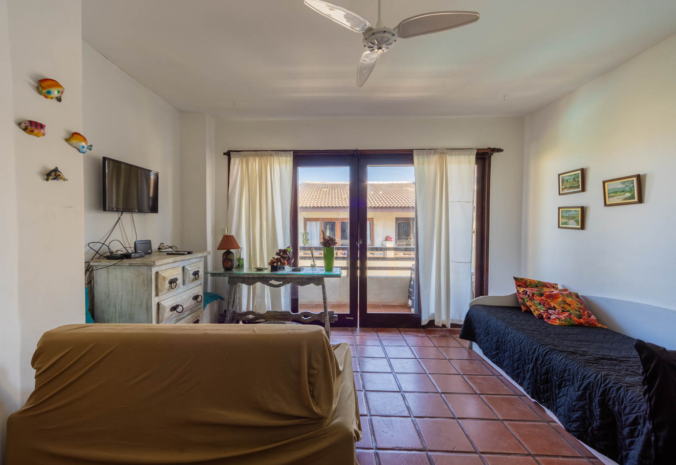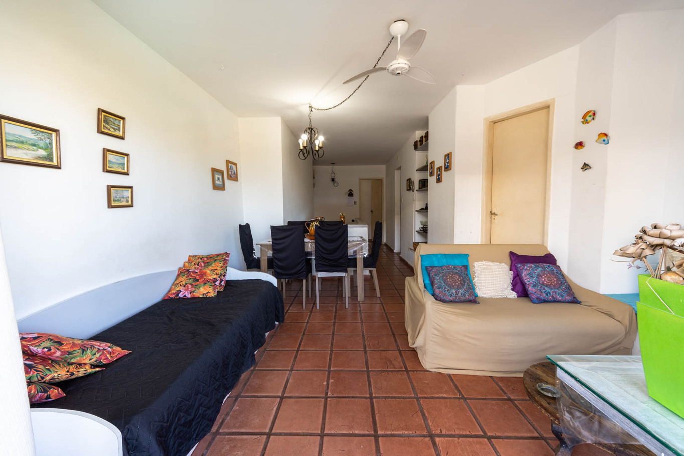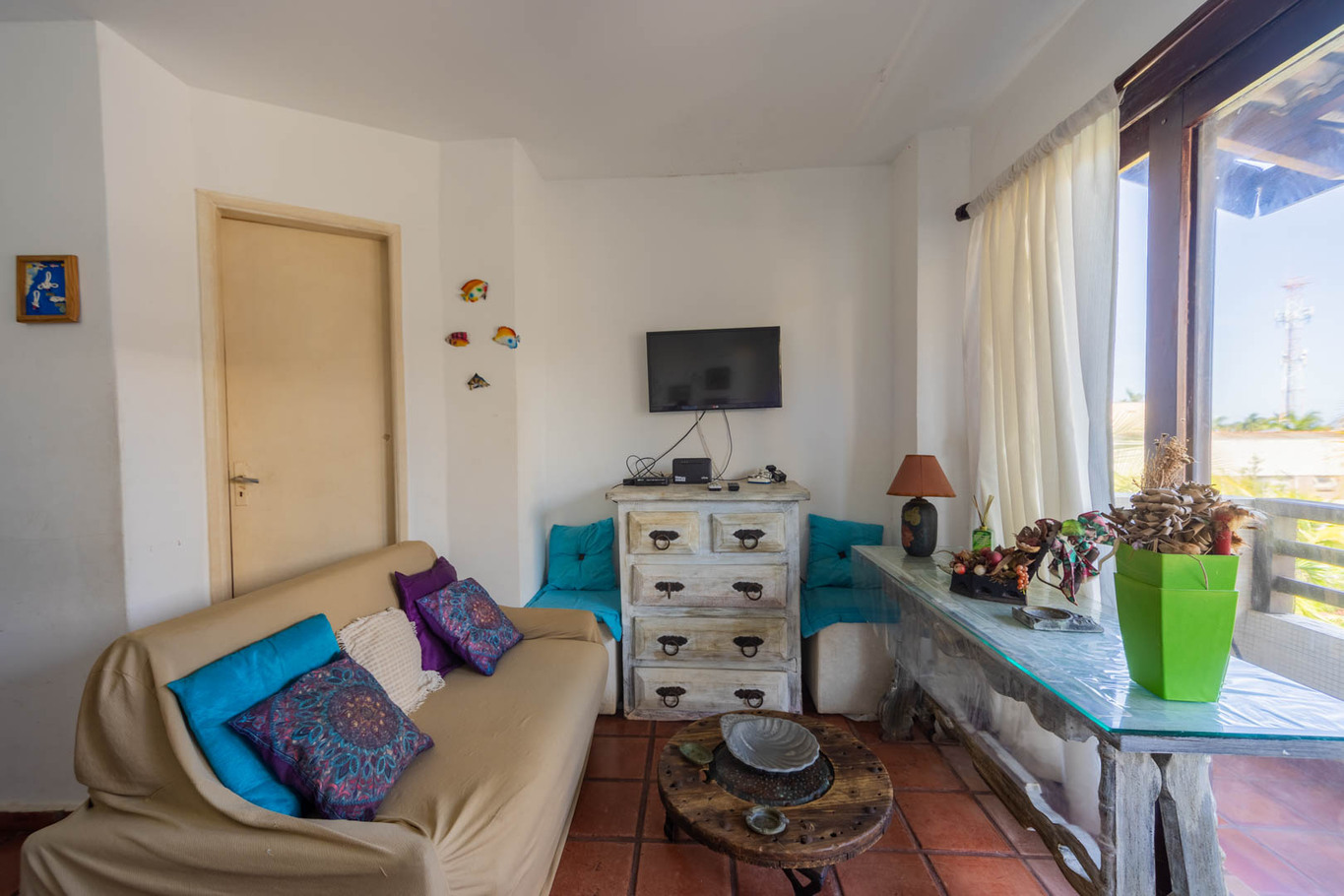 - Sala com sofá-cama, TV a cabo, mesa de jantar, ventiladores de teto e pé, churrasqueira privativa na varanda