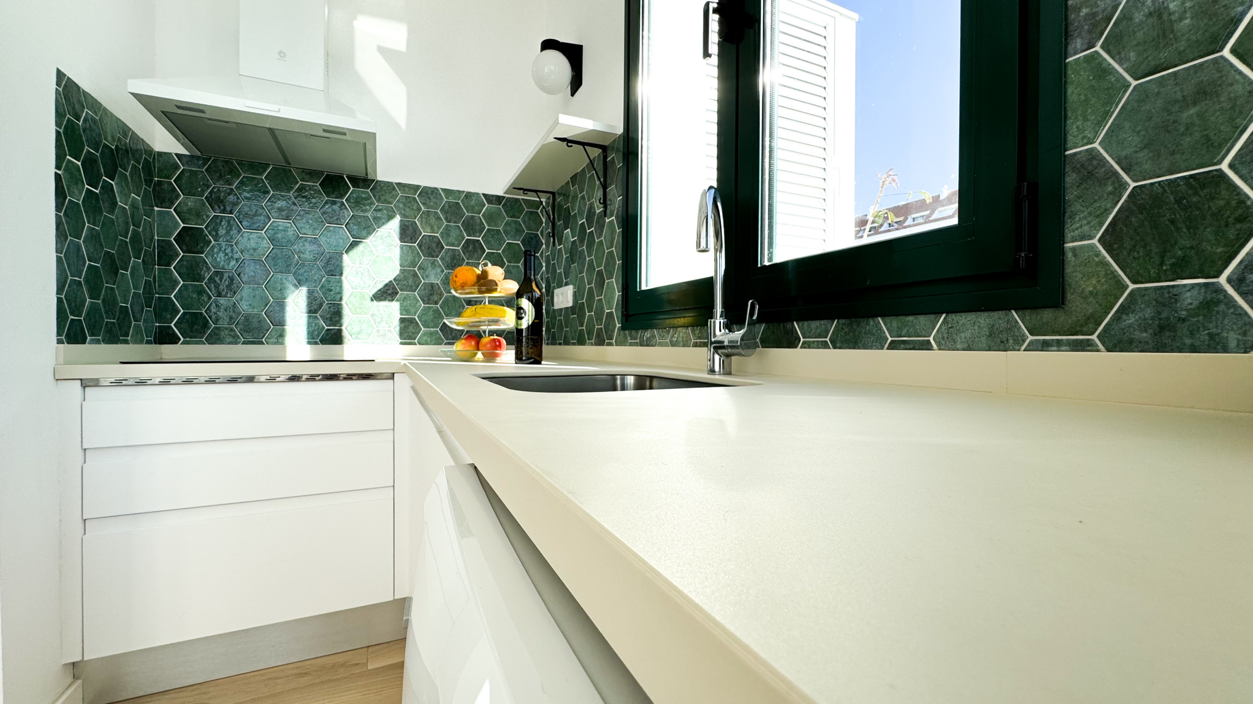 A cozinha independente, de vitrocerâmica, está equipada com geladeira, micro-ondas, forno, congelador, máquina de lavar louça, utensílios/cozinha, cafeteira, torradeira e jarro elétrico.