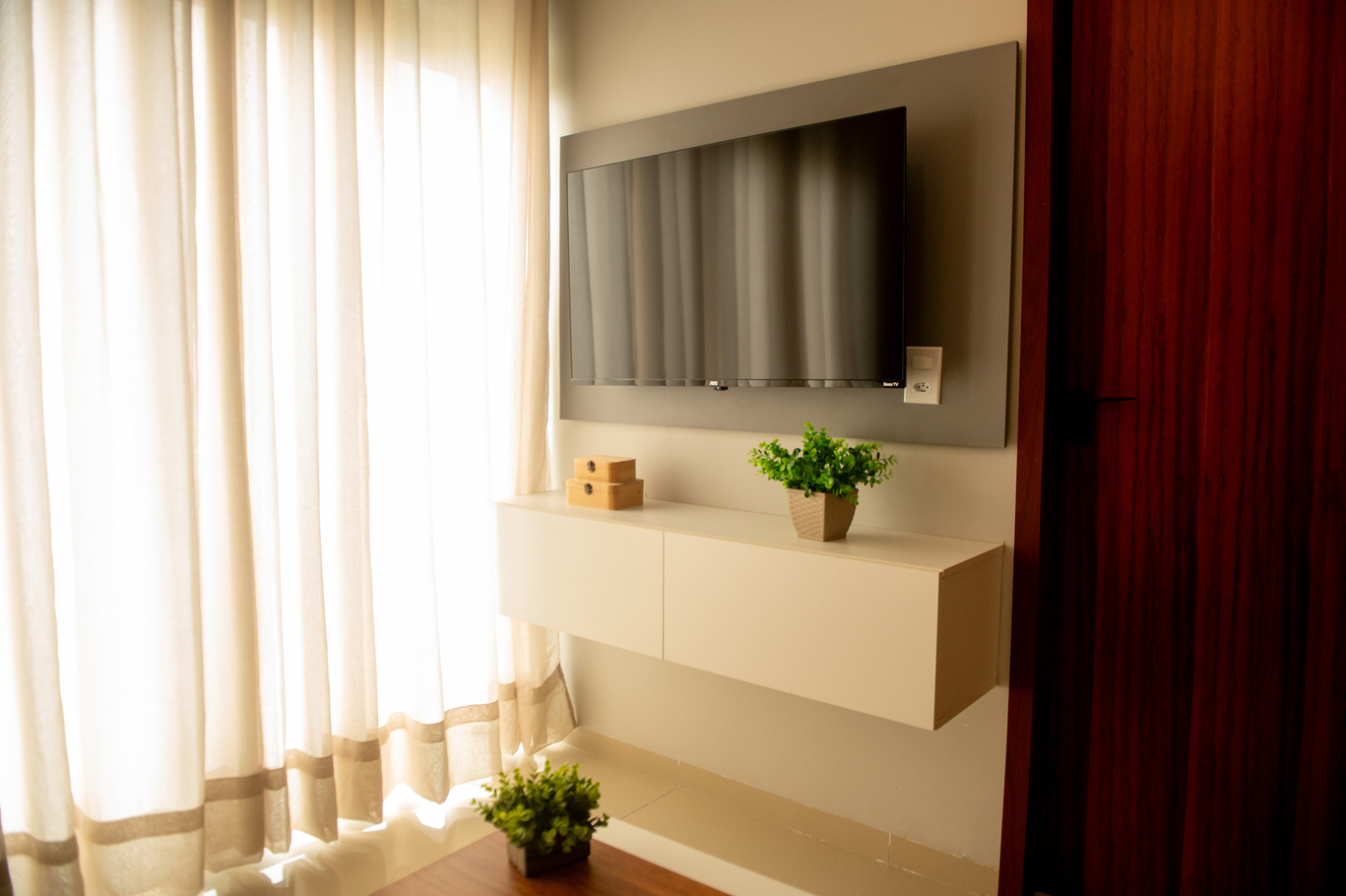 - Sala integrada à cozinha com sofá, Smart TV e varanda