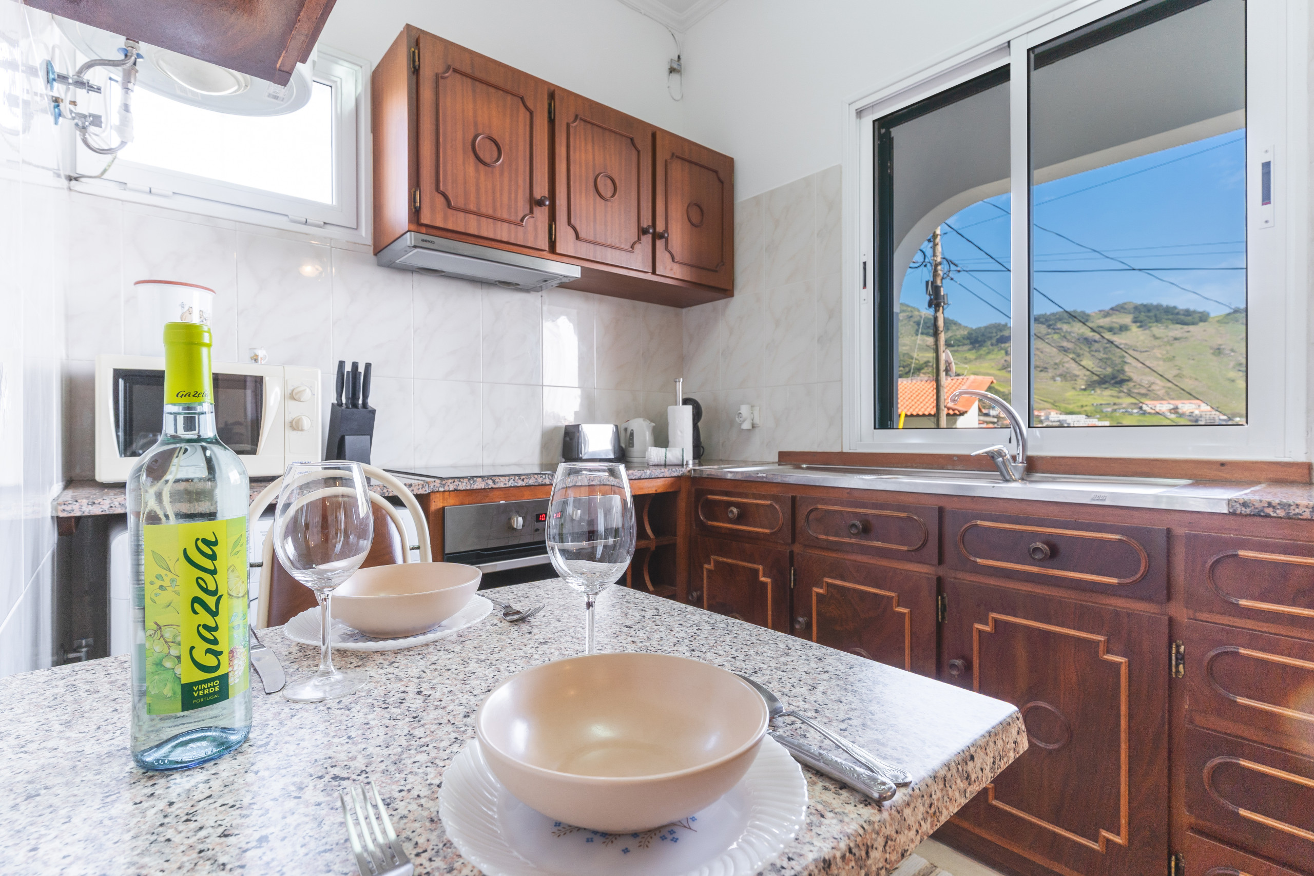 A cozinha, está equipada com geladeira, micro-ondas, forno, congelador, louça/talheres, utensílios/cozinha, cafeteira, torradeira, jarro elétrico, fogão, pratos e tigelas, utensílios de cozinha.
