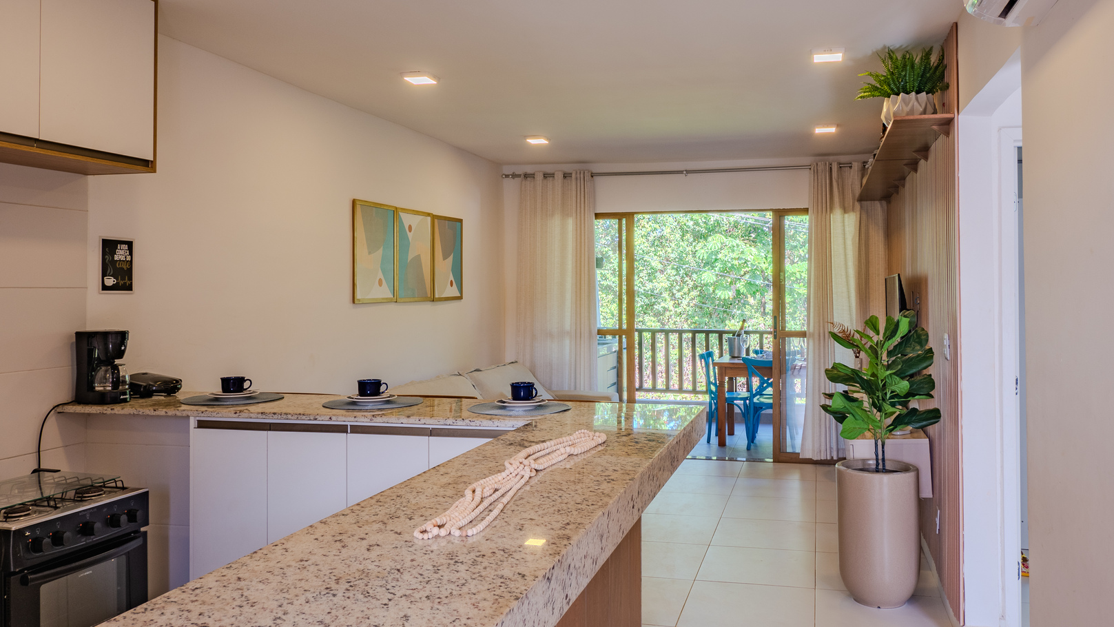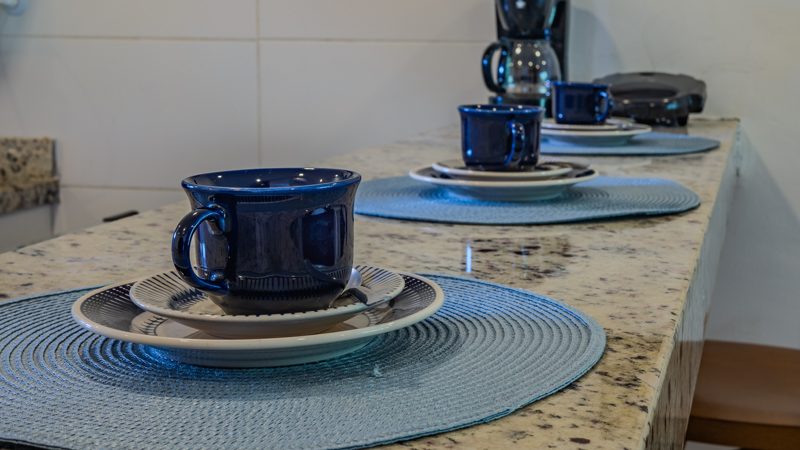 Cozinha equipada com fogão, forno, geladeira, freezer, micro-ondas, cafeteira, fritadeira, torradeira, liquidificador e utensílios(exceto óleo e sal)