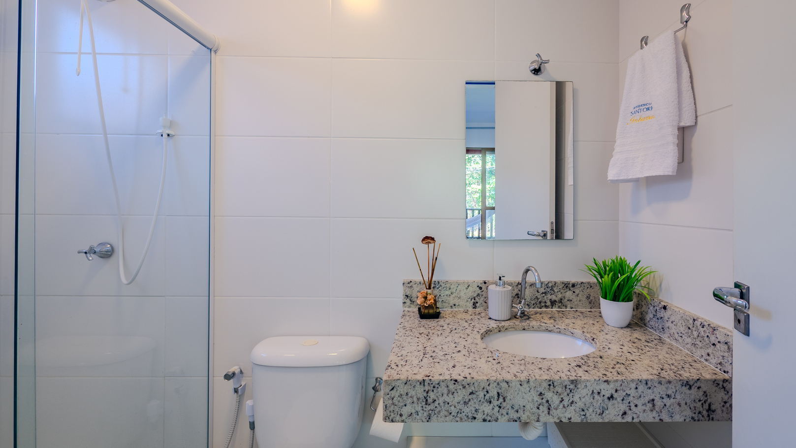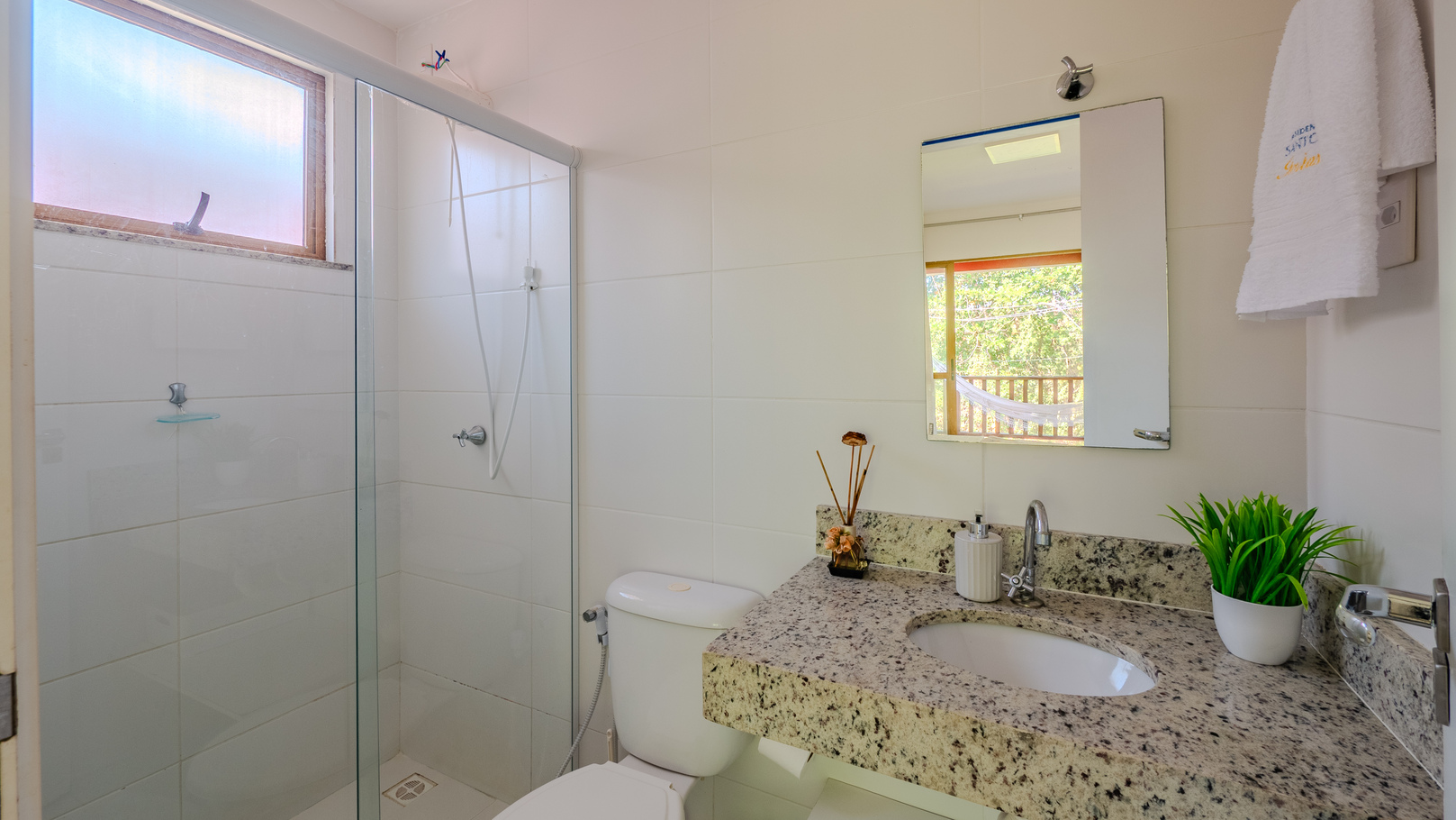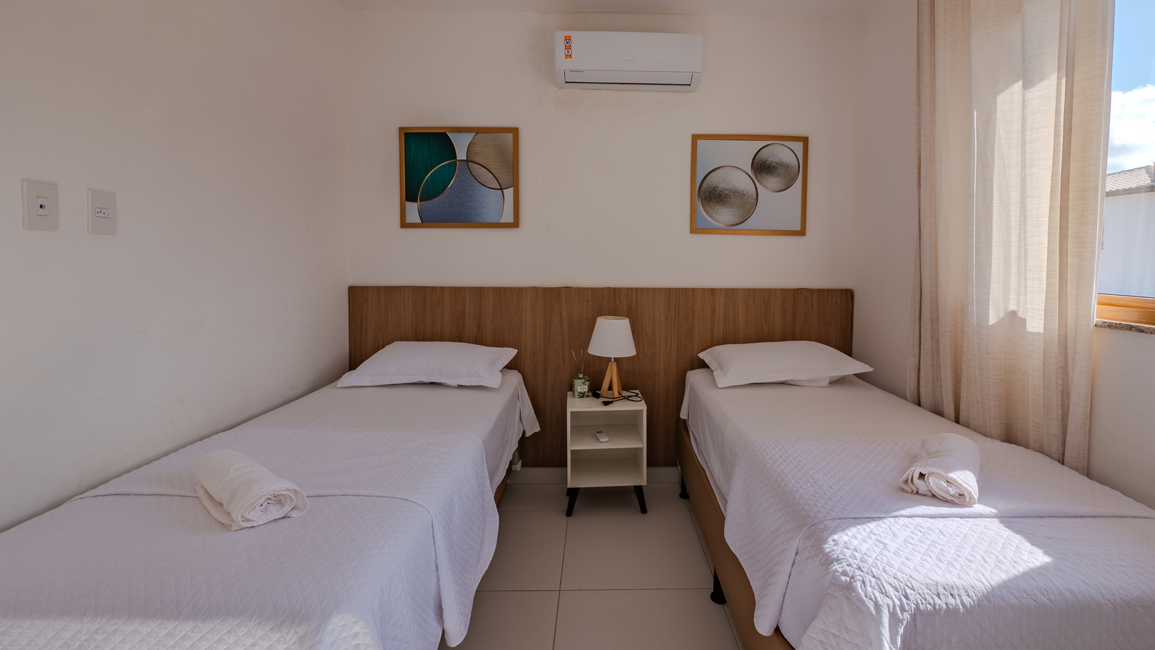 - Quarto 1 (suíte): cama de casal, ar-condicionado, armário, edredom e banheiro privativo com chuveiro elétrico, box de vidro/acrílico e secador de cabelo