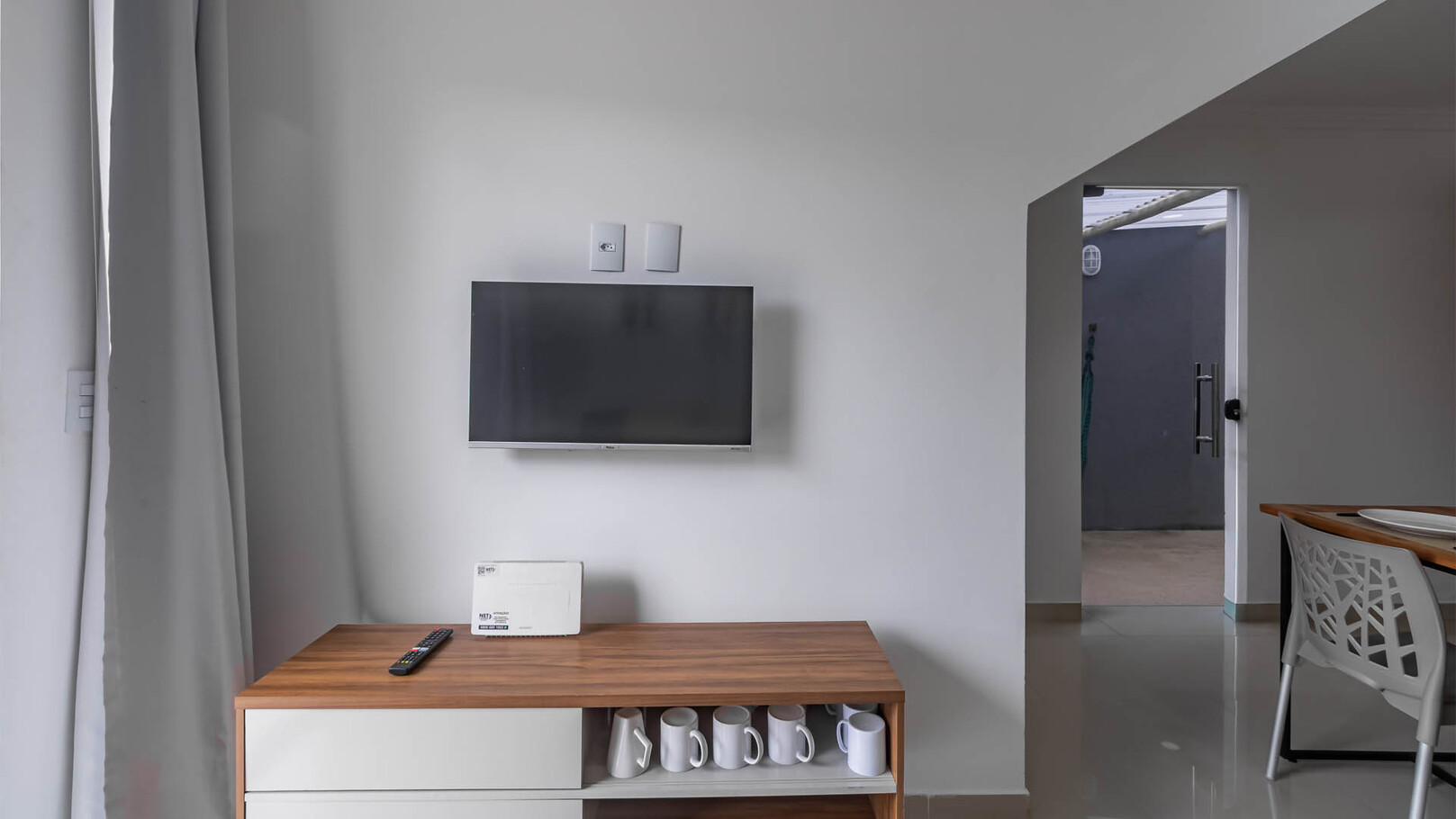 - Sala com Smart TV, sofá-cama e ventilador de chão