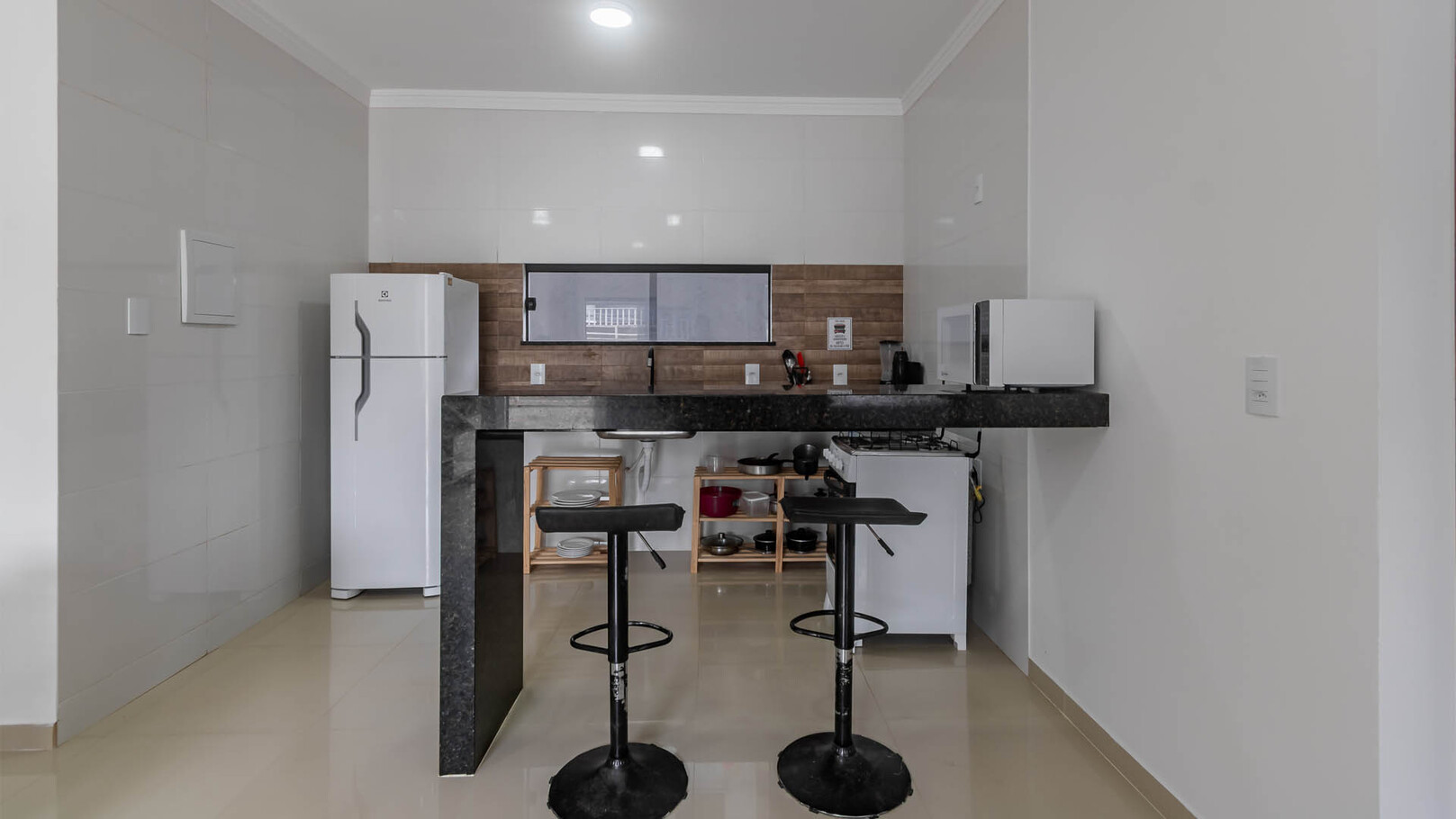 - Cozinha equipada com geladeira, fogão, forno, micro-ondas, torradeira, freezer e utensílios diversos(exceto óleo e sal)