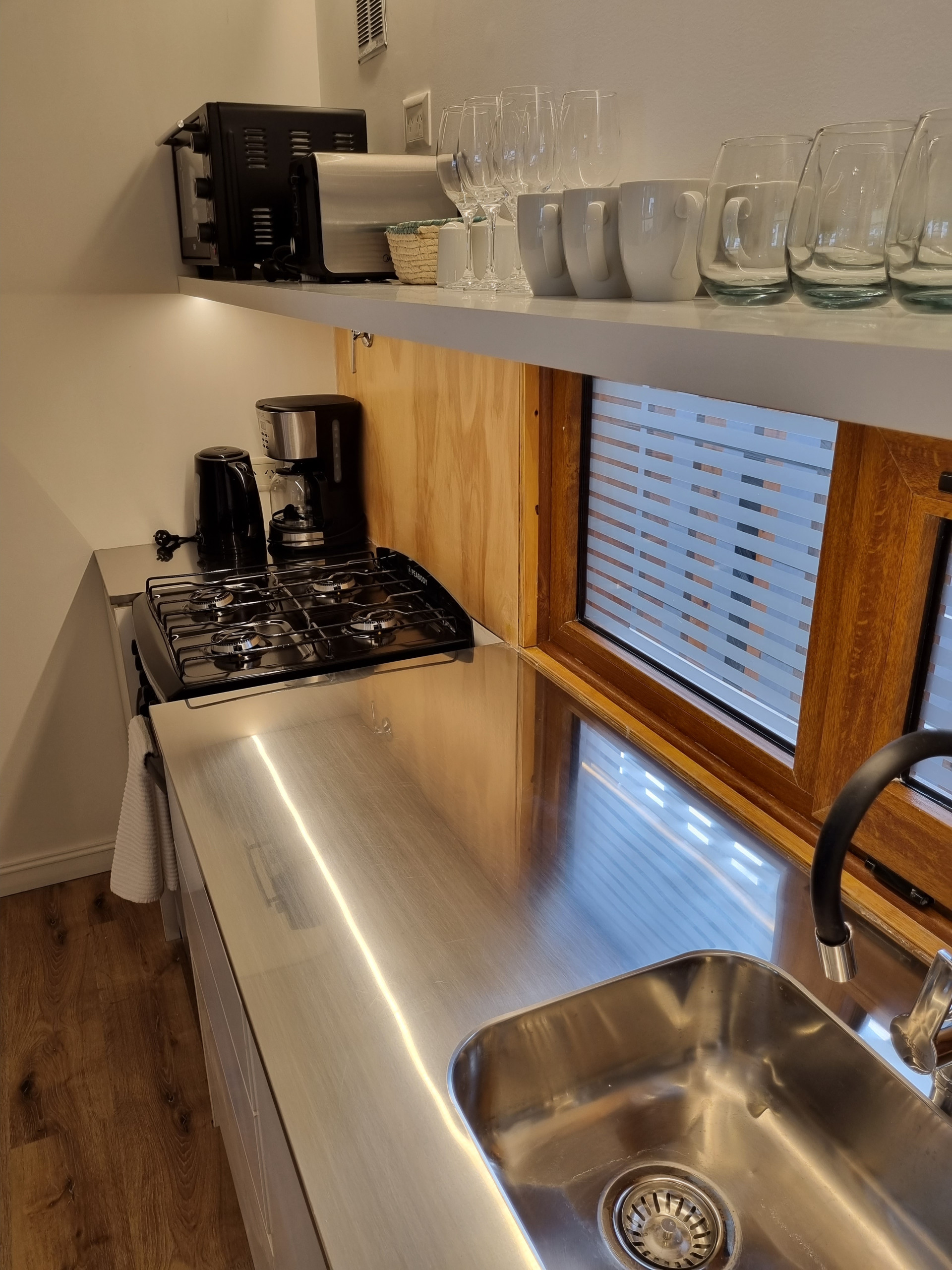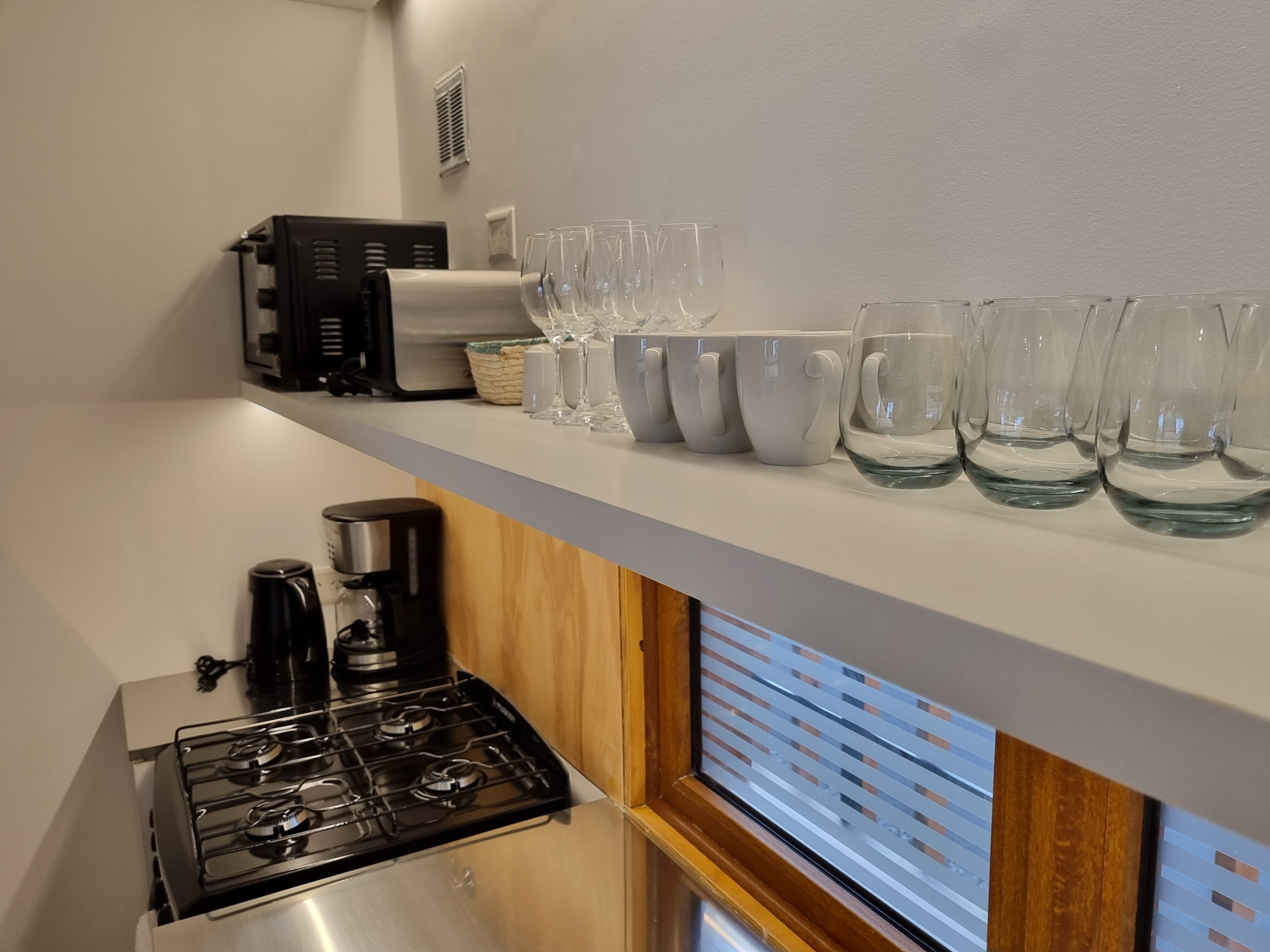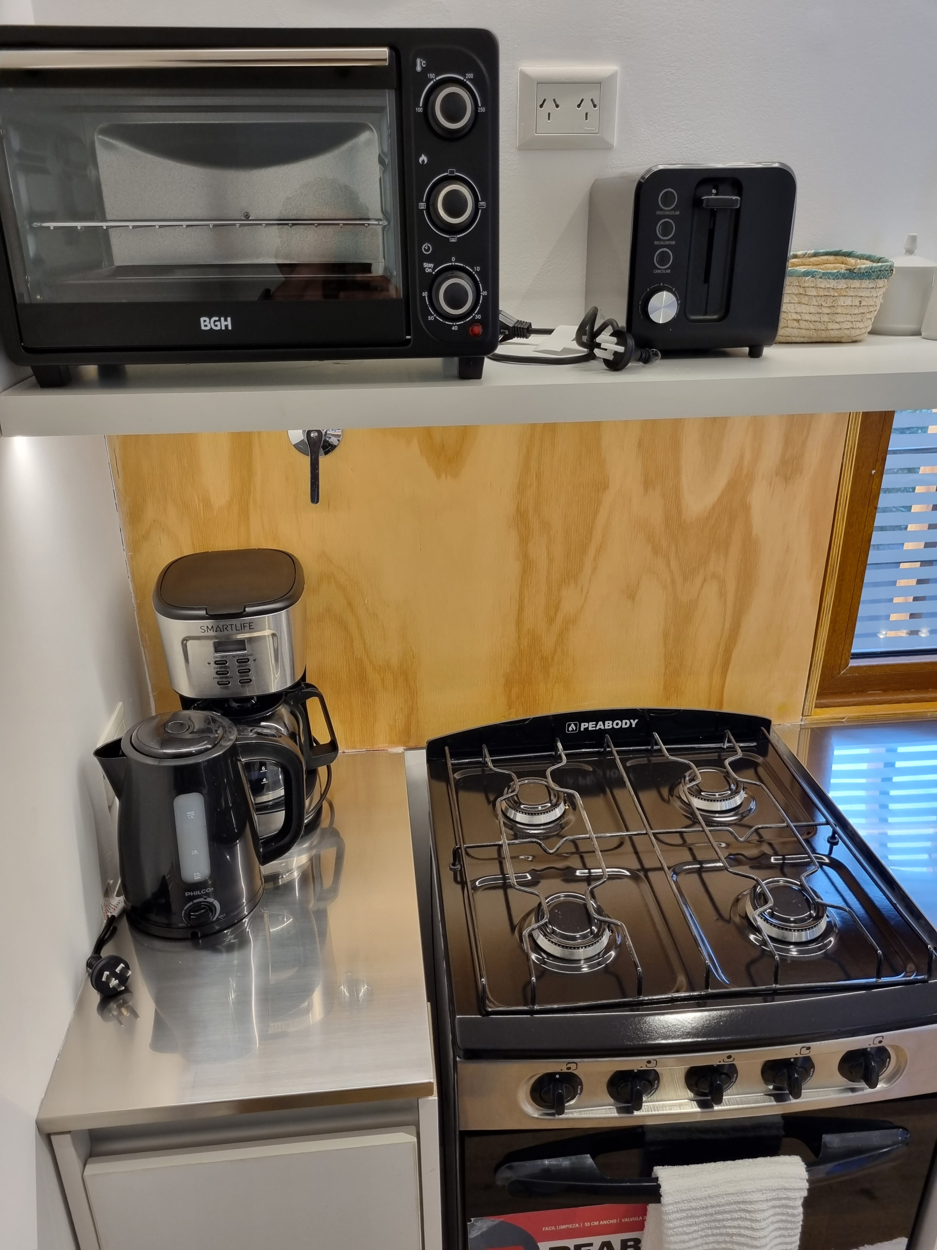 A cozinha americana, de gás, está equipada com geladeira, micro-ondas, louça/talheres, utensílios/cozinha, cafeteira, torradeira e jarro elétrico.