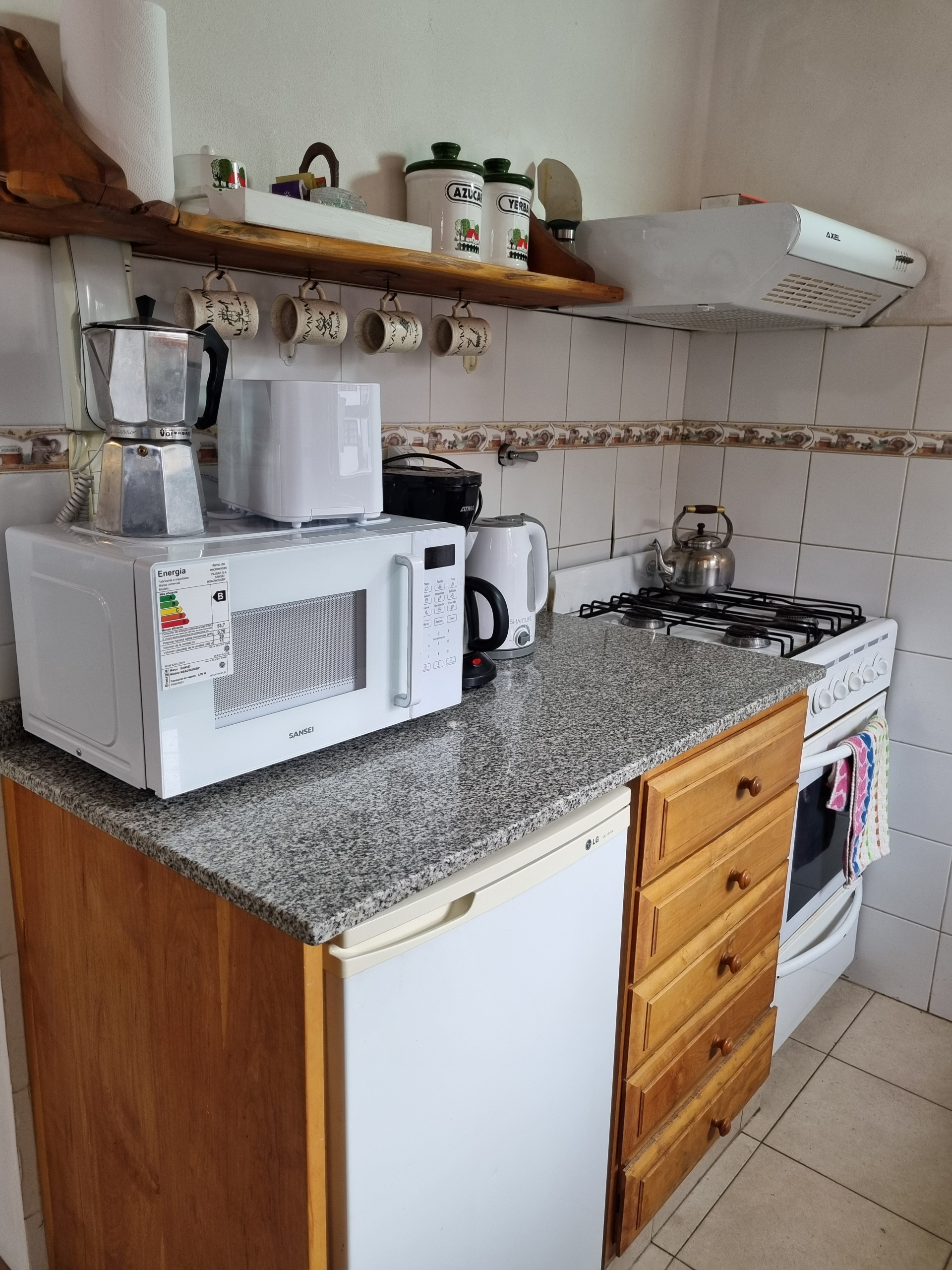 A cozinha americana, de gás, está equipada com geladeira, micro-ondas, forno, congelador, louça/talheres, utensílios/cozinha, cafeteira, torradeira e jarro elétrico.