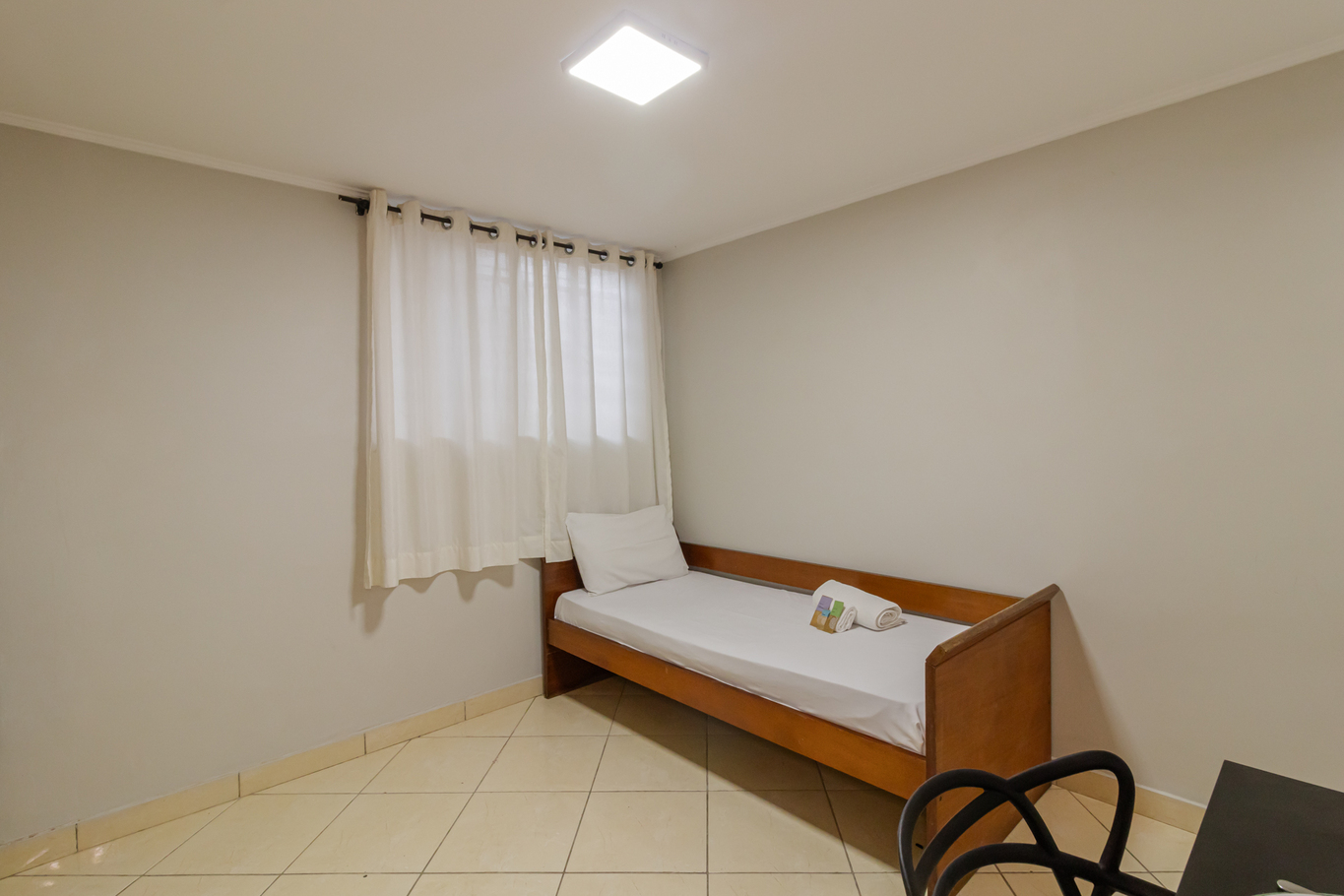 - Quarto com cama de solteiro, armário, mesa multifuncional, protetor de colchão e ventilador de teto