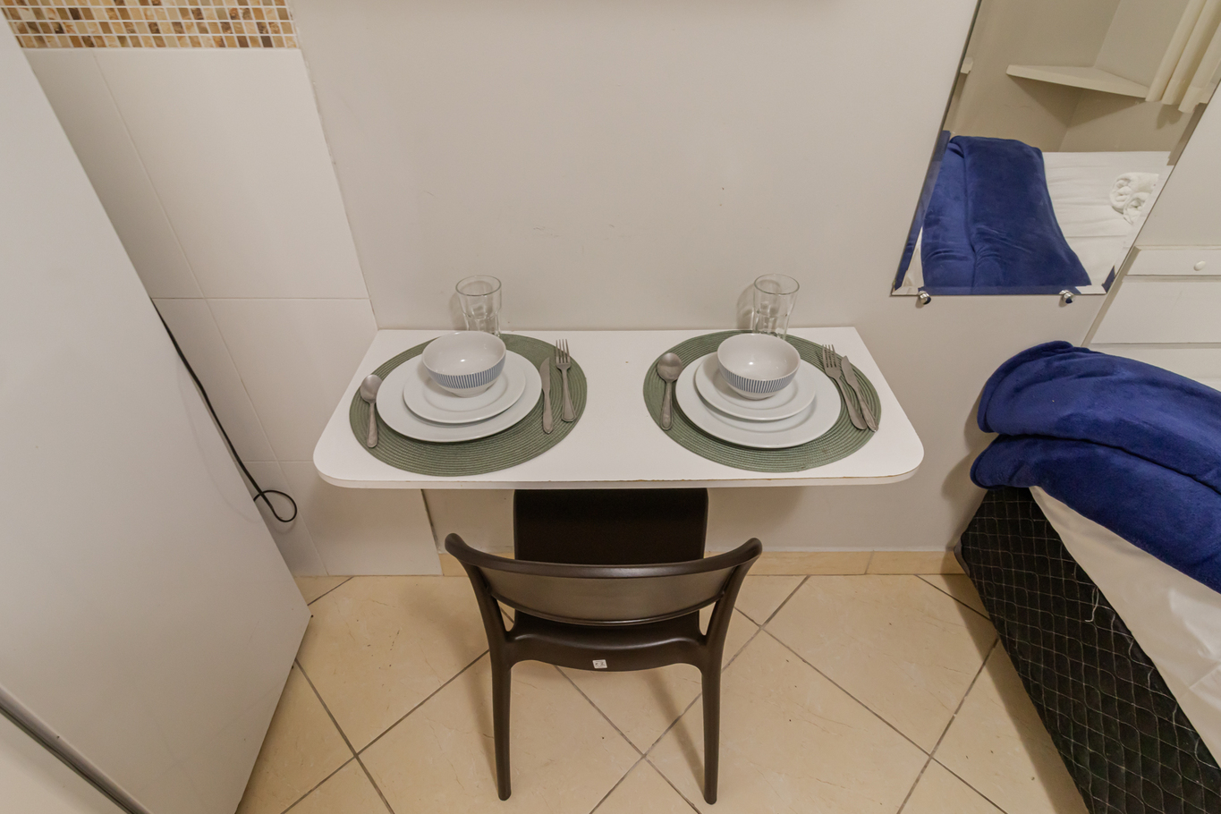 - Quarto com cama de casal, armário, mesa multifuncional, protetor de colchão e ventilador de teto