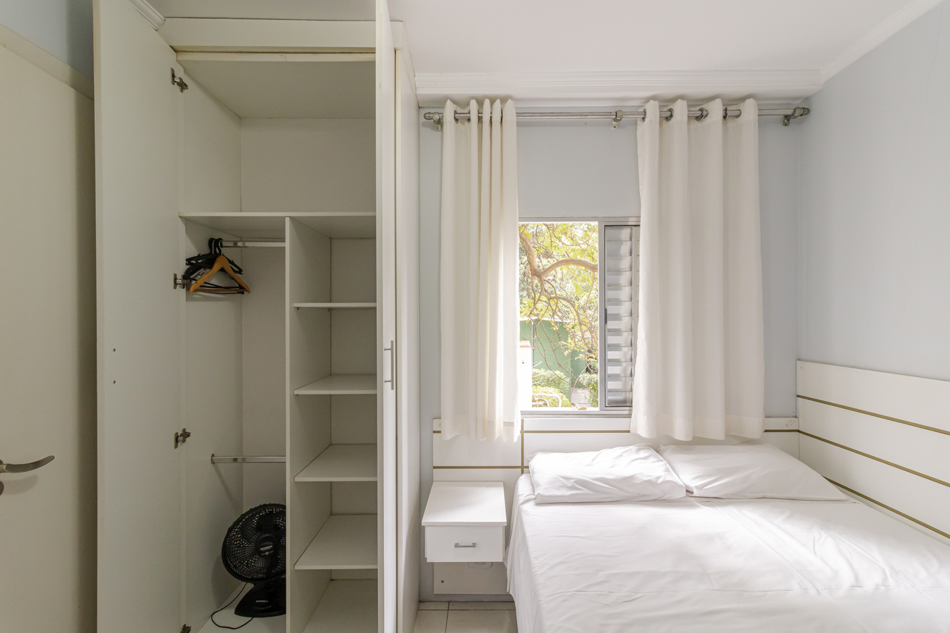 - Quarto com cama de solteiro, armário, mesa multifuncional, protetor de colchão e ventilador de teto