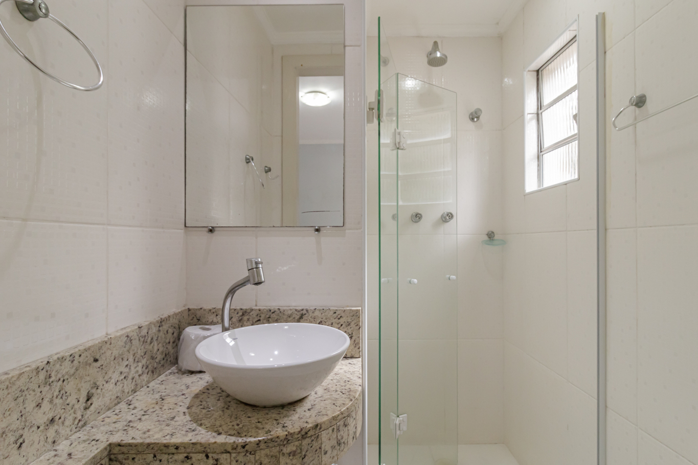 - Banheiro com chuveiro elétrico, box de vidro/acrílico e secador de cabelo (sob demanda)