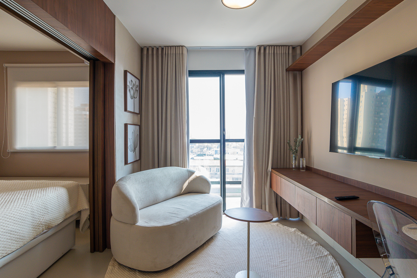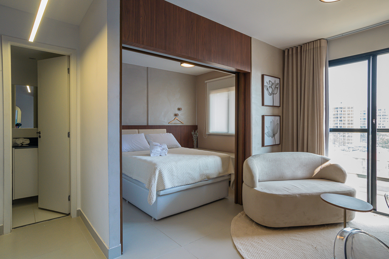 Descubra São Paulo em grande estilo, hospedando-se em um apartamento moderno e acolhedor no Edifício Innovare Morumbi. Pensado para até 2 pessoas, é o refúgio perfeito para quem busca praticidade sem abrir mão do conforto: quarto climatizado com smart TV, internet rápida e cozinha equipada para suas refeições. A experiência fica ainda melhor com a fechadura eletrônica e as comodidades do condomínio, que incluem academia e salão de jogos