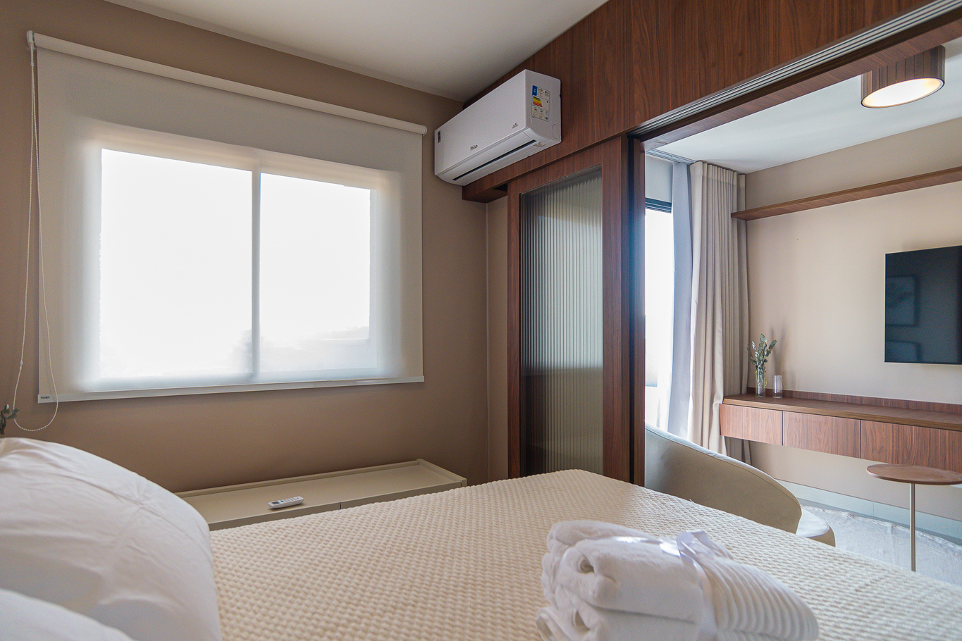 - Quarto com cama de casal, ar-condicionado, armário e smart TV