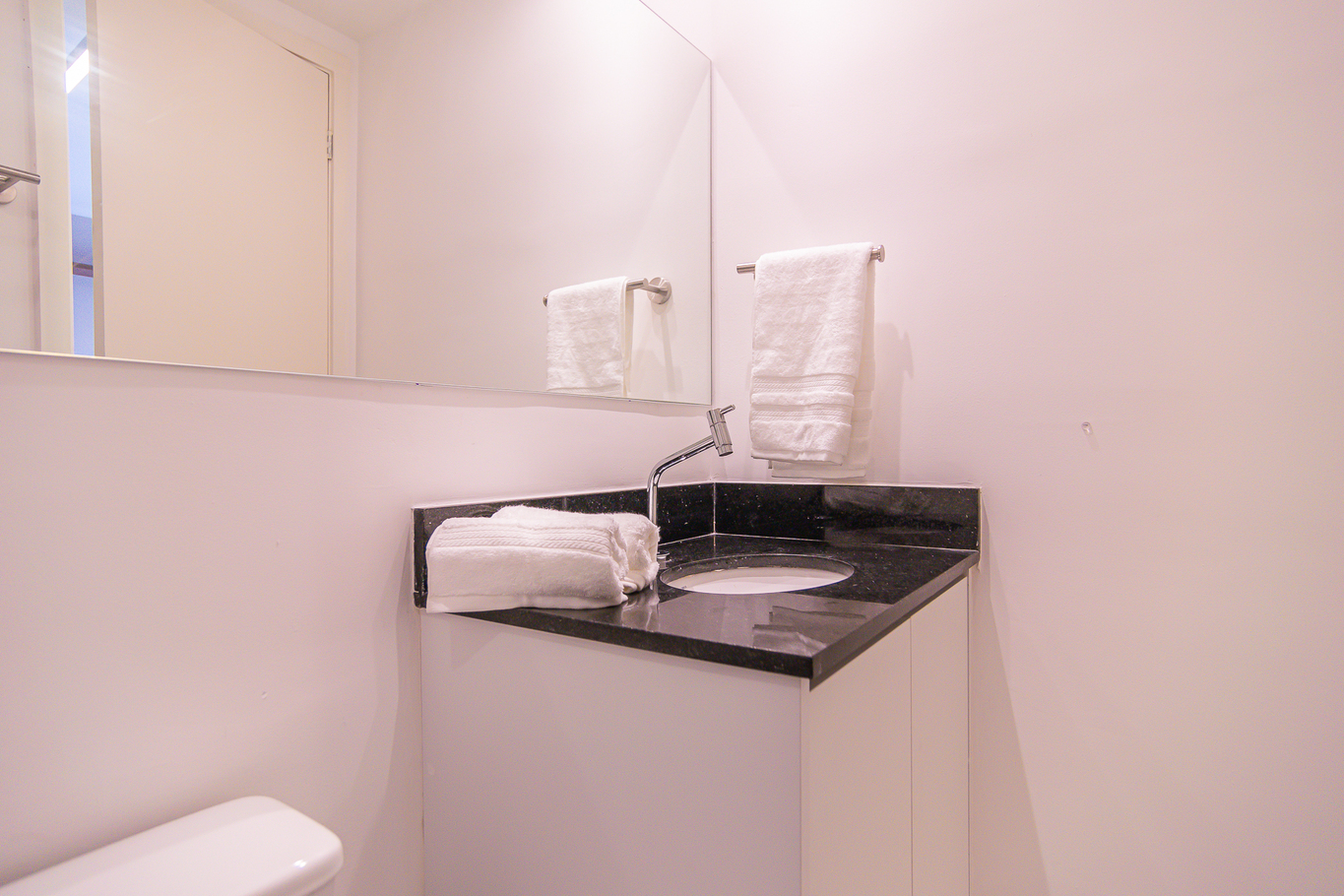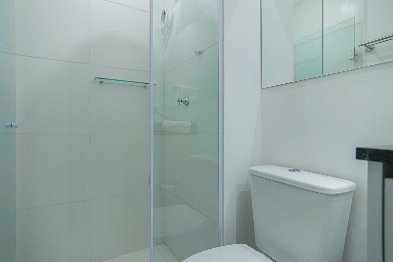 - Banheiro com box de vidro, chuveiro elétrico e secador de cabelo