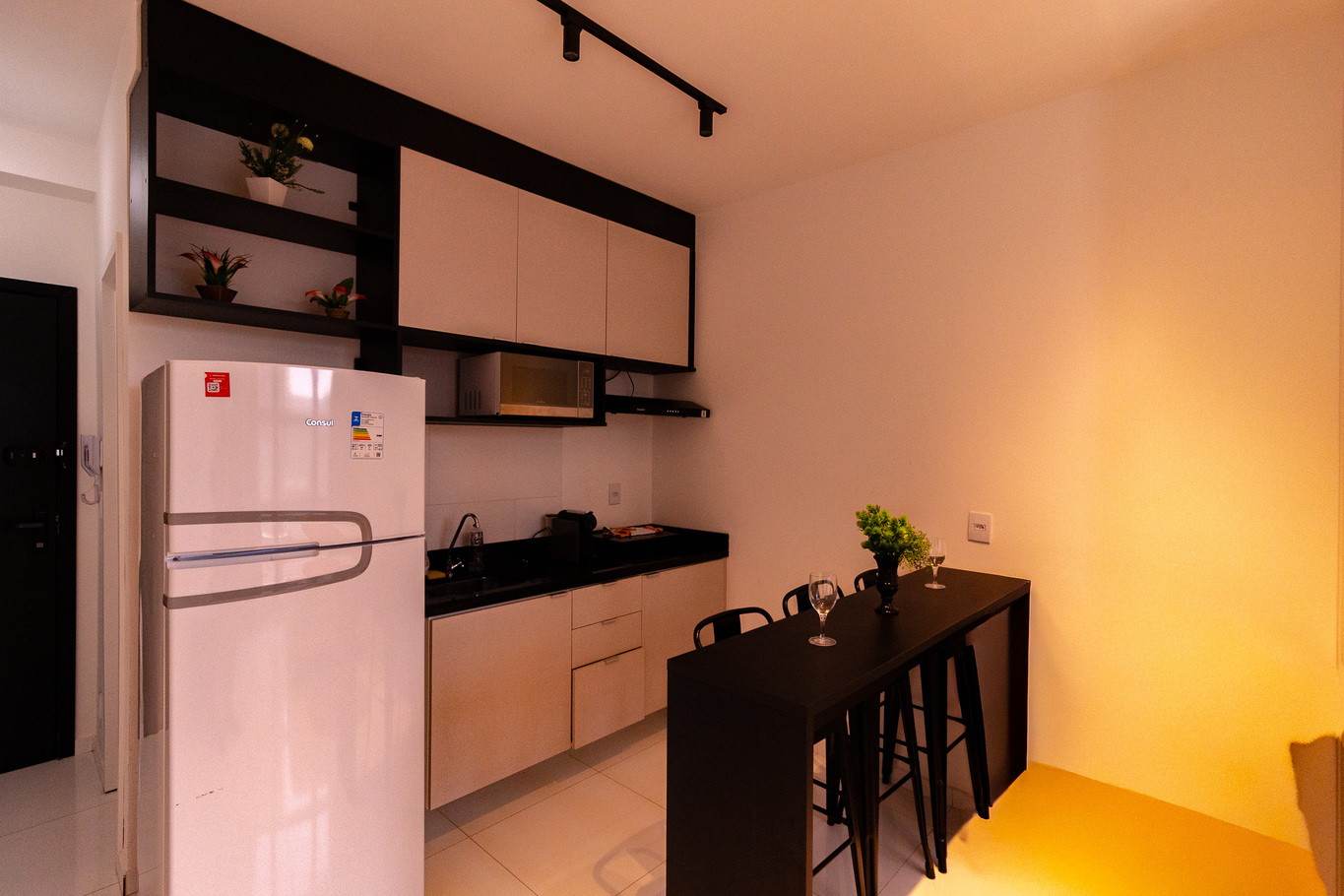 - Cozinha equipada com fogão, geladeira, microondas, cafeteira, freezer, utensílios e itens básicos de limpeza