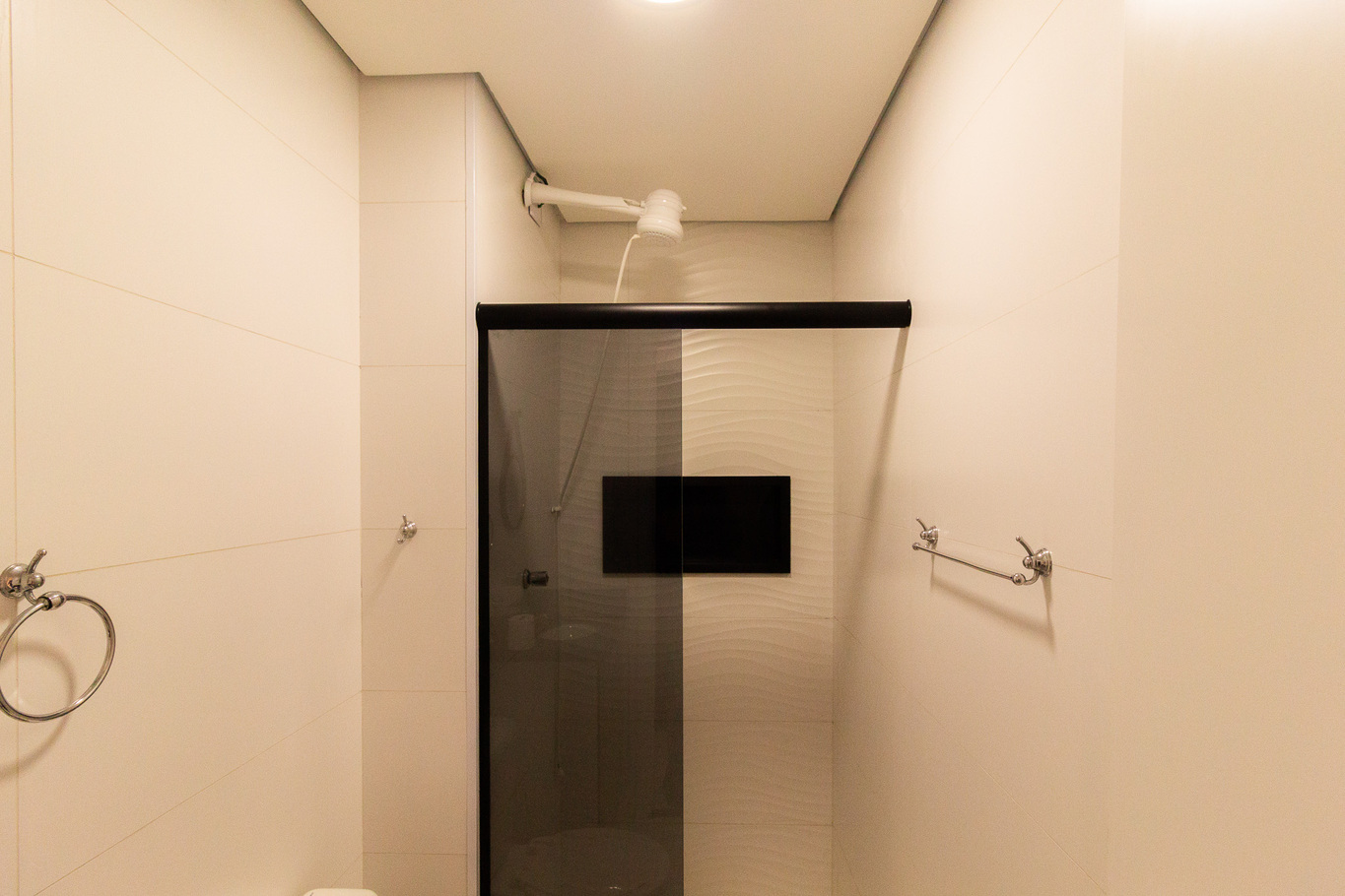 - Banheiro com box de vidro, chuveiro elétrico e secador de cabelo