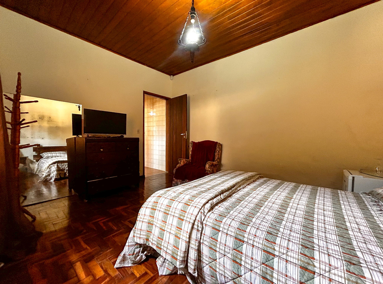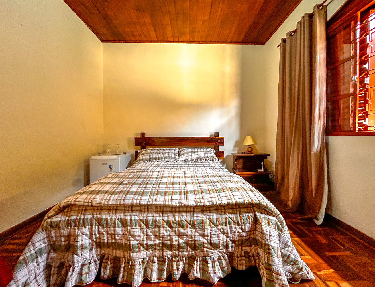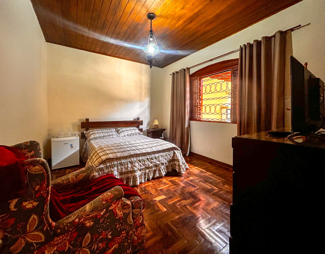 - Quarto 1(suíte) com cama de casal, Smart TV, frigobar, armário, piso de madeira, cortina blackout e banheiro com chuveiro elétrico e box de vidro