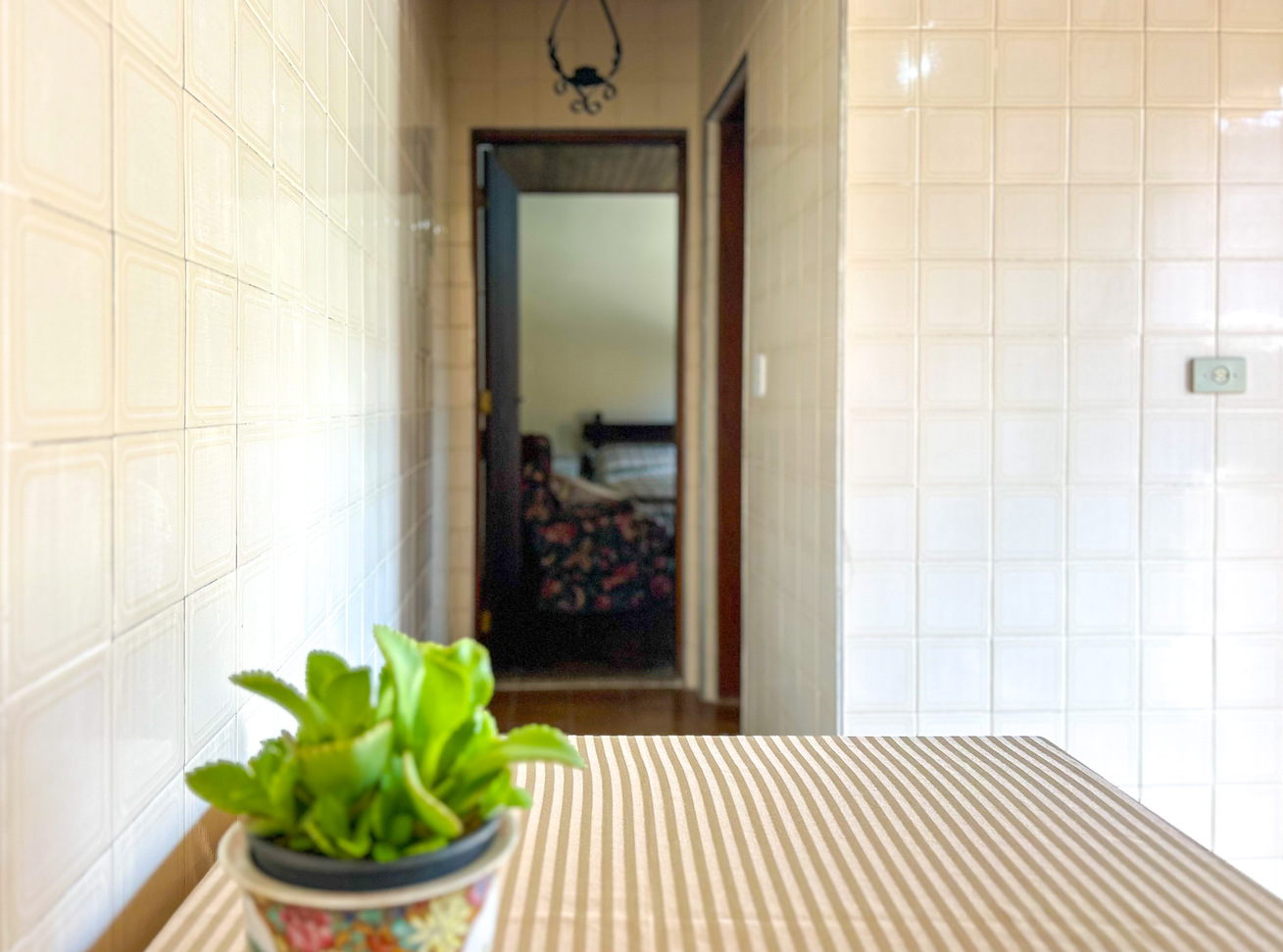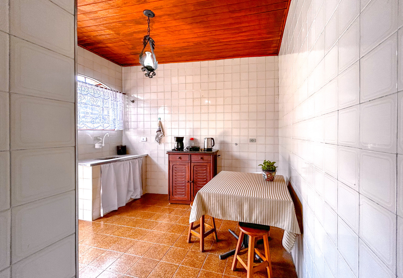 - Cozinha equipada com fogão elétrico, cafeteira e utensílios básicos