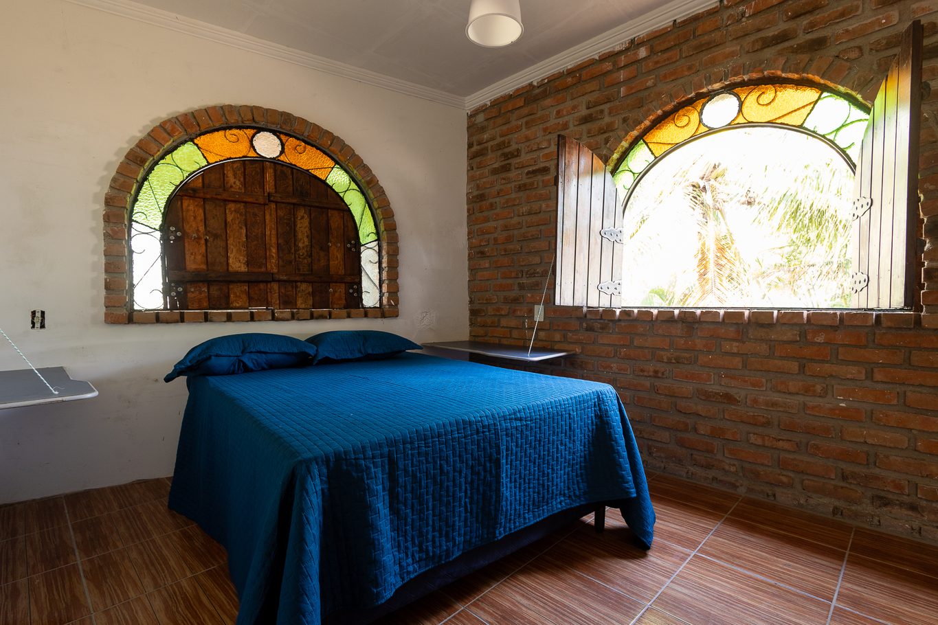 - Quarto 1: cama de casal, armário de bancada e ventilador de teto