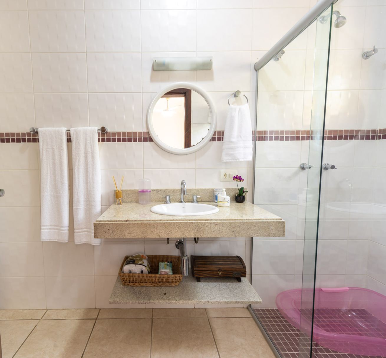 - Suíte 1: cama de casal, cama de solteiro, armário, ventilador de teto, banheiro privativo com chuveiro elétrico (sem box).