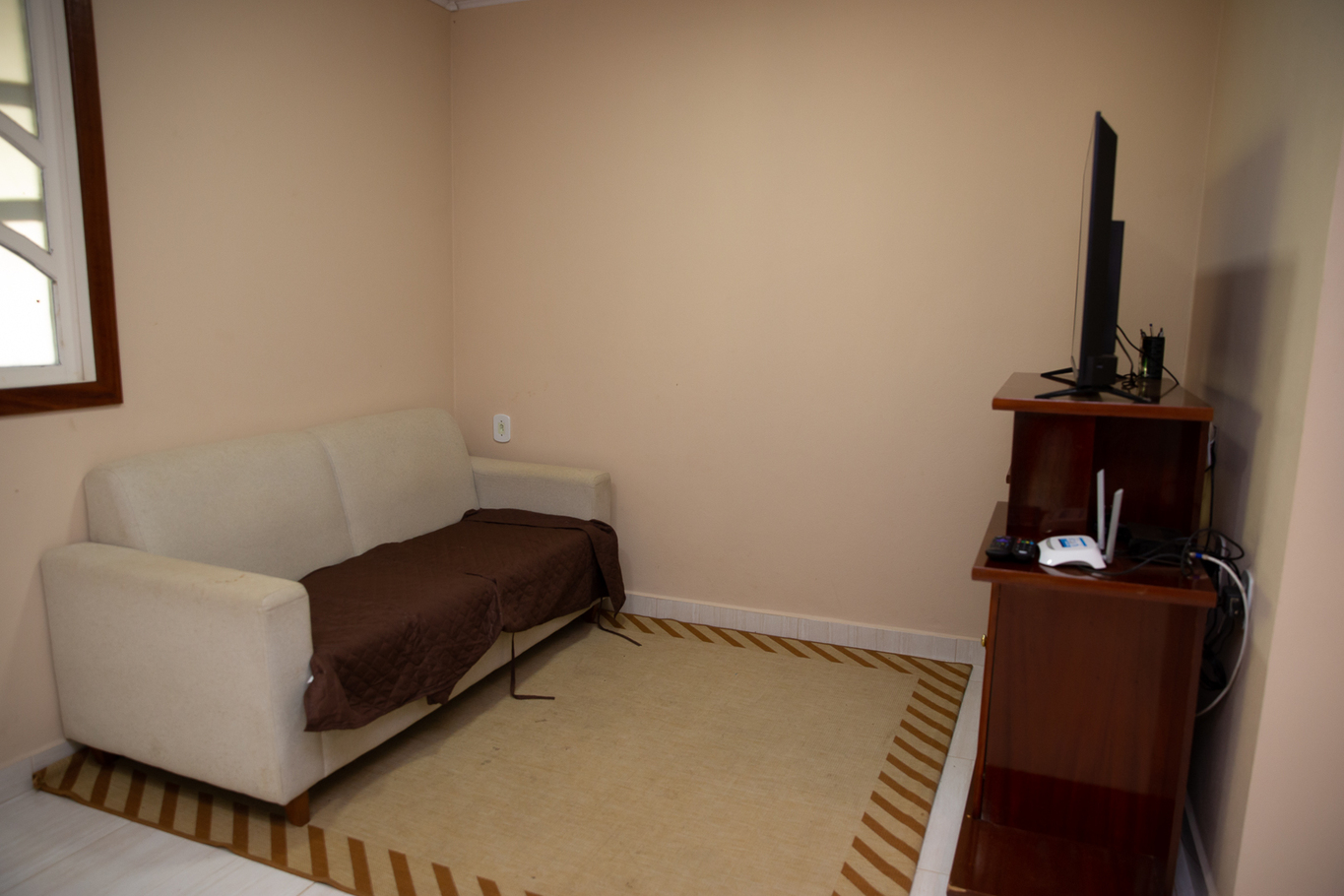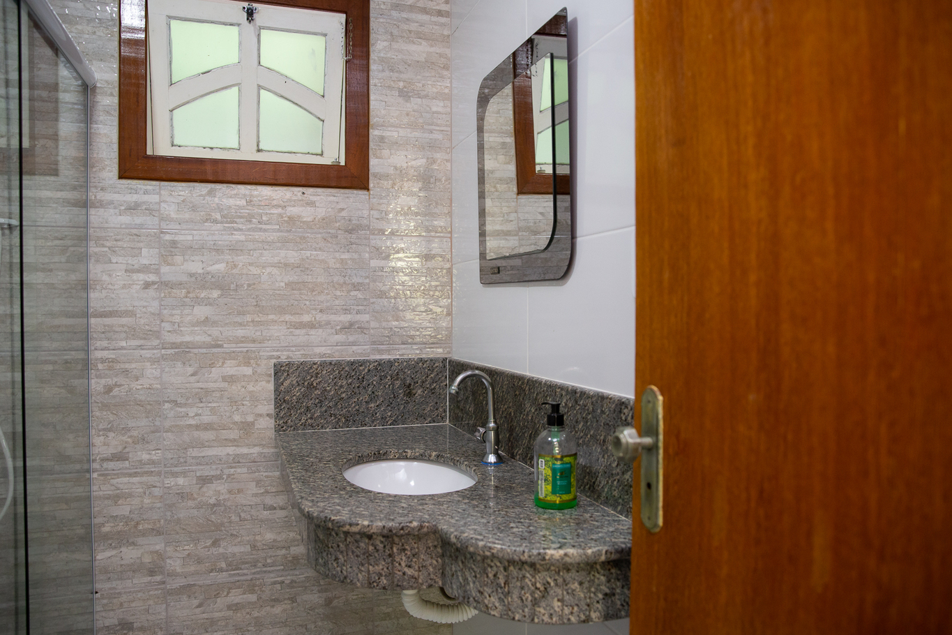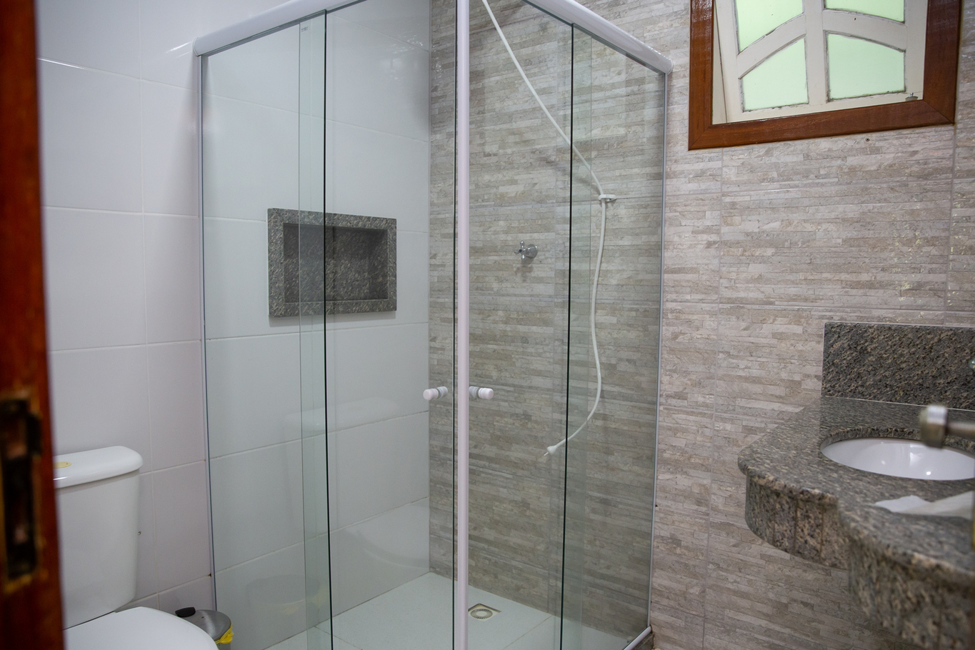 - Quarto 3(suíte): 1 cama de casal, ar-condicionado, smart TV, armário e banheiro privativo com box de vidro e chuveiro elétrico