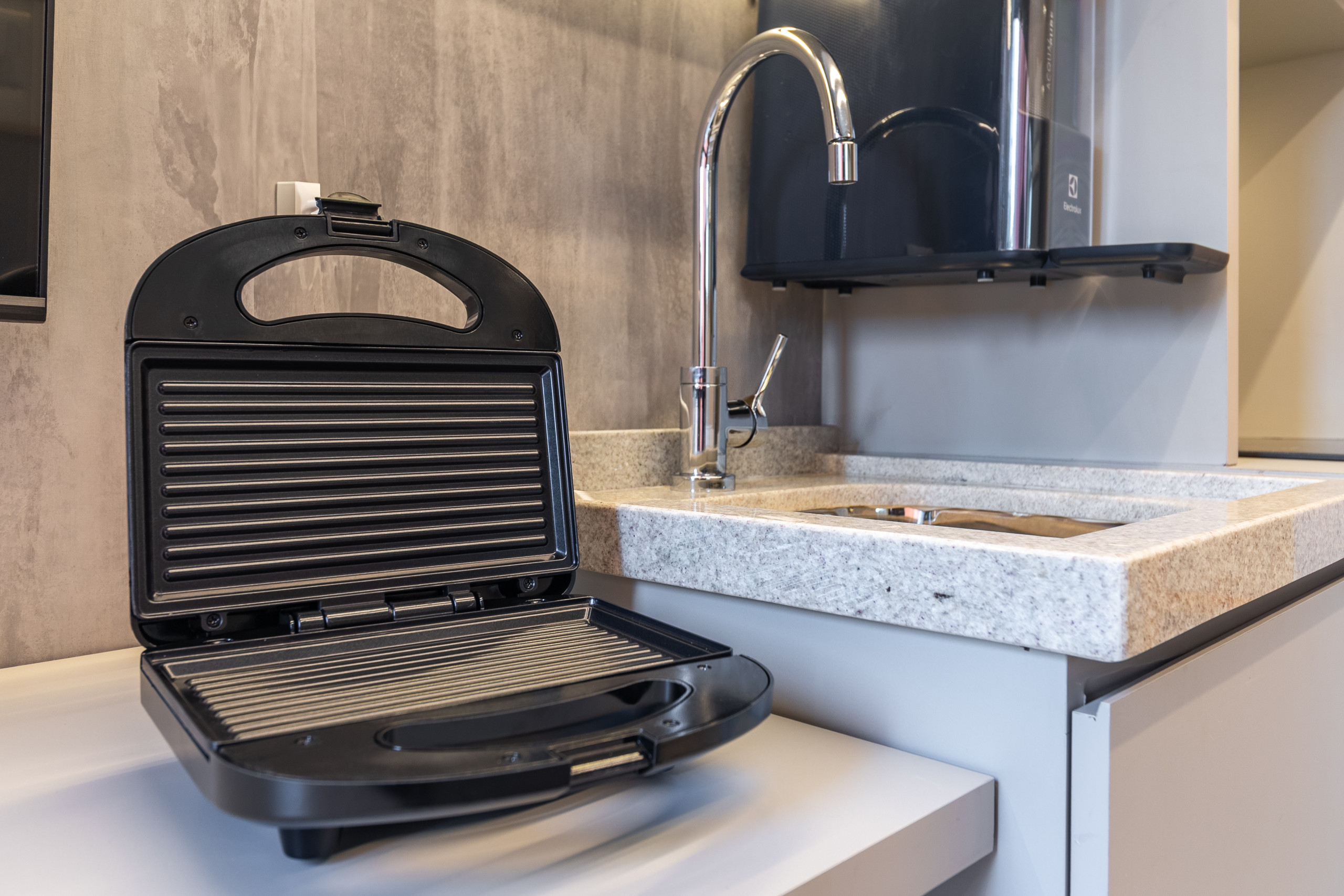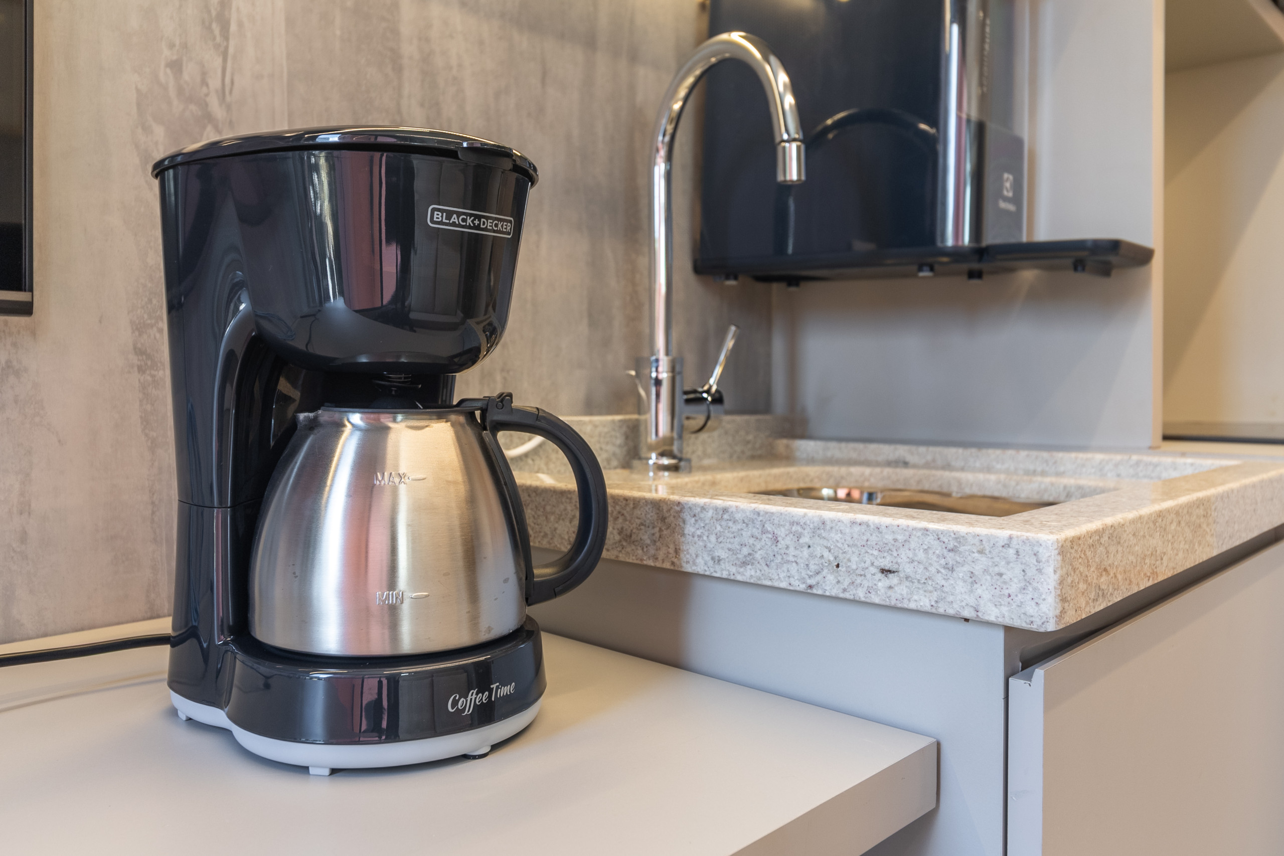 A cozinha americana, de indução, está equipada com geladeira, micro-ondas, congelador, louça/talheres, utensílios/cozinha, cafeteira e torradeira.