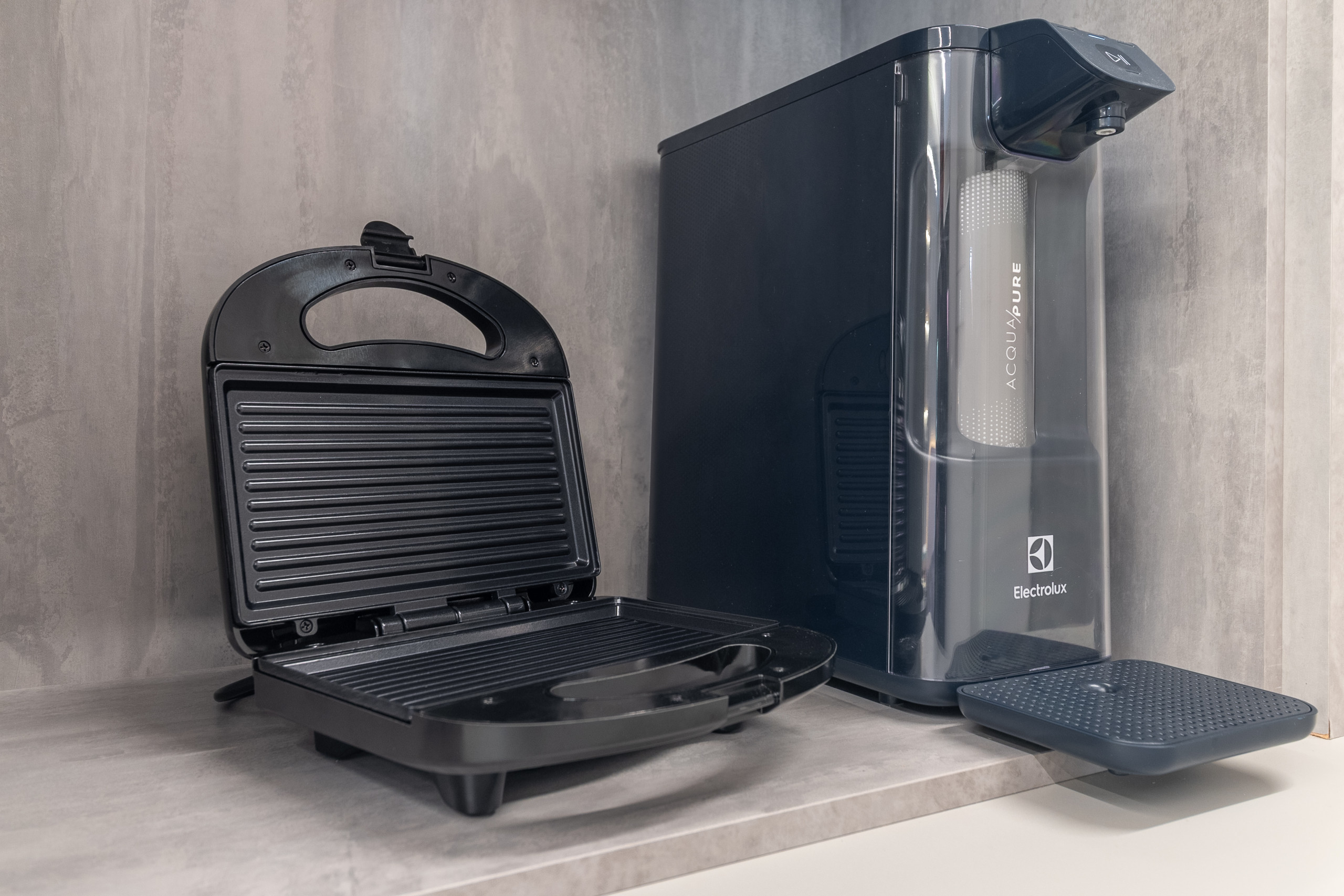 A cozinha americana, de indução, está equipada com geladeira, micro-ondas, congelador, louça/talheres, utensílios/cozinha, cafeteira e torradeira.
